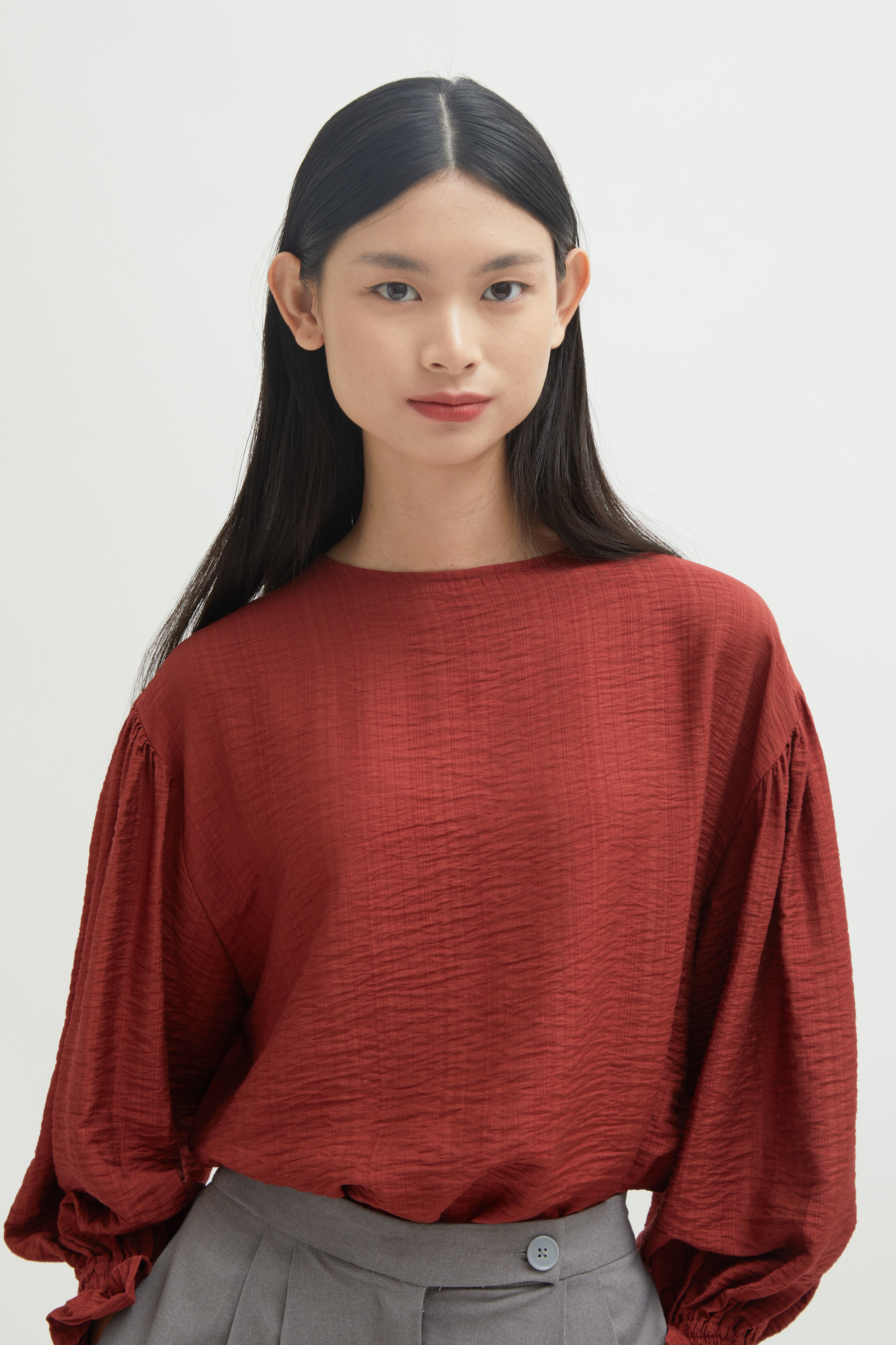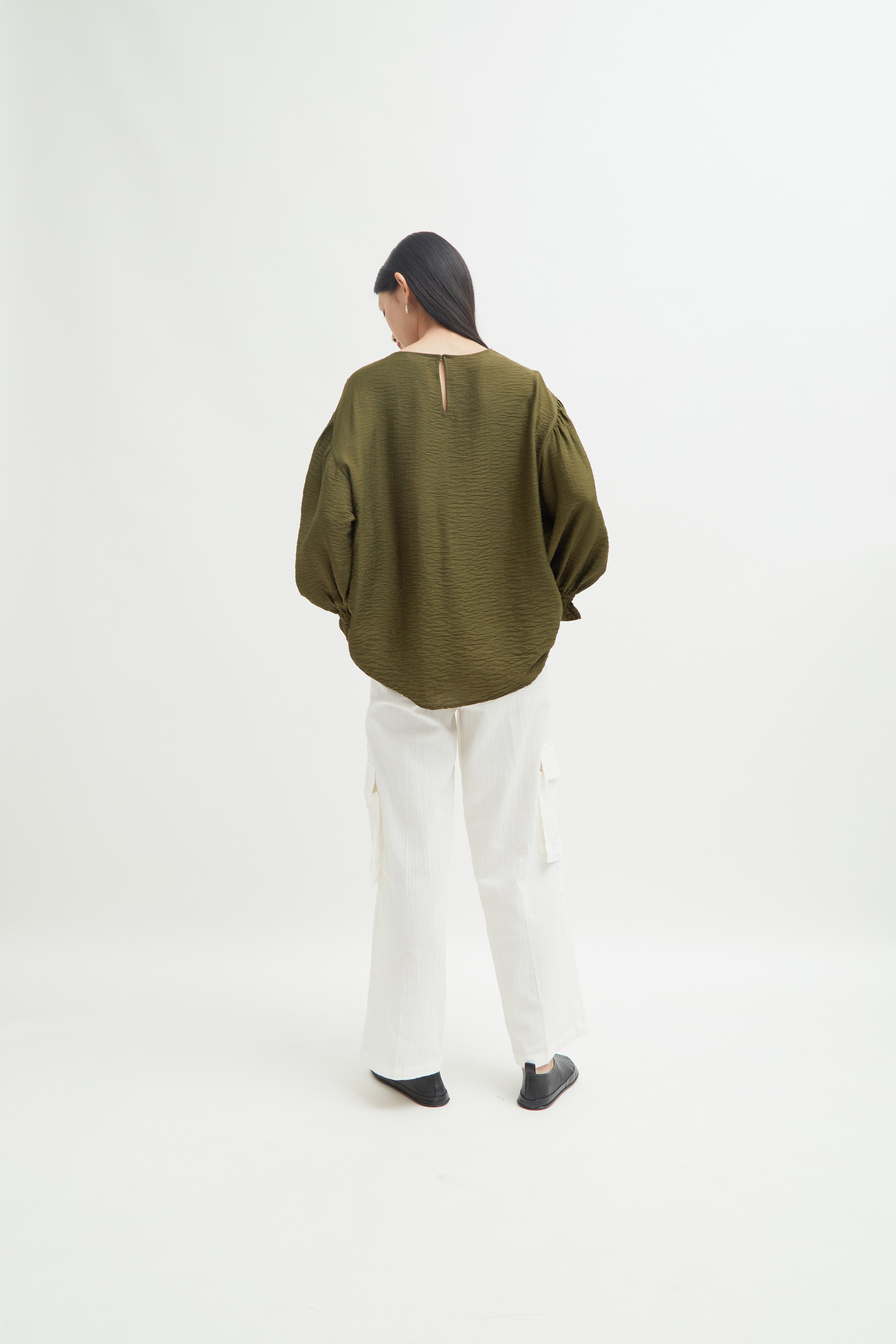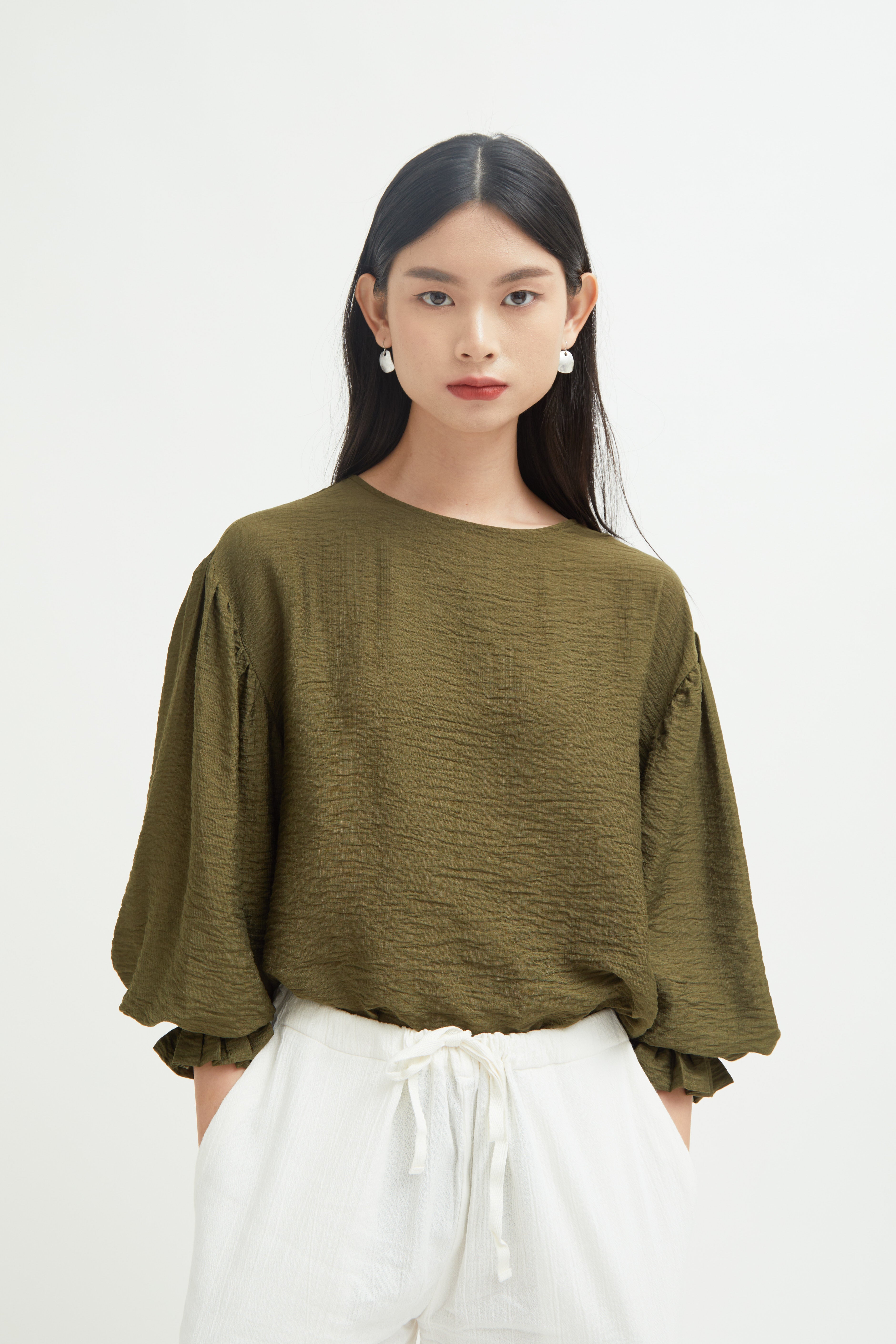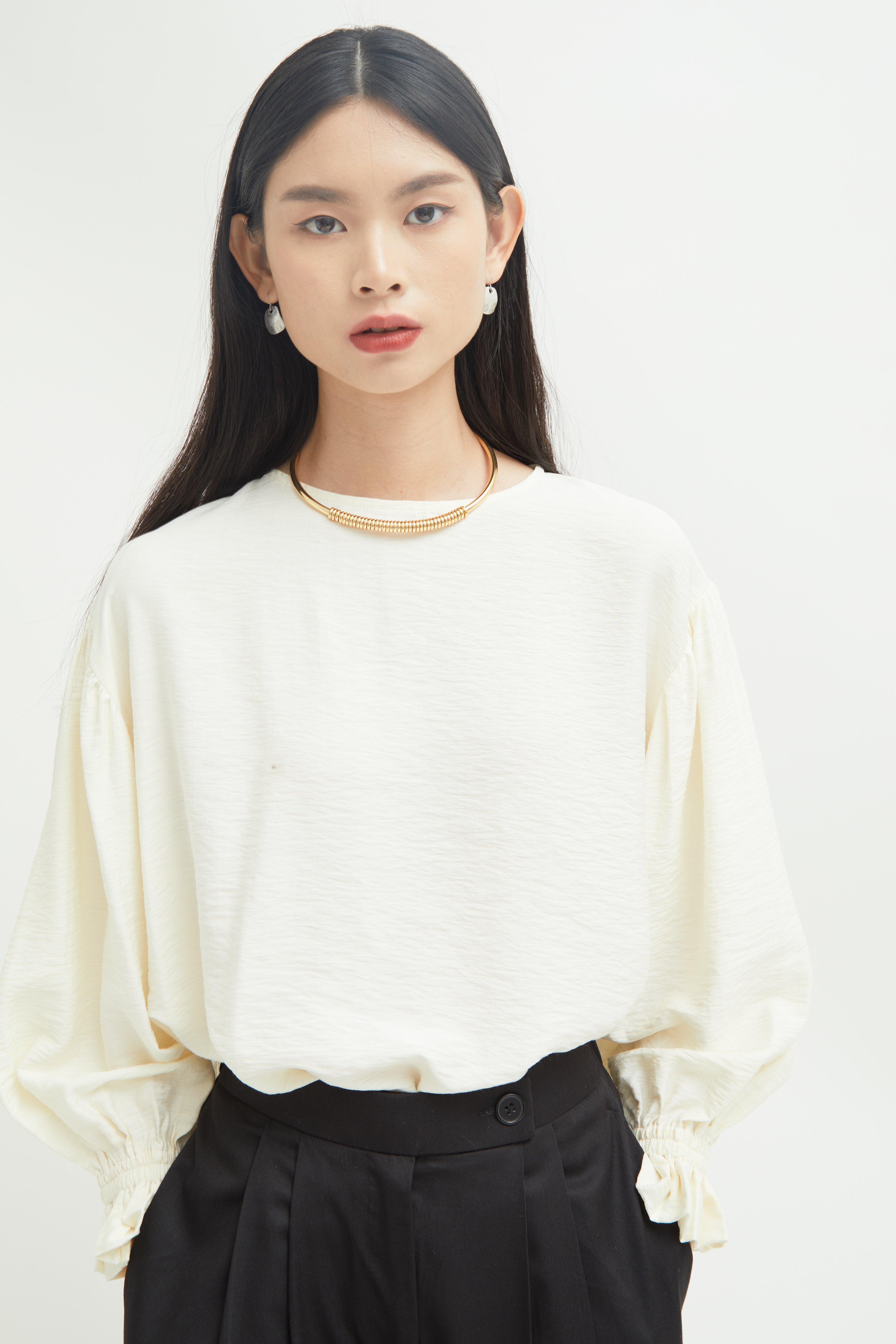 Blouse ini didesain dengan model cutting yang loose dan lengan balon, dengan bahan yang ringan dan halus, sehingga sangat nyaman saat dikenakan. Terdapat karet di bagian lengan dan kancing di bagian belakang.
