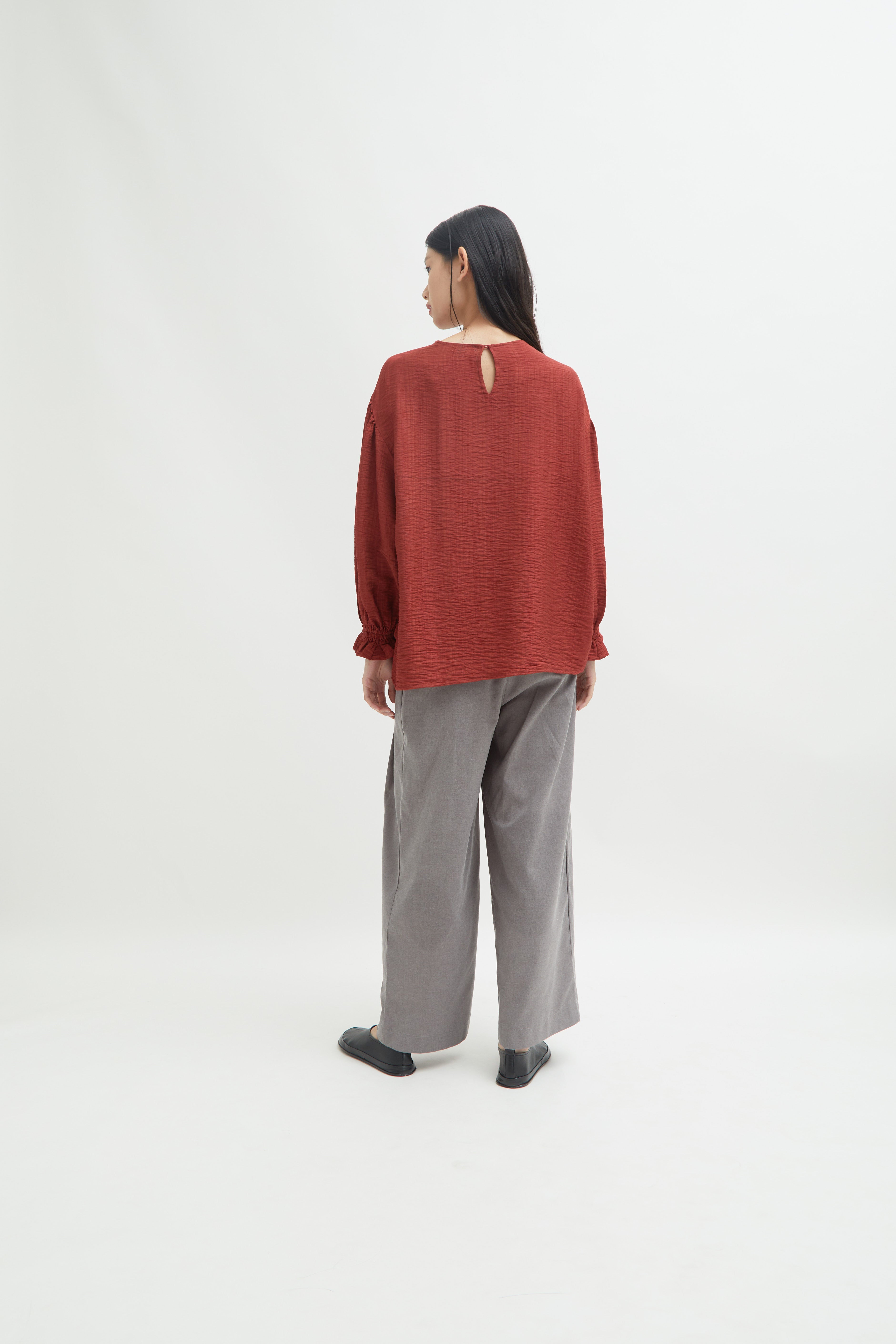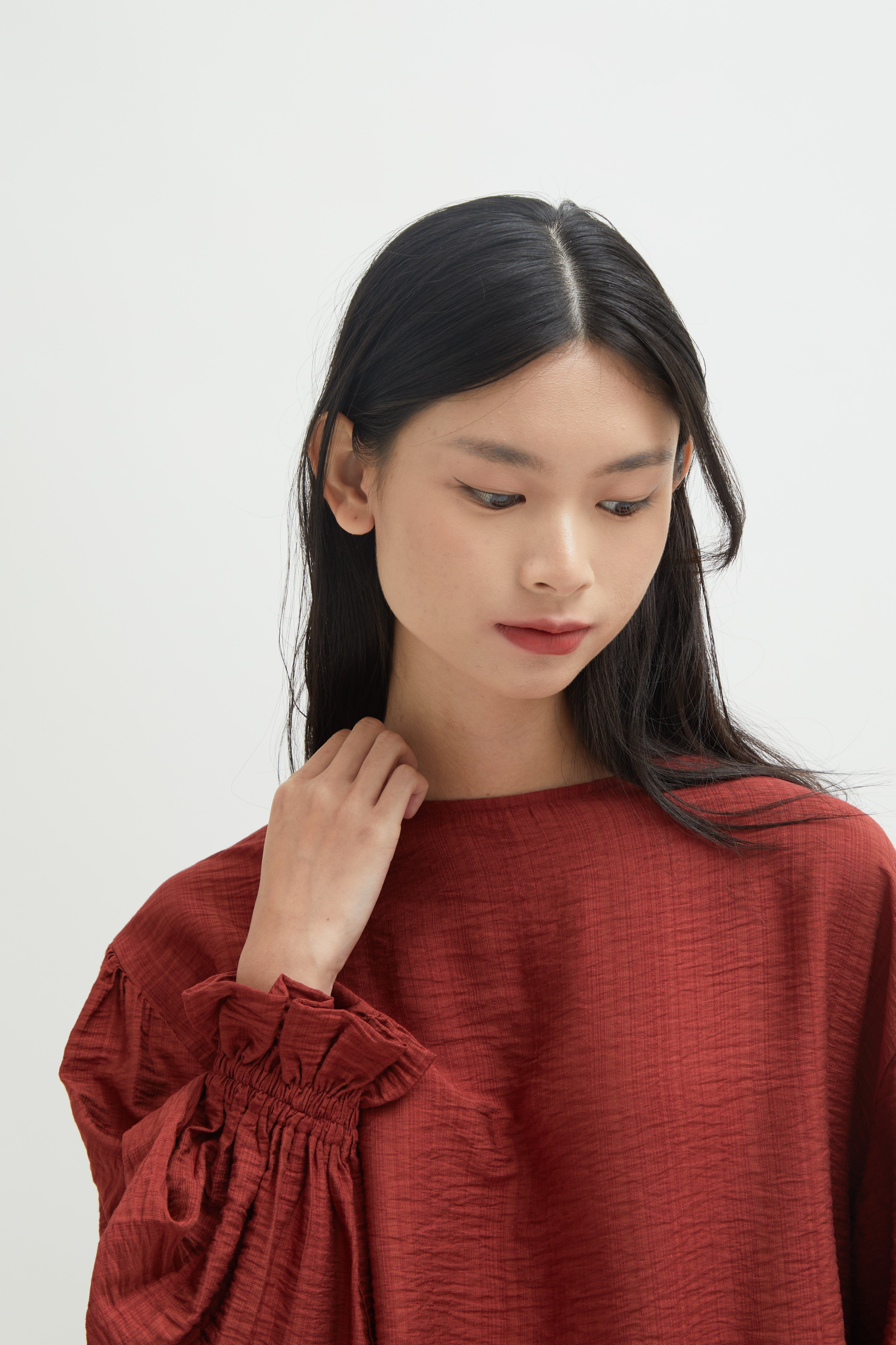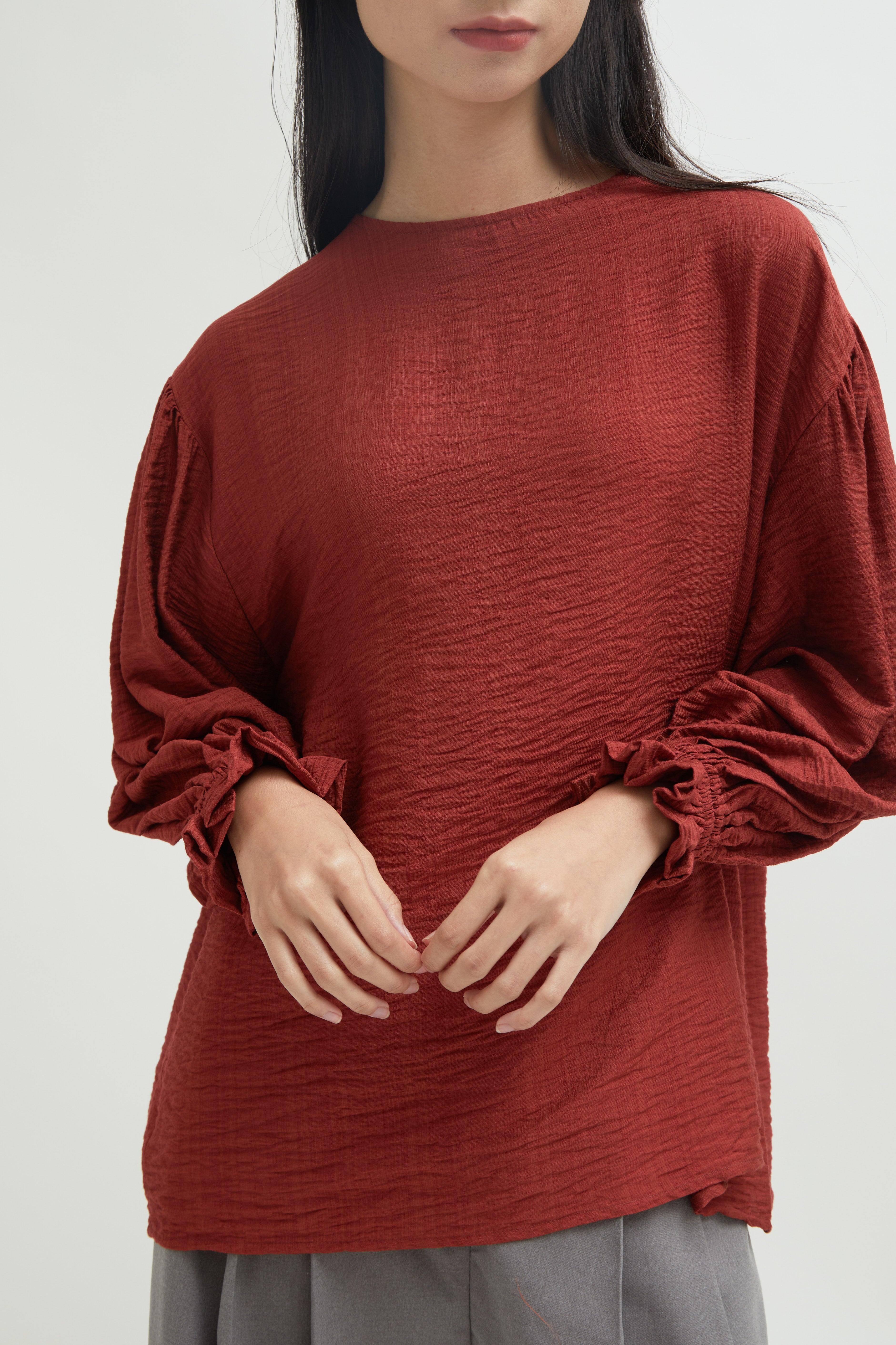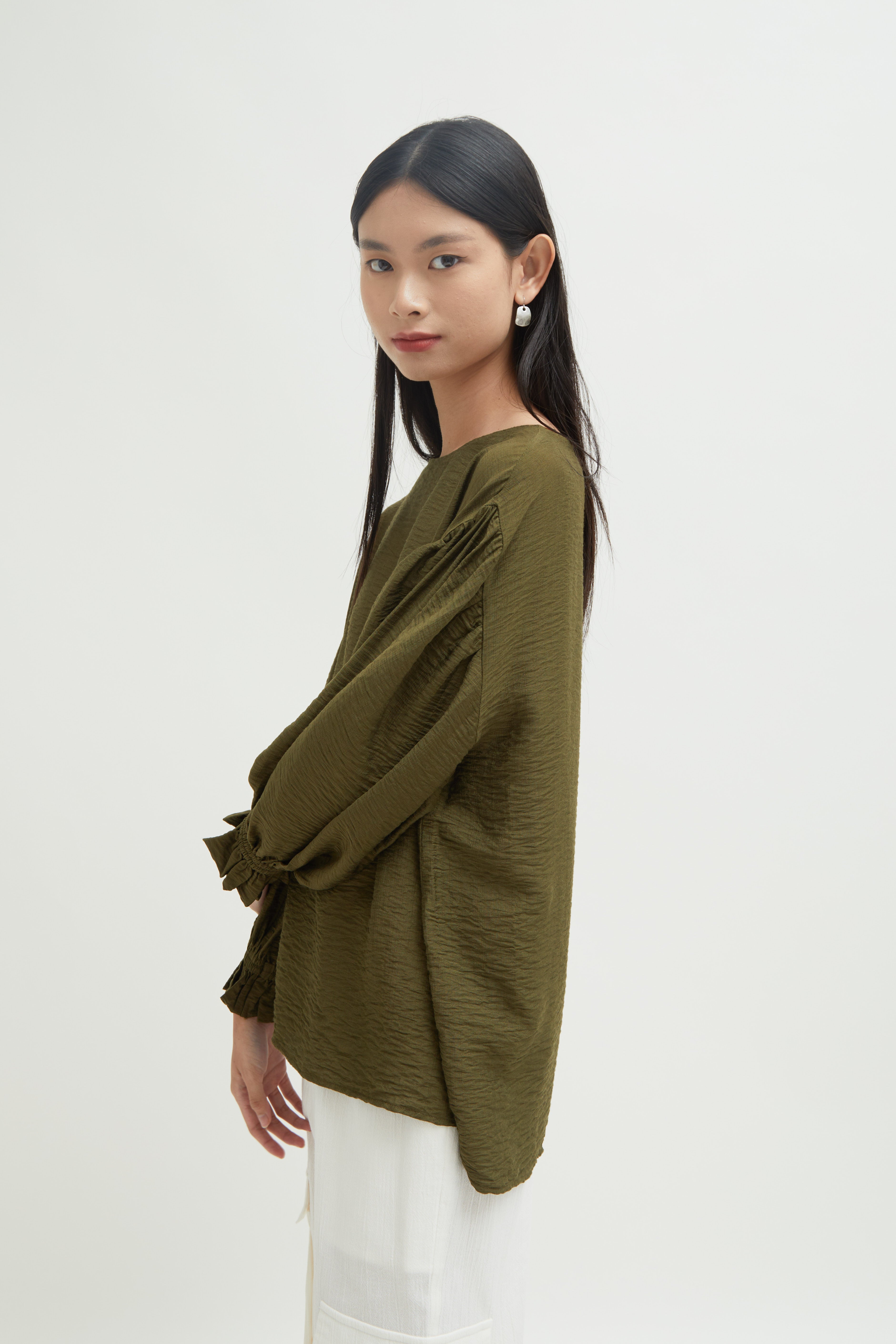 Blouse ini didesain dengan model cutting yang loose dan lengan balon, dengan bahan yang ringan dan halus, sehingga sangat nyaman saat dikenakan. Terdapat karet di bagian lengan dan kancing di bagian belakang.