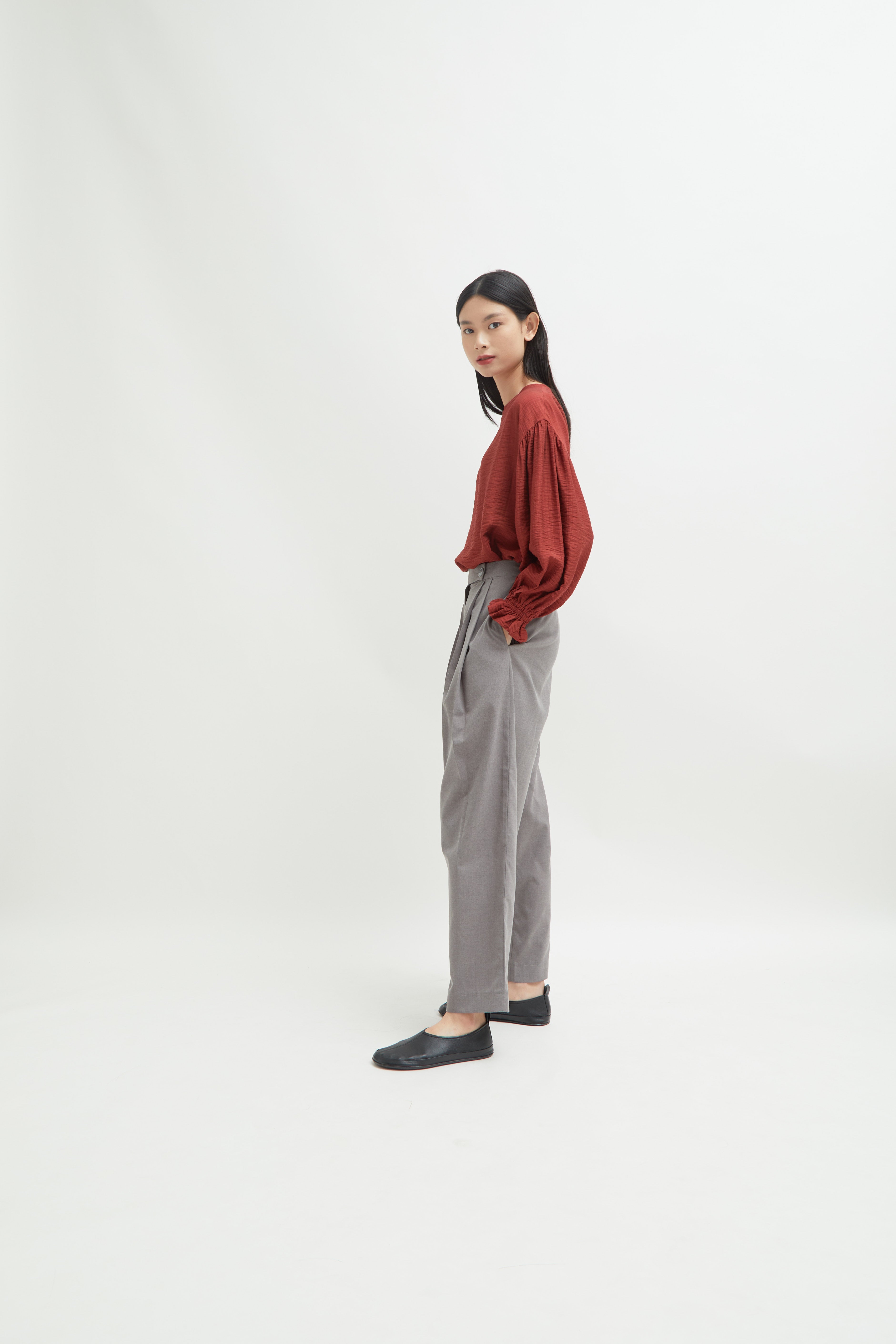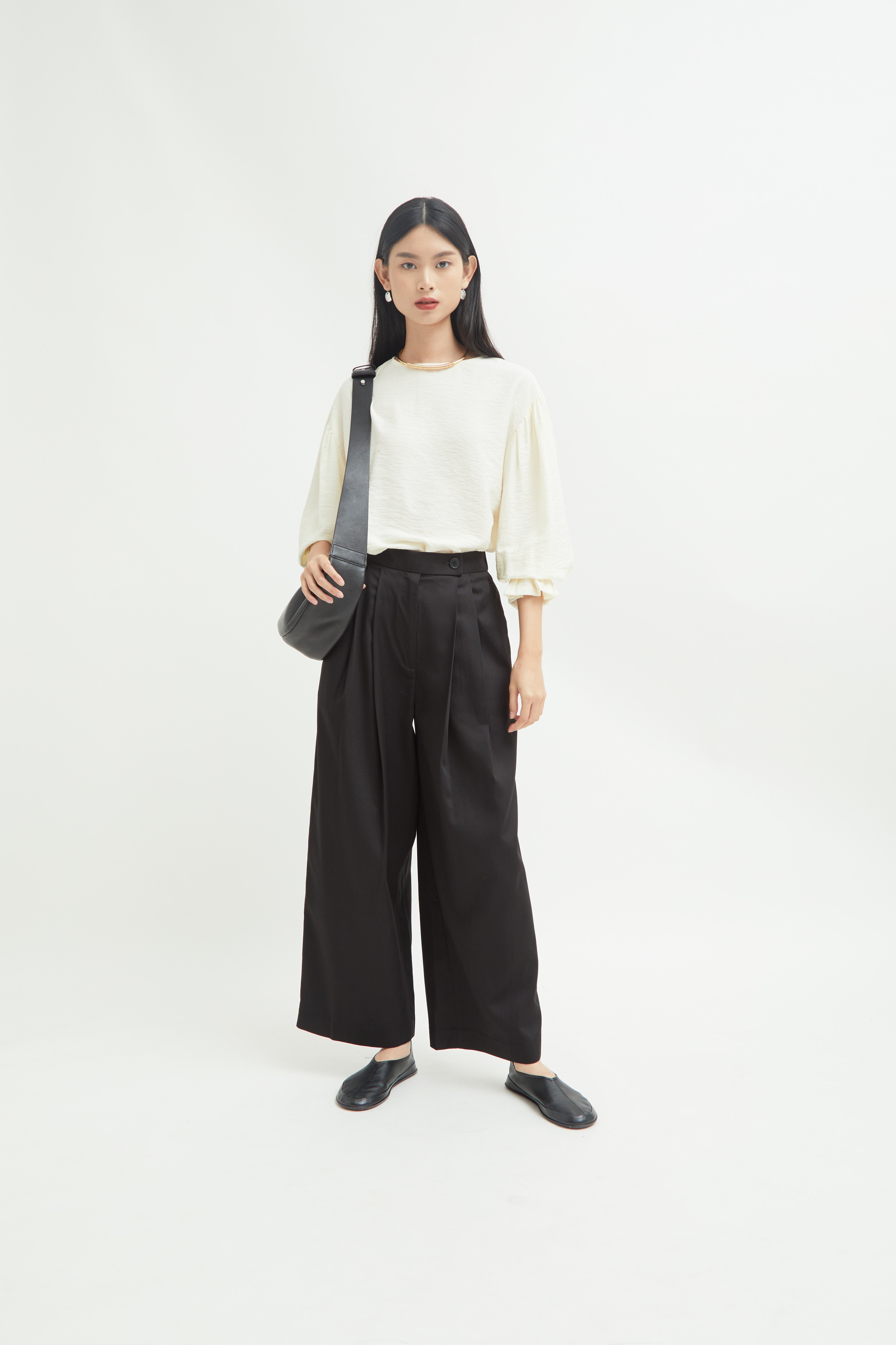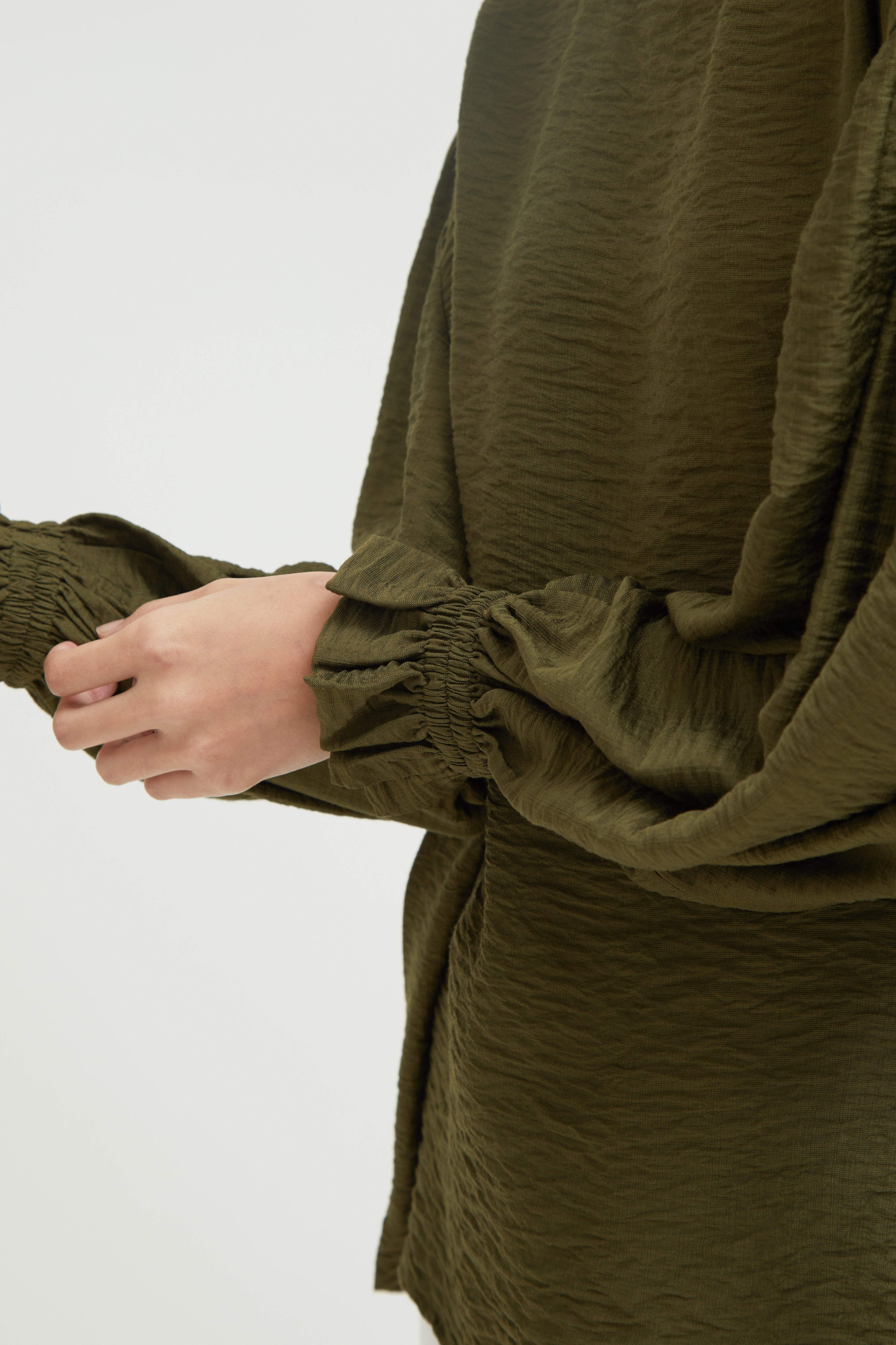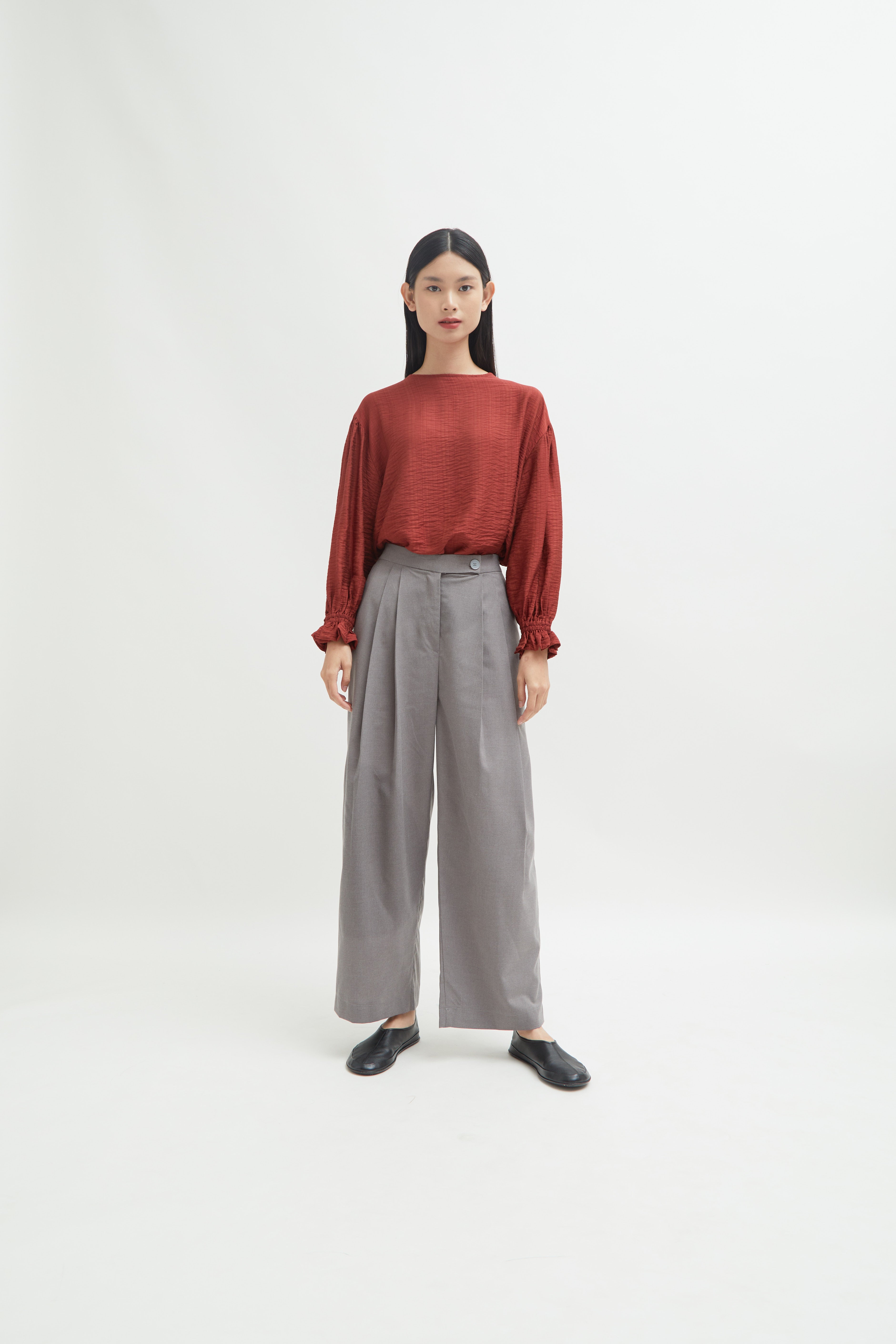 Blouse ini didesain dengan model cutting yang loose dan lengan balon, dengan bahan yang ringan dan halus, sehingga sangat nyaman saat dikenakan. Terdapat karet di bagian lengan dan kancing di bagian belakang.