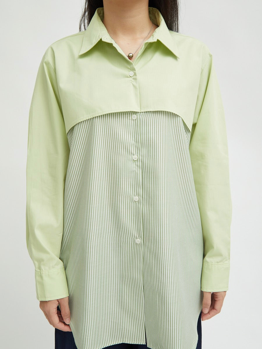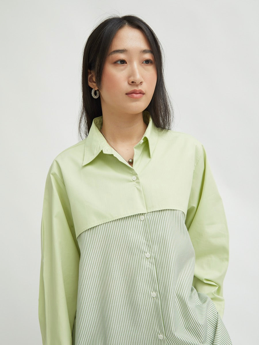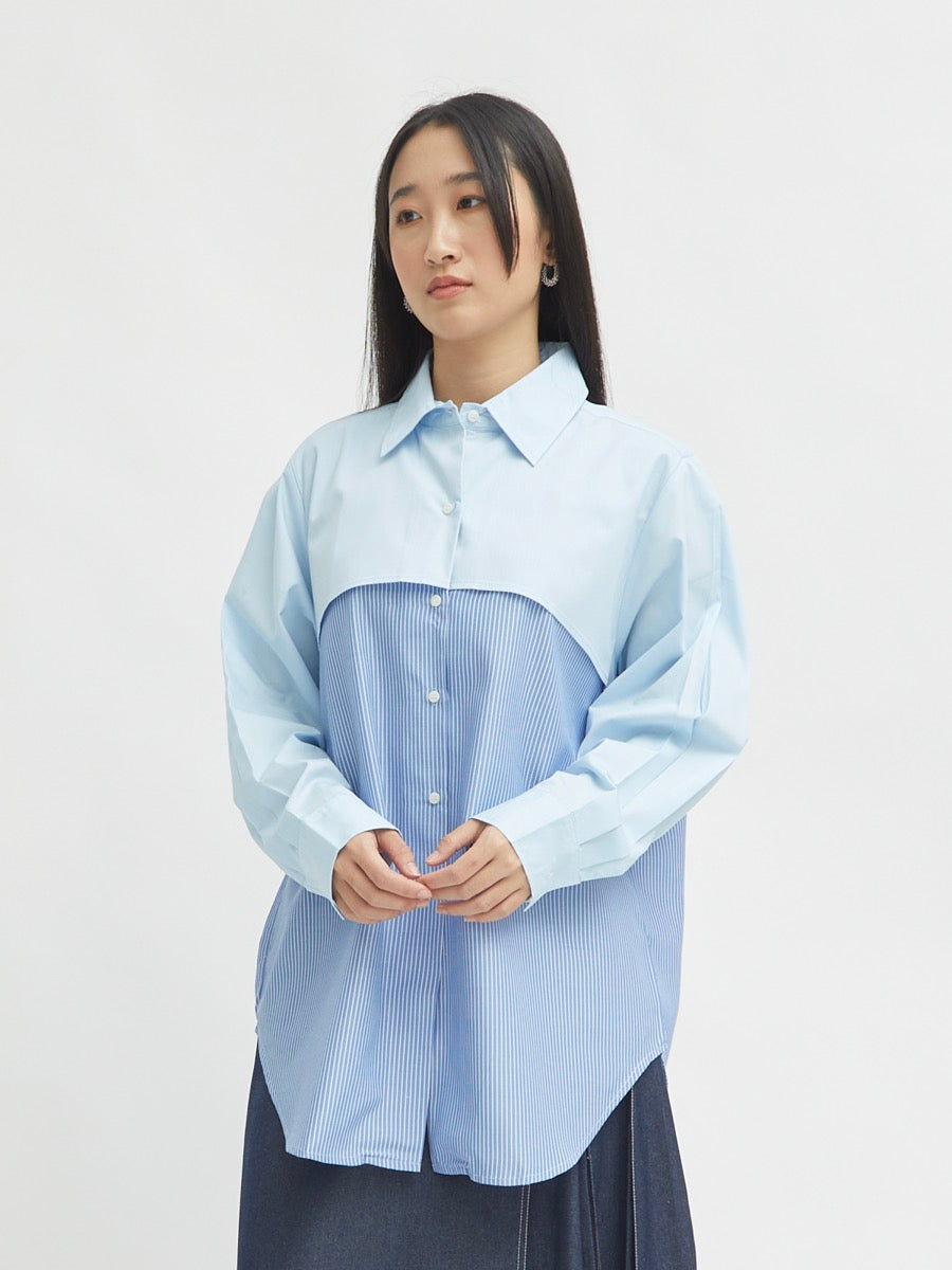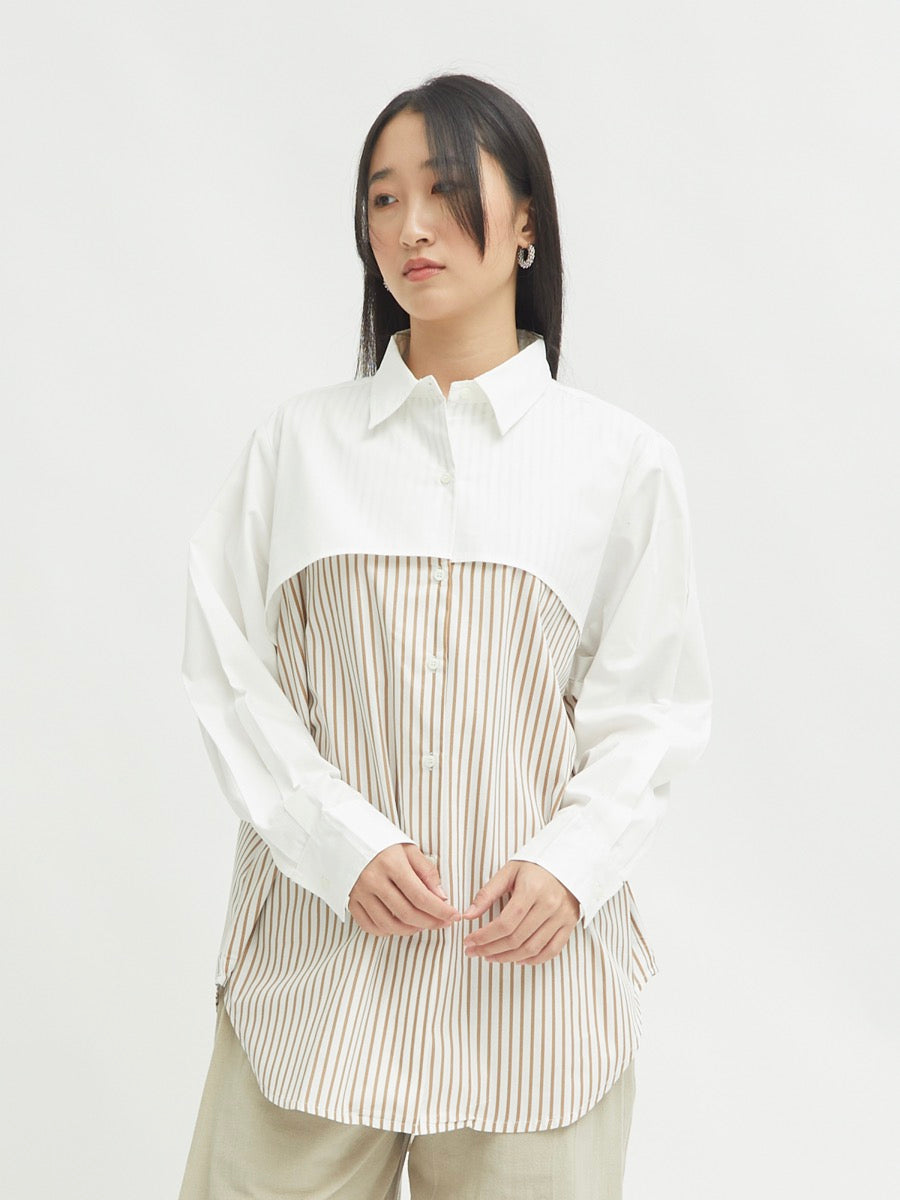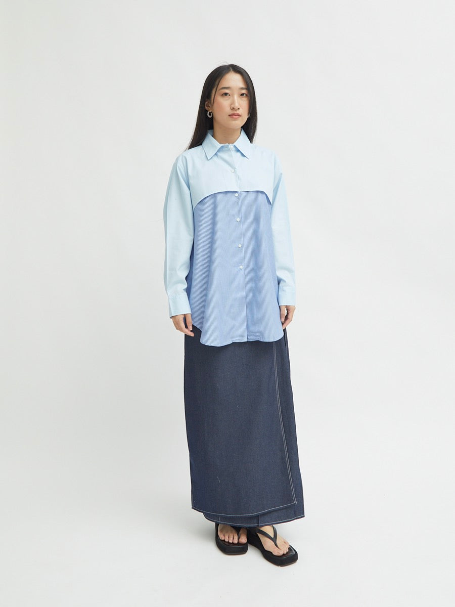 Kemeja wanita ini didesain dengan kerah kemeja dan full kancing depan. Memiliki kombinasi bahan yang berbeda sehingga memberikan kesan yang elegan. Cocok untuk tampilan kasual atau formal.