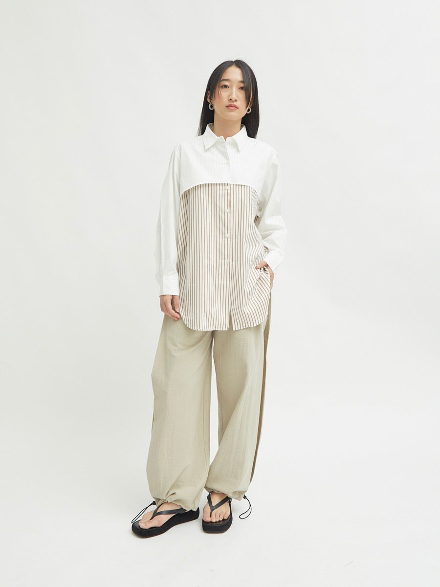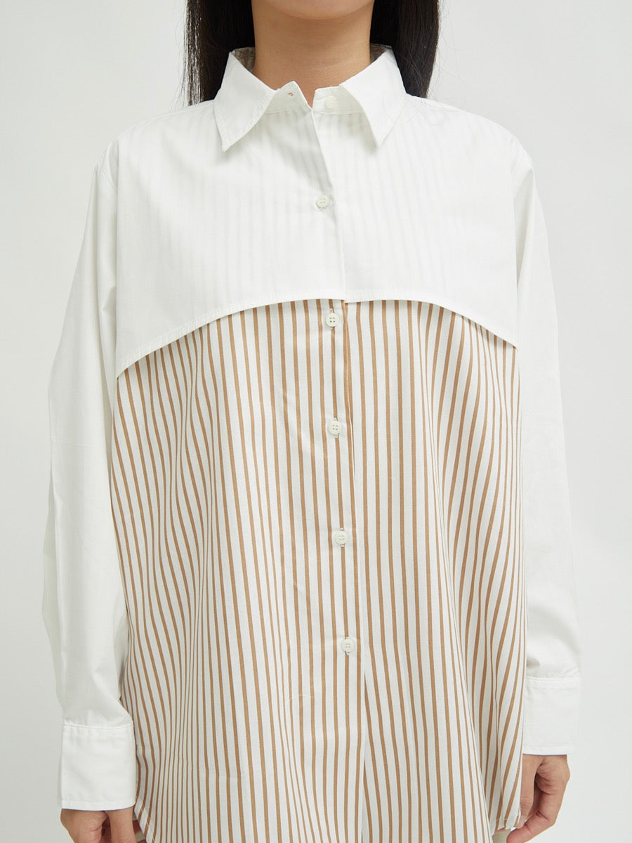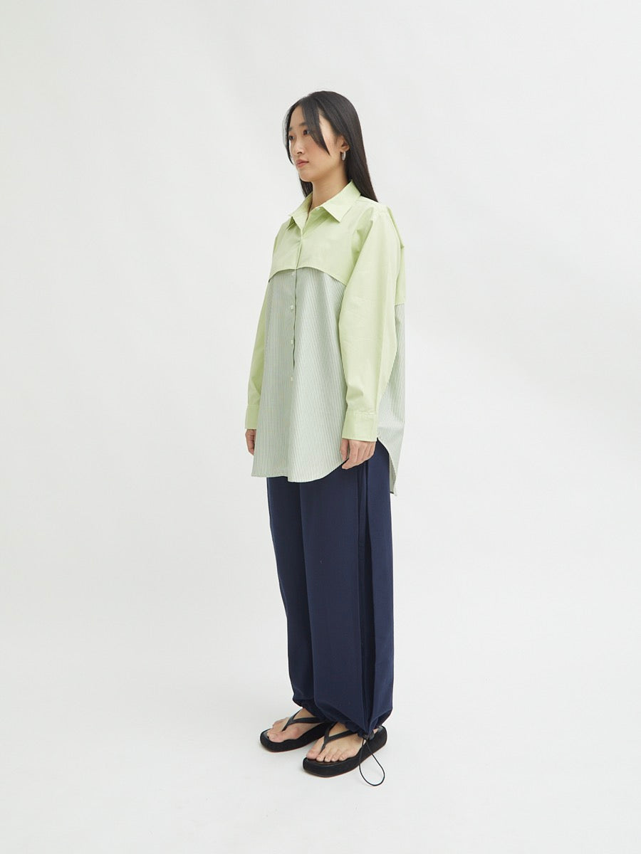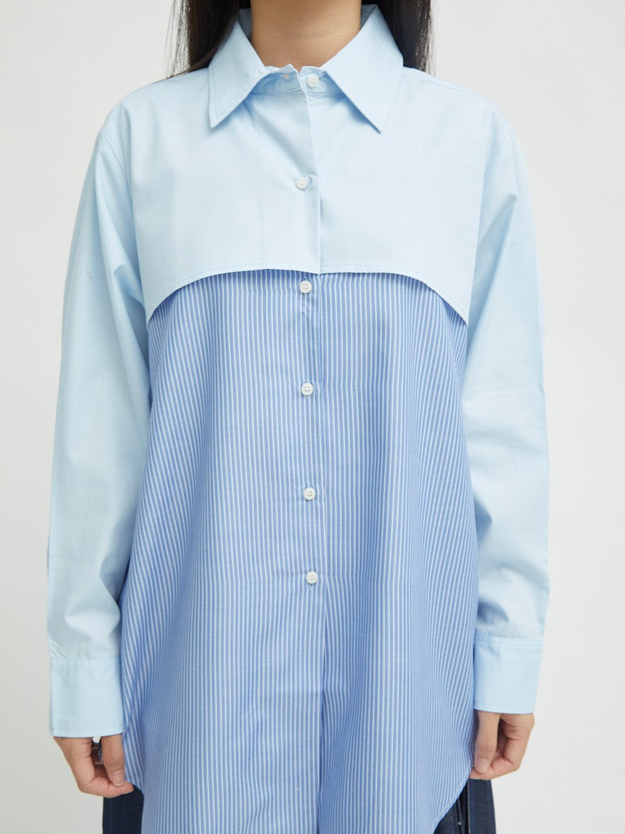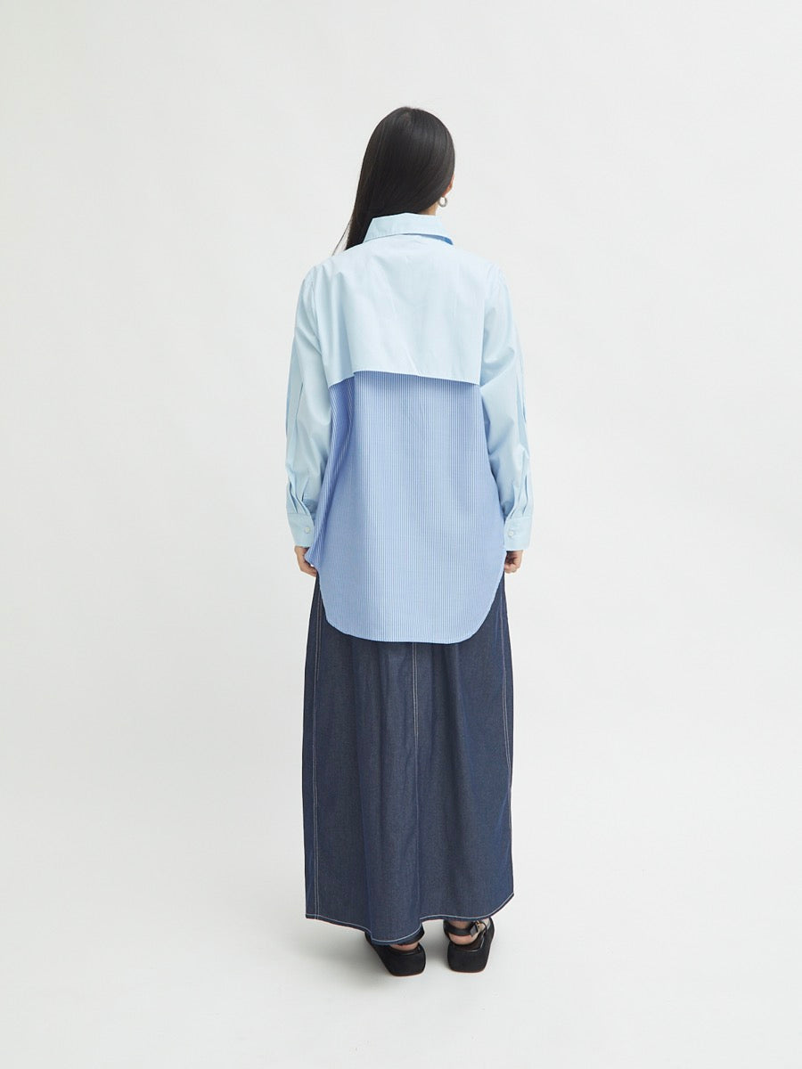Kemeja wanita ini didesain dengan kerah kemeja dan full kancing depan. Memiliki kombinasi bahan yang berbeda sehingga memberikan kesan yang elegan. Cocok untuk tampilan kasual atau formal.