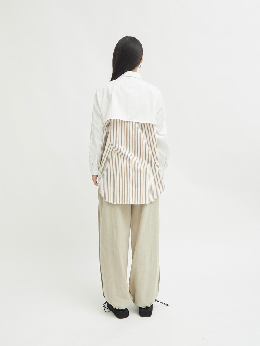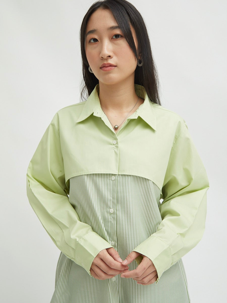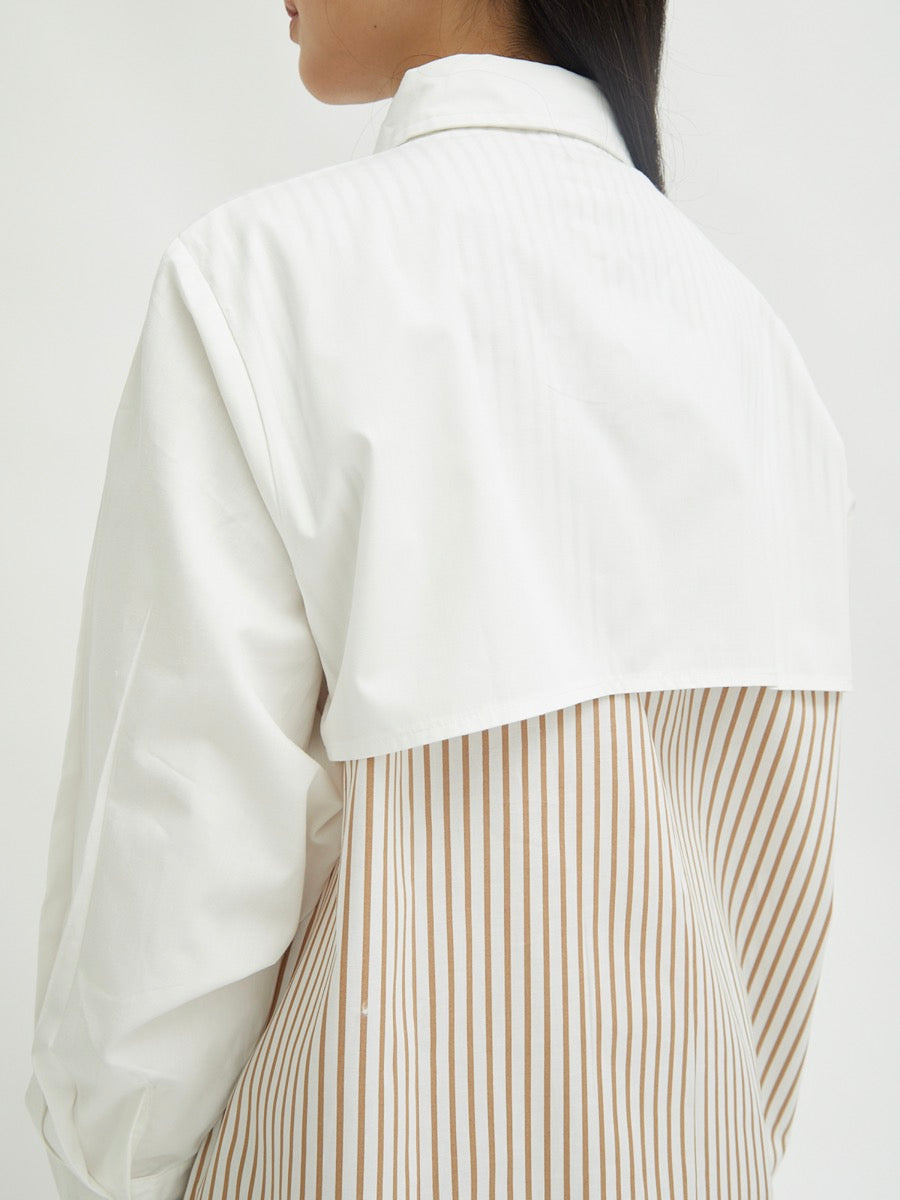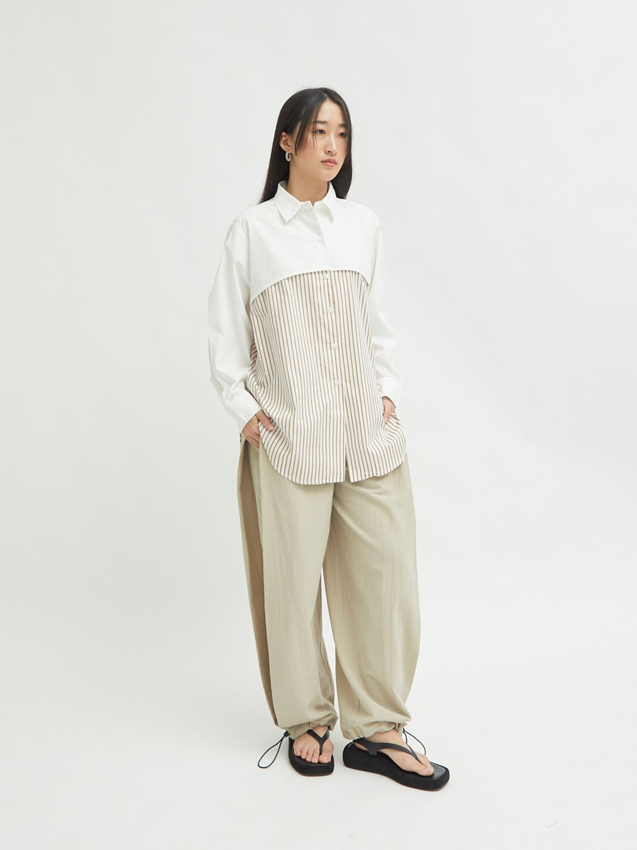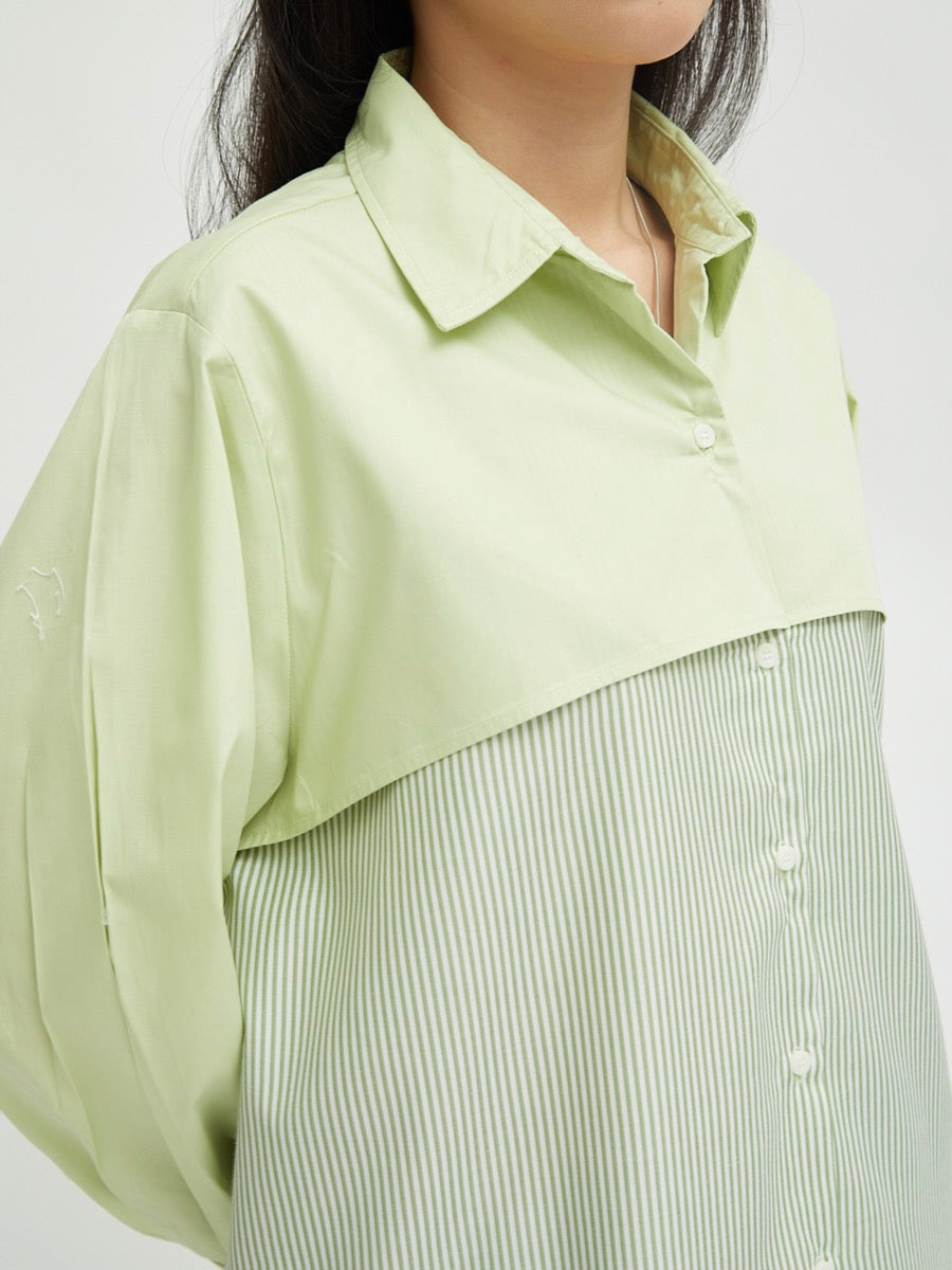 Kemeja wanita ini didesain dengan kerah kemeja dan full kancing depan. Memiliki kombinasi bahan yang berbeda sehingga memberikan kesan yang elegan. Cocok untuk tampilan kasual atau formal.