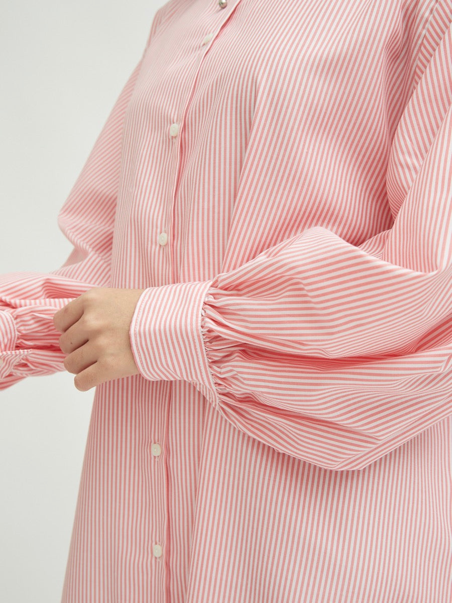 Dress wanita lengan panjang ini didesain dengan siluet maxi dan full kancing di bagian depan. Memiliki kerah bulat dengan motif stripe. Terdapat aksen balloon sleeves sehingga menciptakan look yang elegan. Cocok dikenakan untuk acara formal maupun non formal dan juga dapat dikenakan sebagai outer.