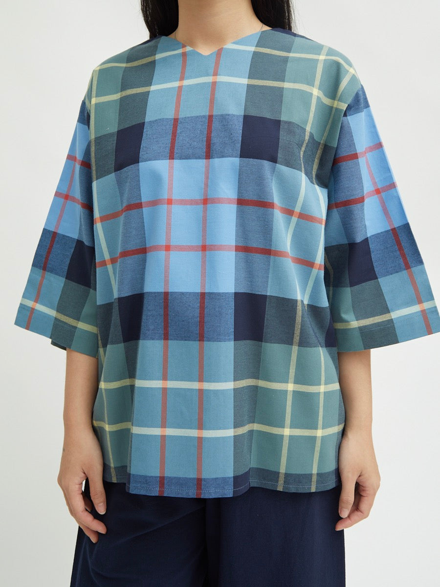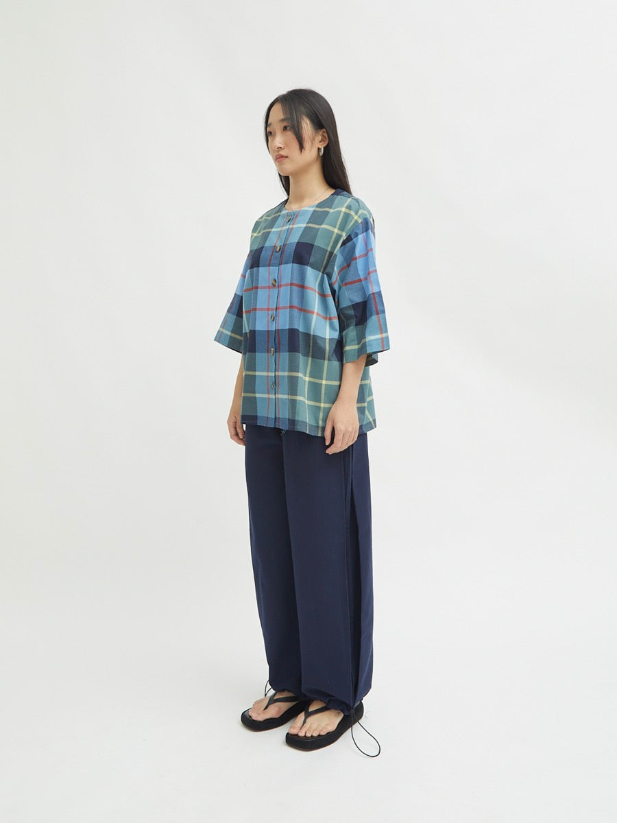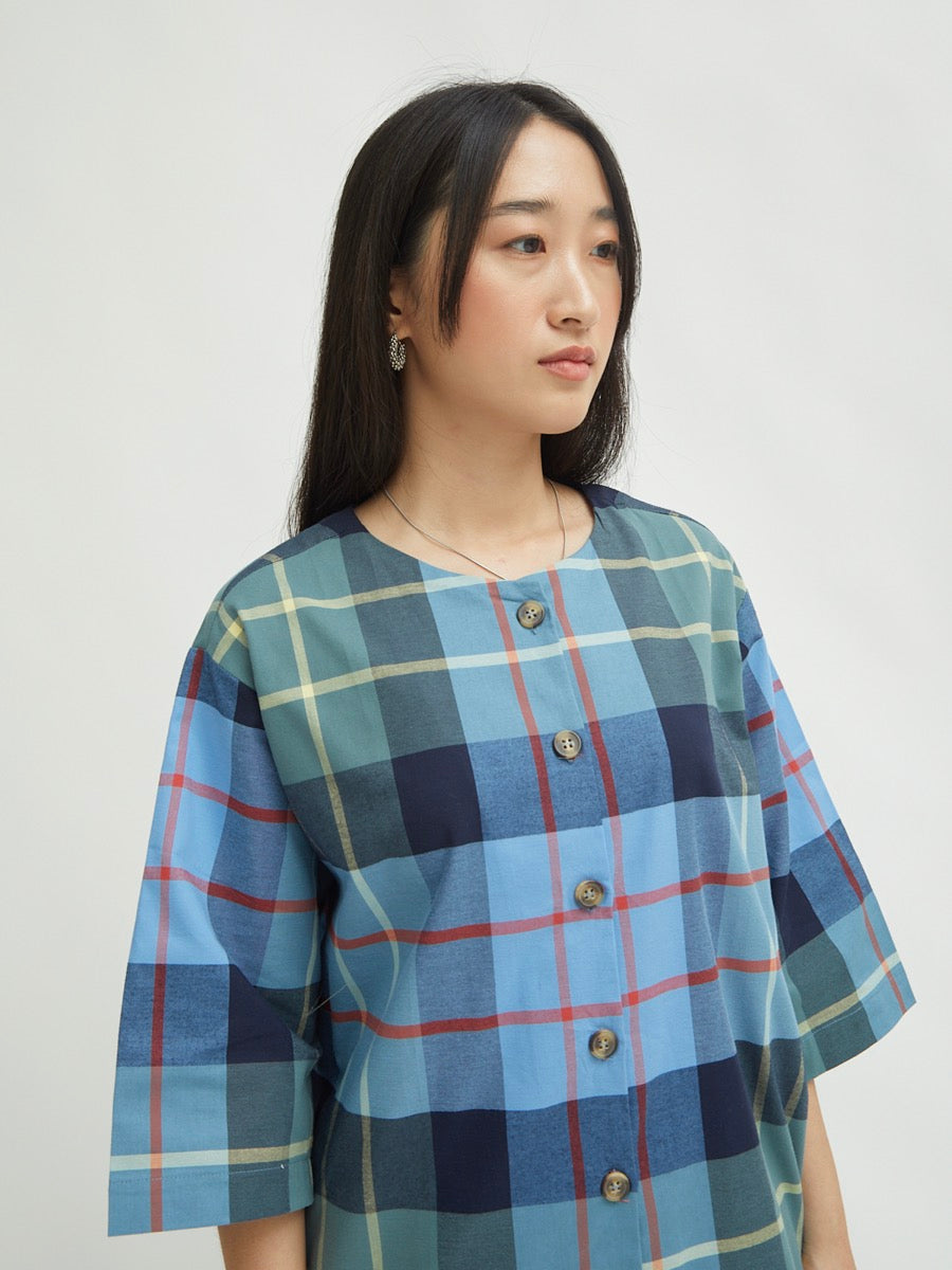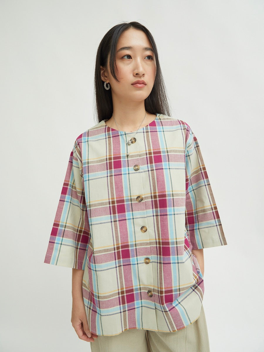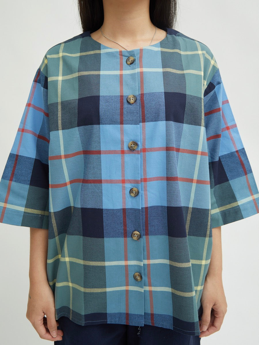 Atasan wanita ini didesain kerah v-neck dan cuttingan boxy. Atasan ini dapat dipakai bolak balik sehingga memberikan kesan yang elegan. Satu sisi terdapat full kancing dan satu sisi lain polos. Cocok untuk dipakai acara formal maupun non formal.