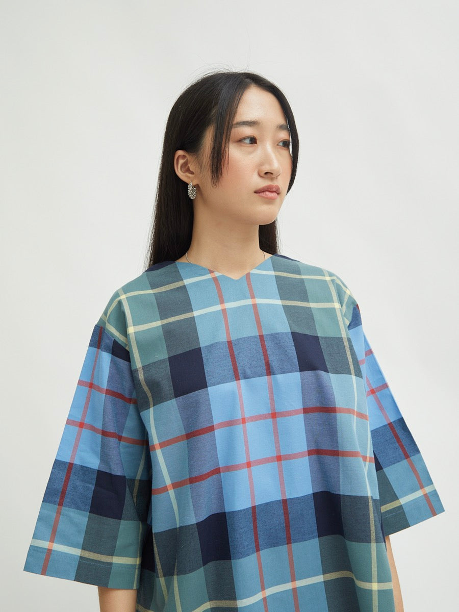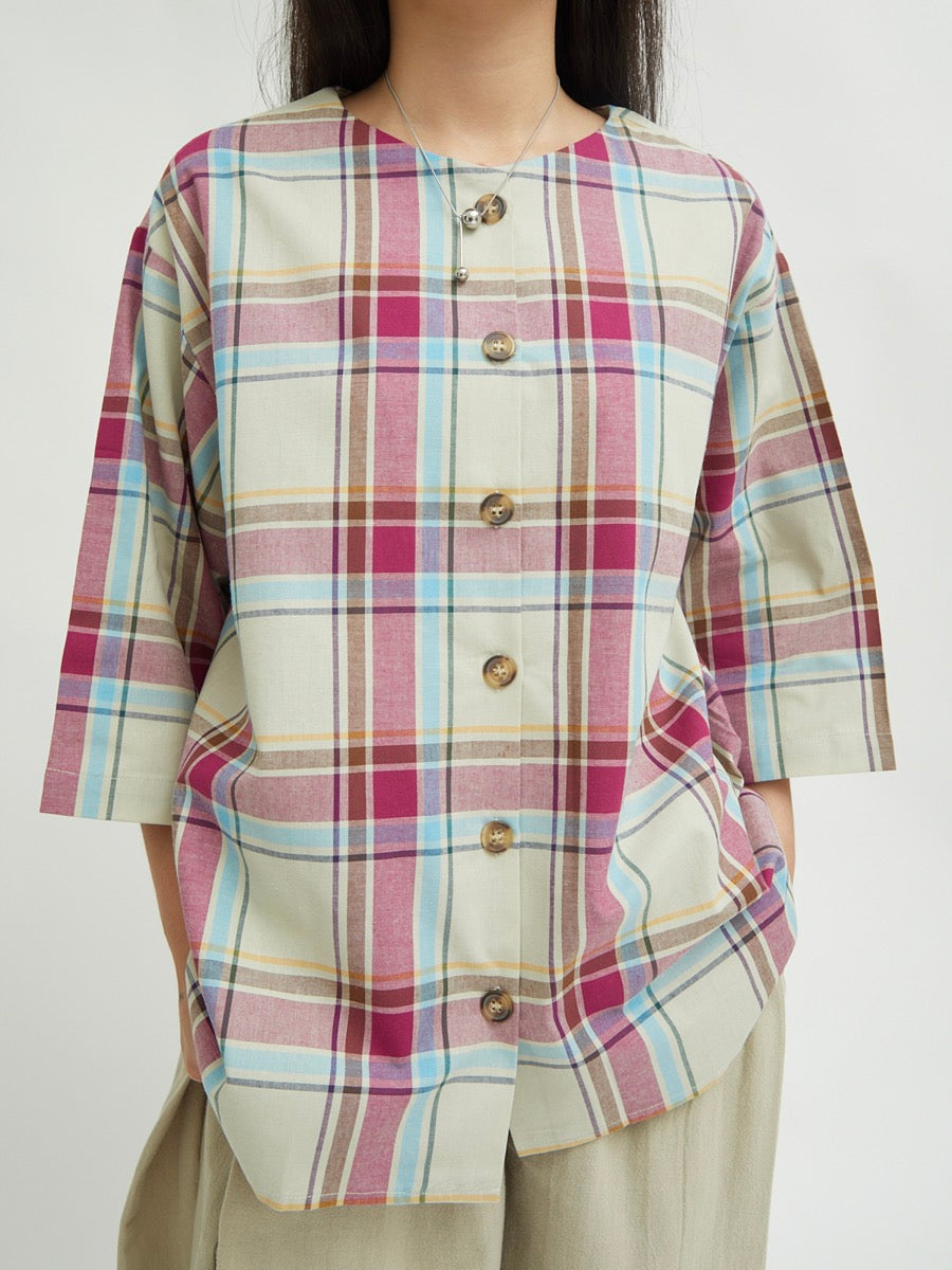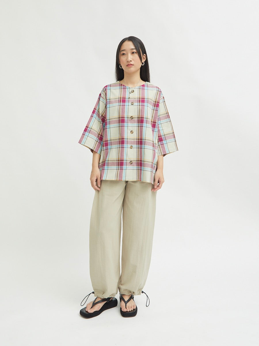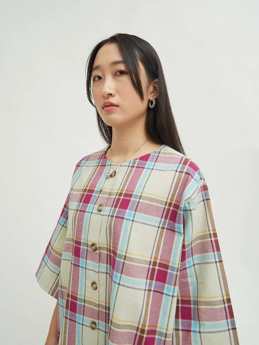 Atasan wanita ini didesain kerah v-neck dan cuttingan boxy. Atasan ini dapat dipakai bolak balik sehingga memberikan kesan yang elegan. Satu sisi terdapat full kancing dan satu sisi lain polos. Cocok untuk dipakai acara formal maupun non formal.