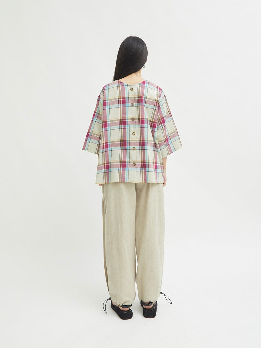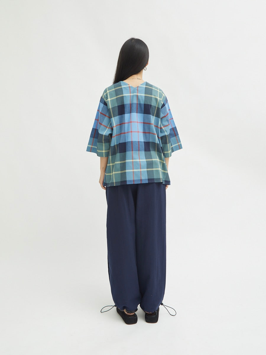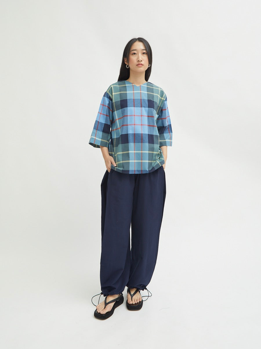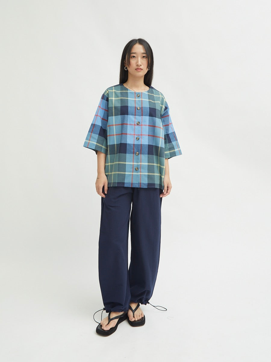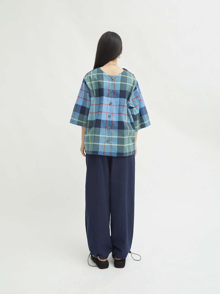 Atasan wanita ini didesain kerah v-neck dan cuttingan boxy. Atasan ini dapat dipakai bolak balik sehingga memberikan kesan yang elegan. Satu sisi terdapat full kancing dan satu sisi lain polos. Cocok untuk dipakai acara formal maupun non formal.