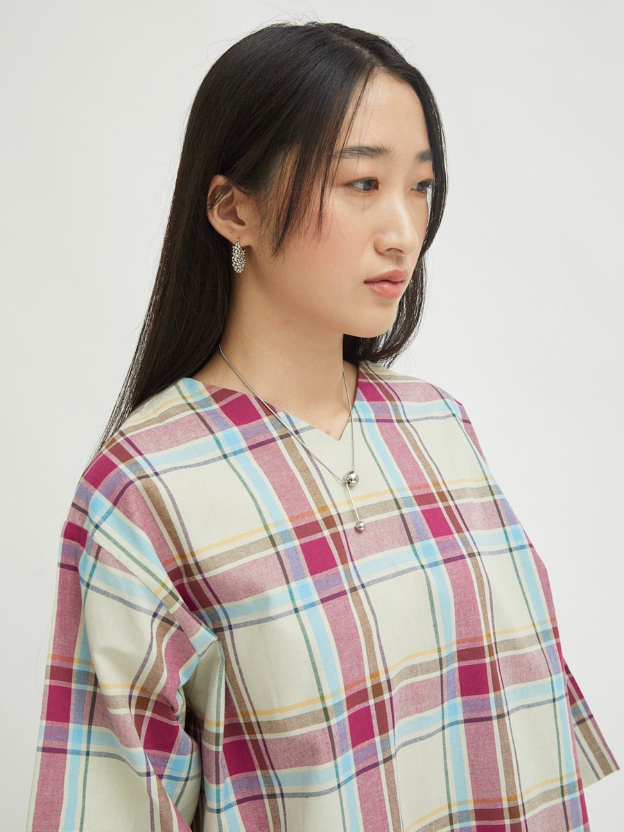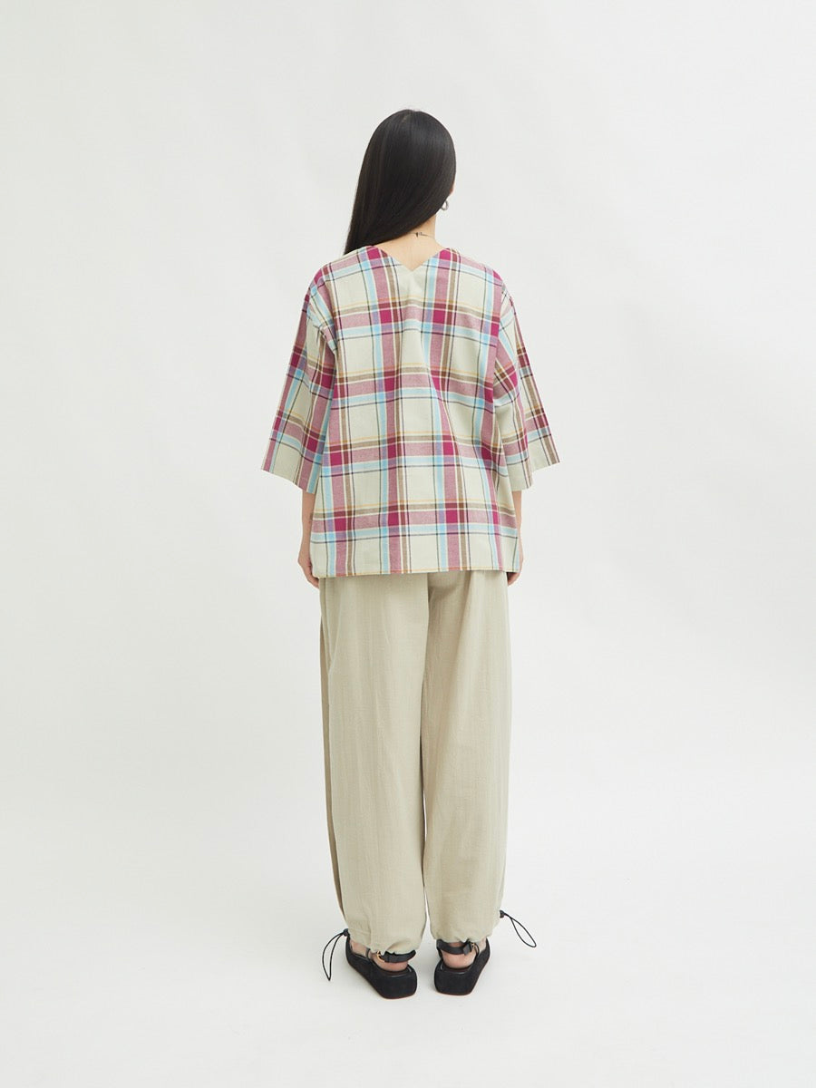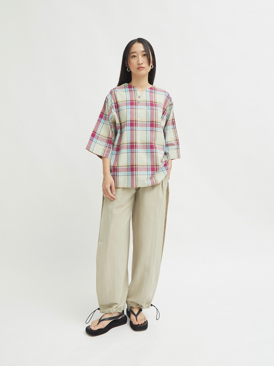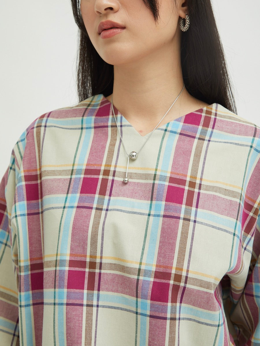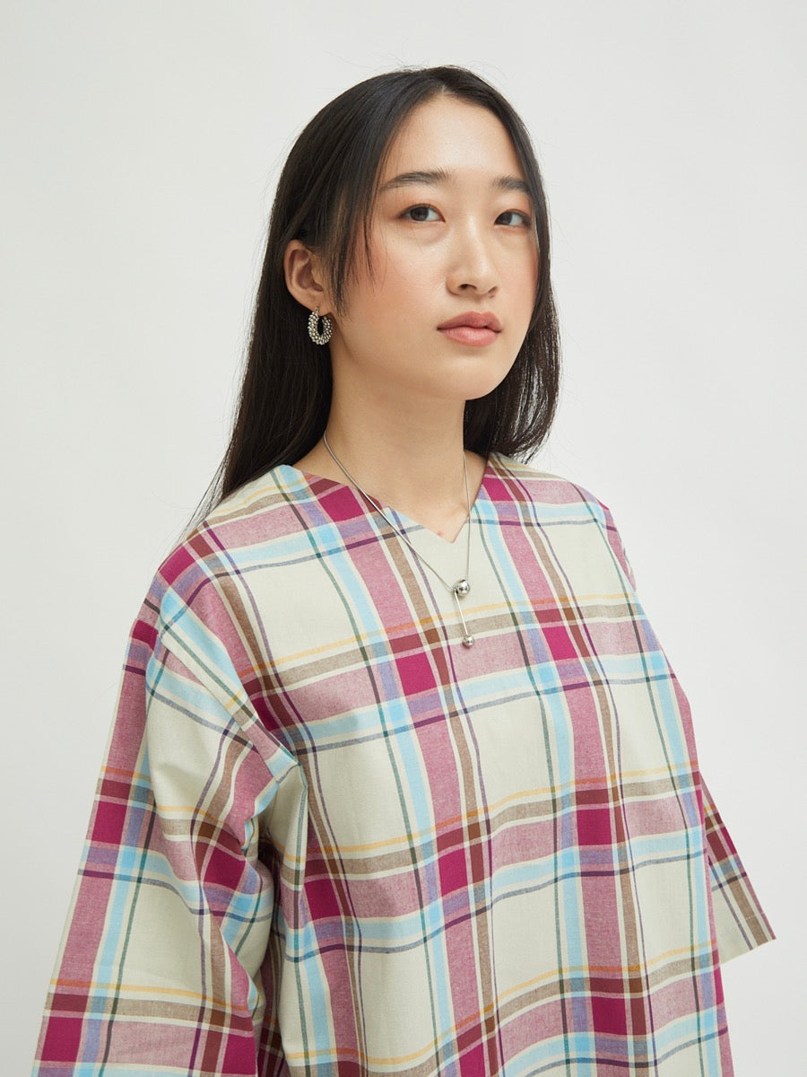 Atasan wanita ini didesain kerah v-neck dan cuttingan boxy. Atasan ini dapat dipakai bolak balik sehingga memberikan kesan yang elegan. Satu sisi terdapat full kancing dan satu sisi lain polos. Cocok untuk dipakai acara formal maupun non formal.