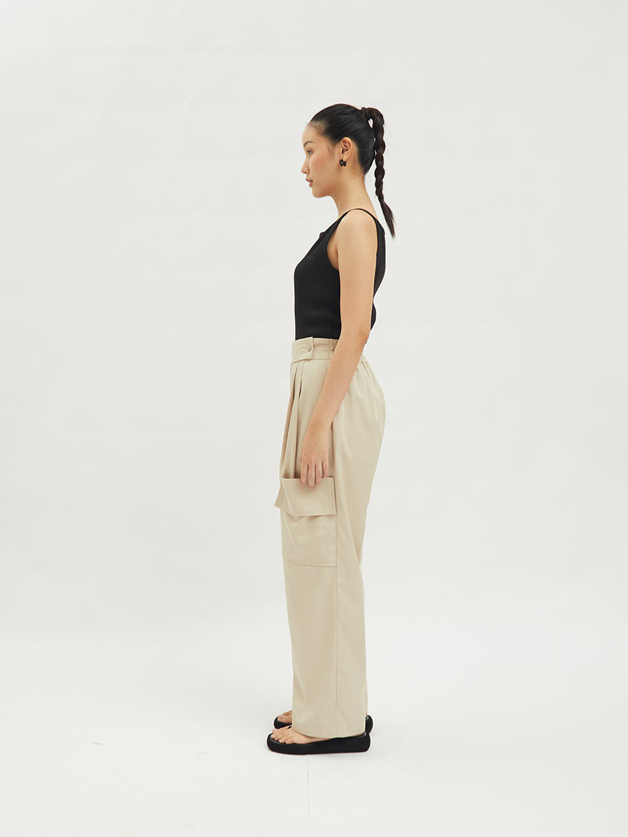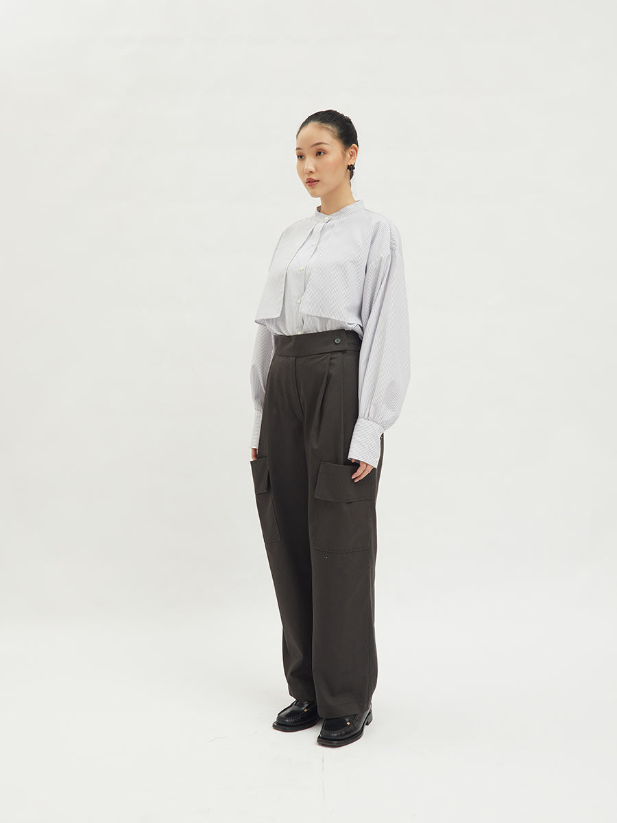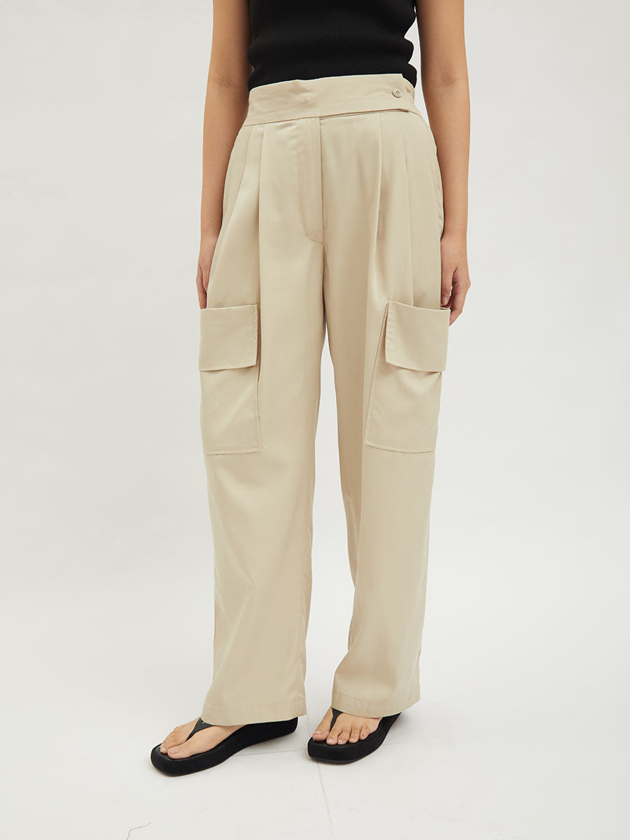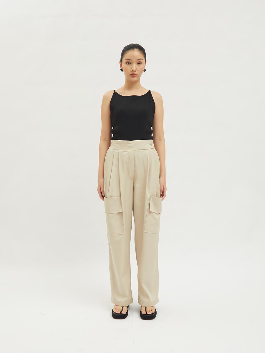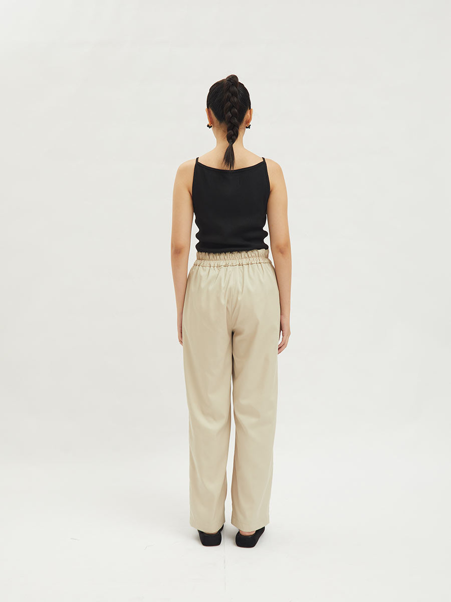 Celana panjang wanita ini terbuat dari bahan Cotton Drill. Didesain dengan siluet yang lebar. Terdapat karet di bagian pinggang yang dapat disesuaikan dan dua saku di sisi samping celana. Memiliki penutup kancing menyerupai ban pinggang untuk menambah kesan feminim. Cocok dikenakan untuk acara formal maupun non formal, sangat nyaman untuk dikenakan sehari-hari.
