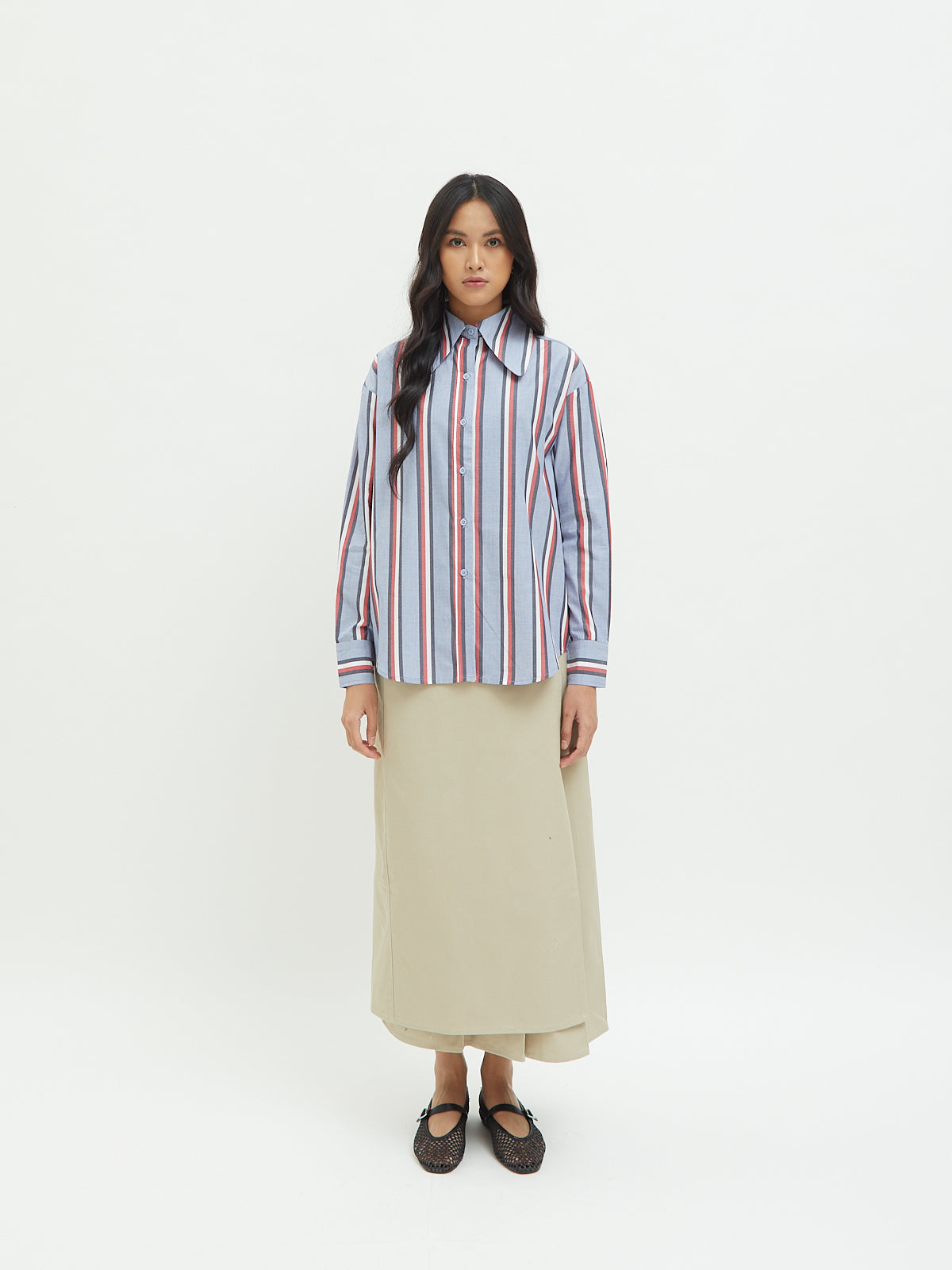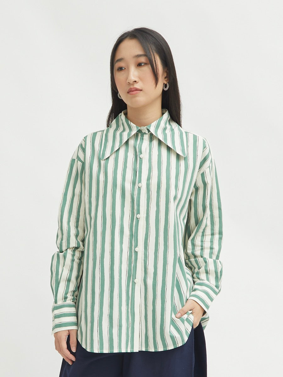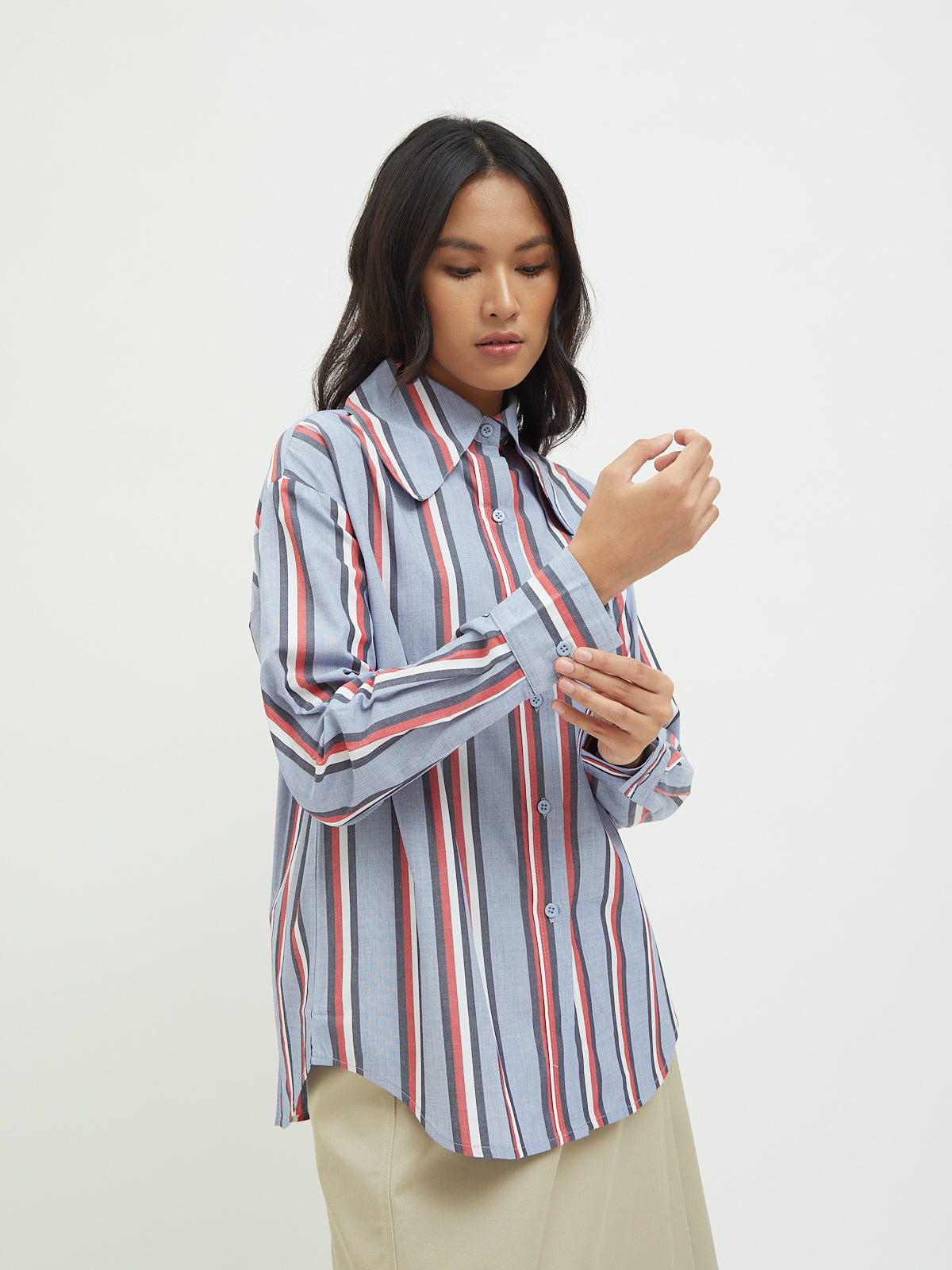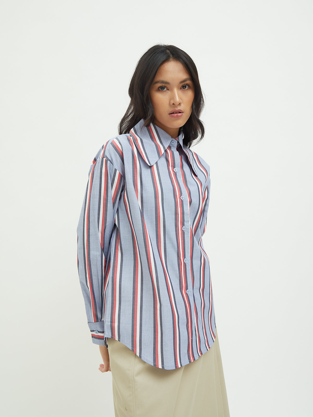Kemeja wanita lengan panjang ini didesain dengan detail full kancing di bagian depan. Memiliki detail kerah kemeja yang besar sehingga memberikan kesan yang unik. Memiliki siluet bagian bawah yang melengkung. Memiliki bahan yang halus sehingga nyaman saat dipakai. Cocok untuk dikenakan pada acara formal maupun non formal.
