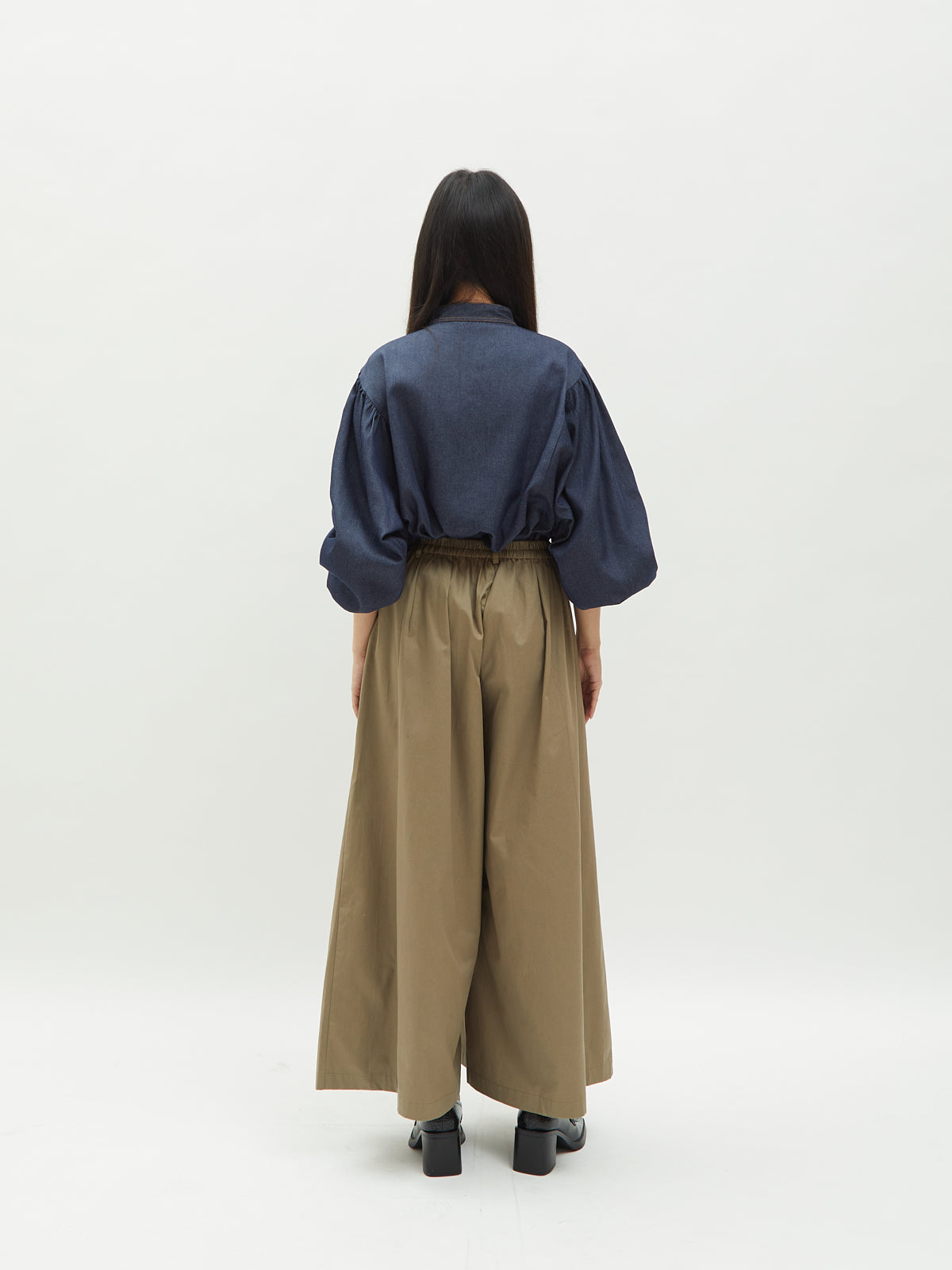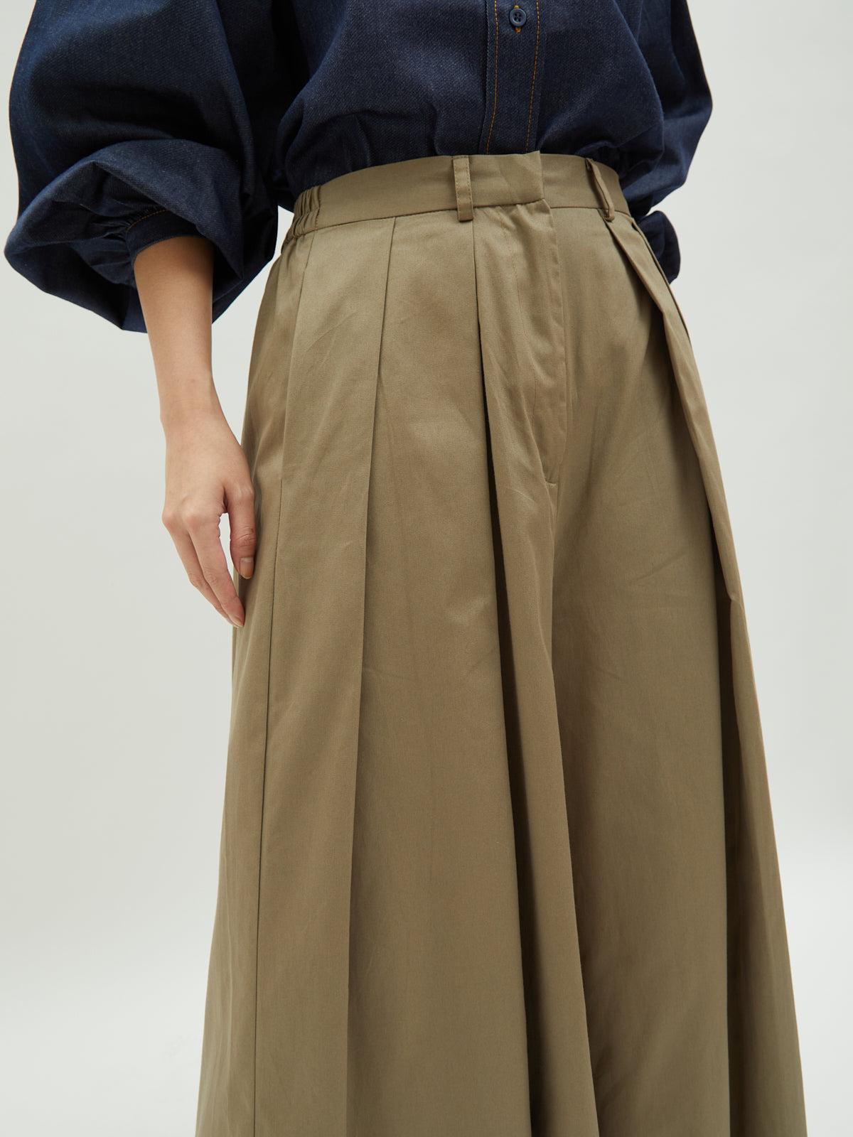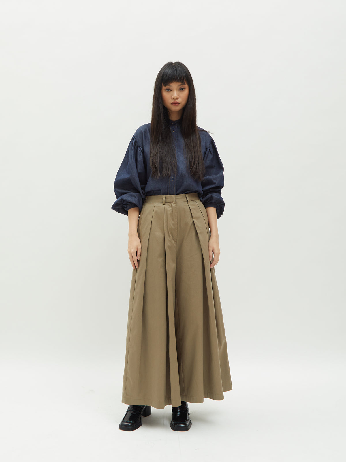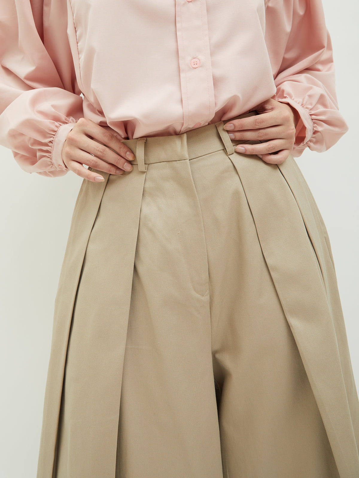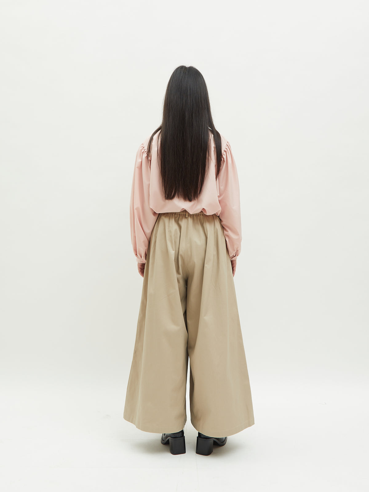 Celana dengan potongan lebar ini mempunyai detail double pleat di bagian depan. Terdapat resleting dibagian depan dan karet di bagian belakang. Memiliki saku di bagian kanan dan kiri. Bahannya yang ringan dan halus sehingga nyaman saat dipakai. Cocok dipakai untuk tampilan kasual dan formal.