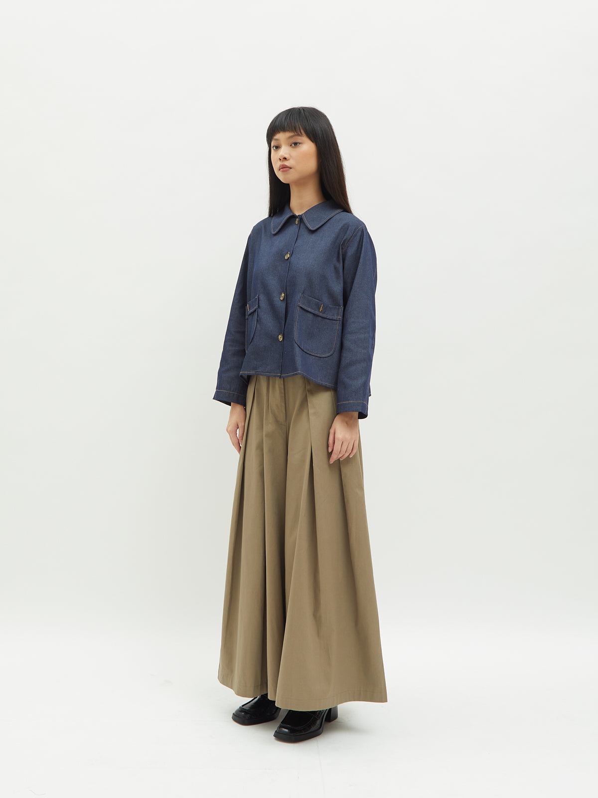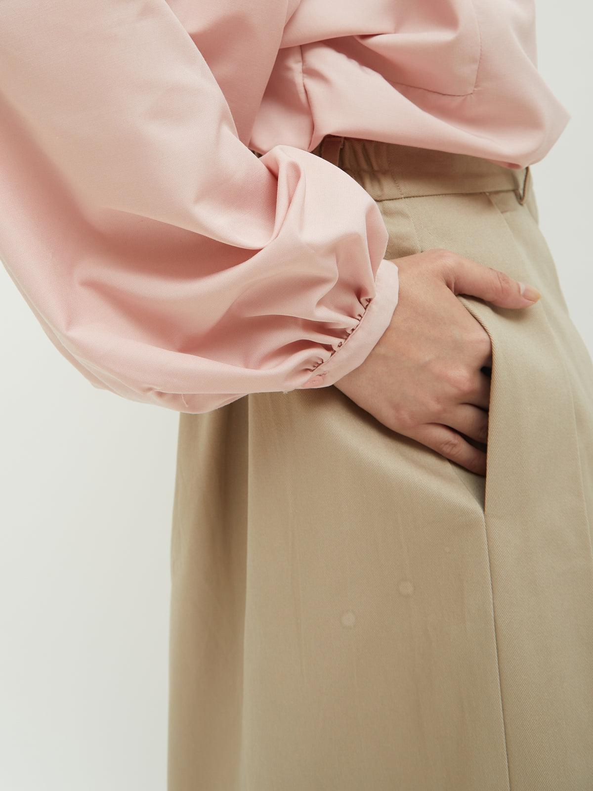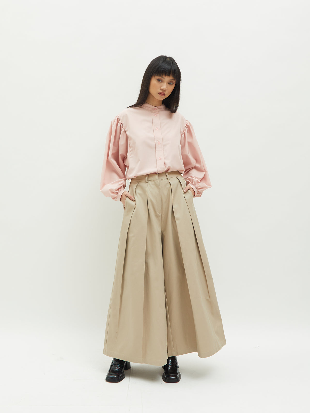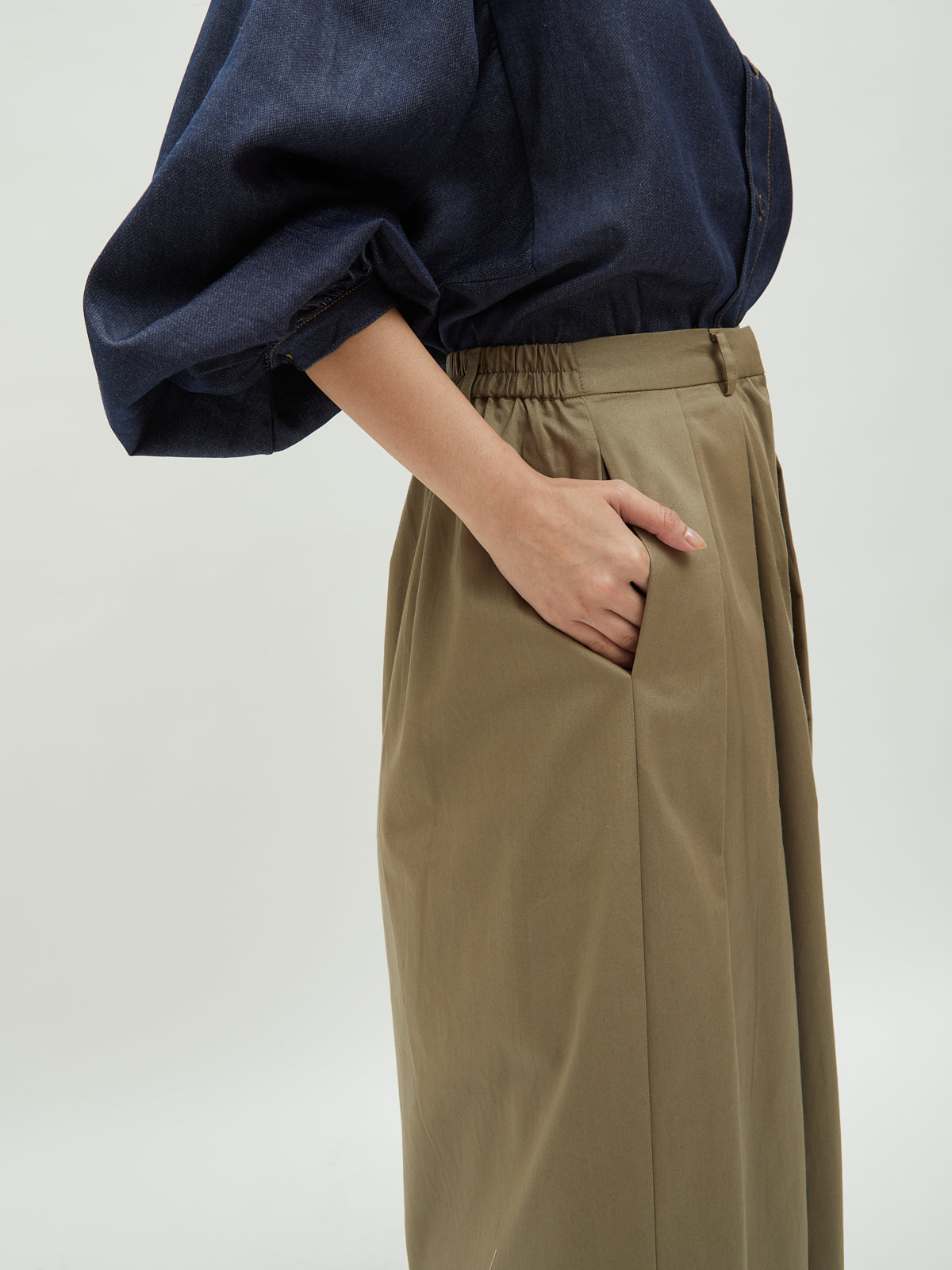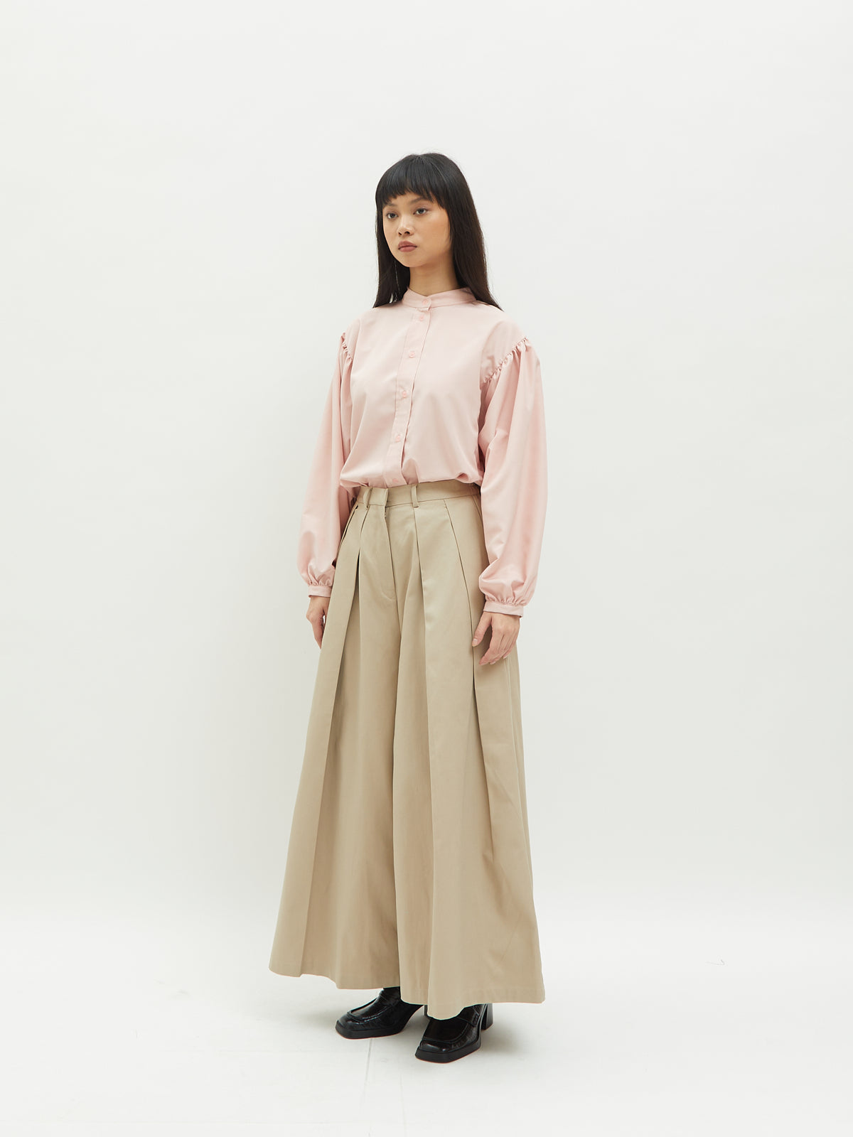 Celana dengan potongan lebar ini mempunyai detail double pleat di bagian depan. Terdapat resleting dibagian depan dan karet di bagian belakang. Memiliki saku di bagian kanan dan kiri. Bahannya yang ringan dan halus sehingga nyaman saat dipakai. Cocok dipakai untuk tampilan kasual dan formal.