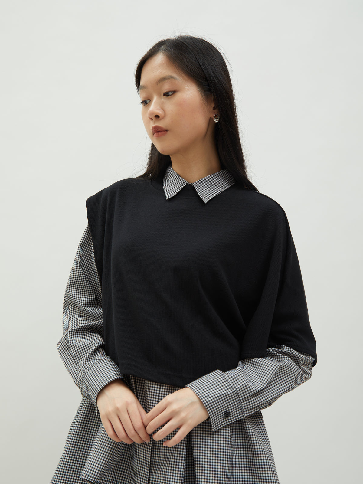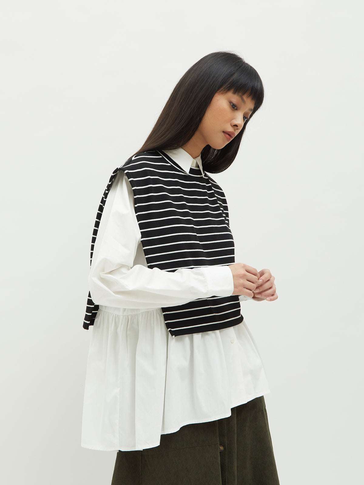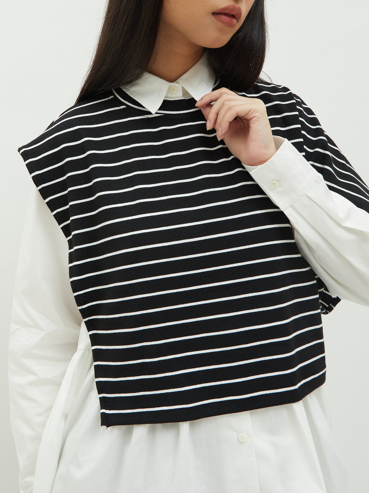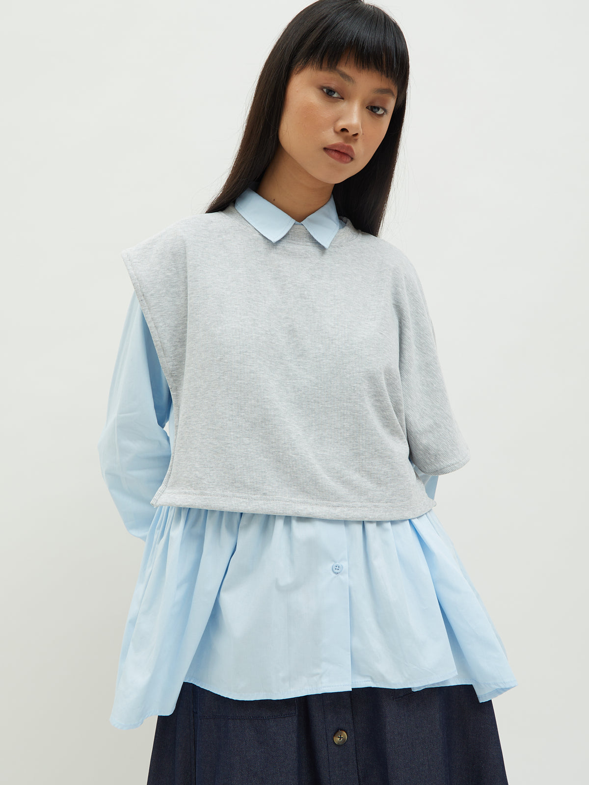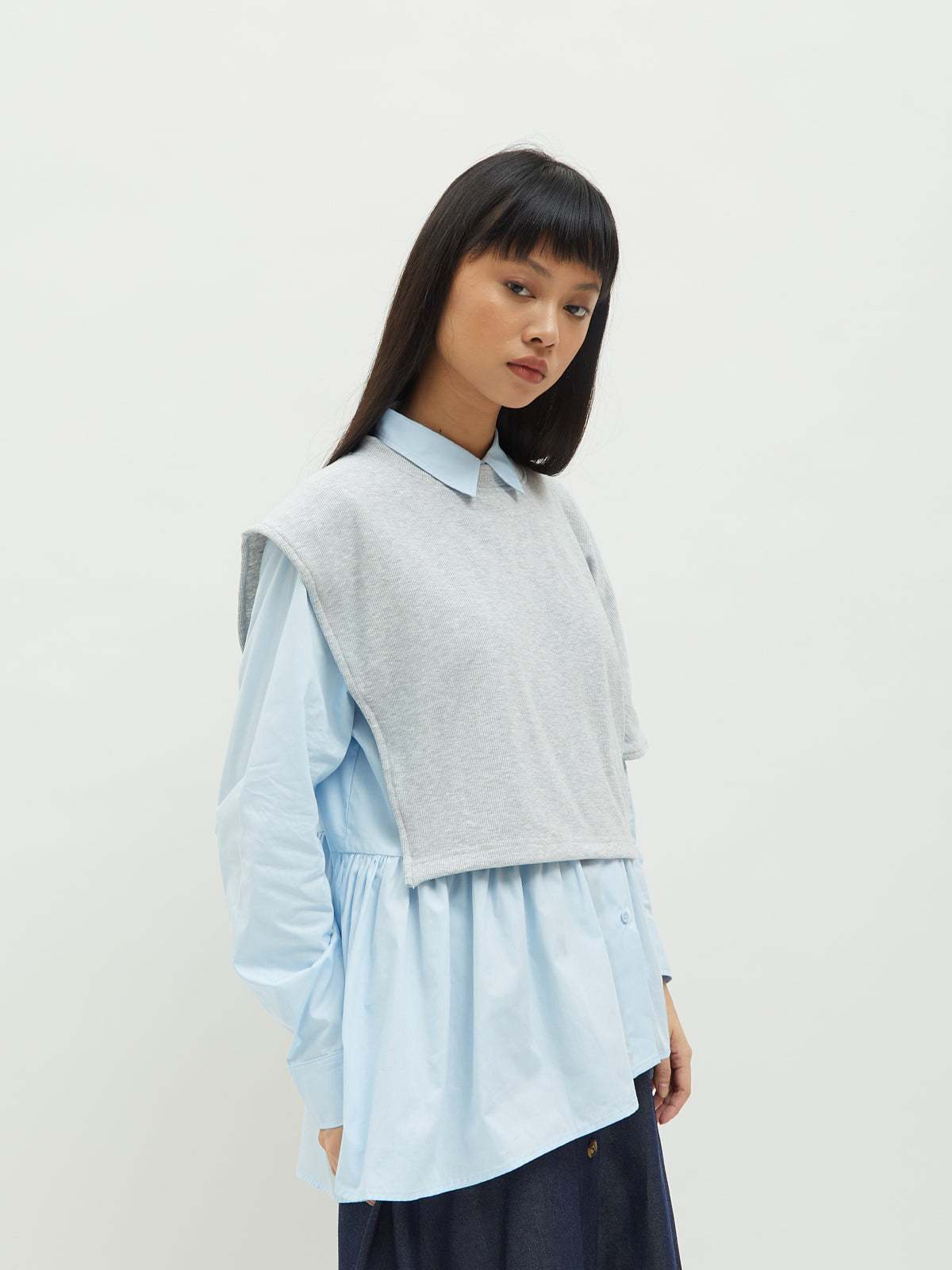 Atasan wanita ini terbuat dari dua jenis bahan yang berbeda. Atasan ini dapat dipakai secara terpisah. Kemeja dalam didesain dengan kerah kemeja dan full kancing depan. Terdapat ruffle di bagian pinggang sehingga membuat yang mengenakan terlihat elegan. Bahannya yang ringan dan halus sehingga nyaman saat dipakai. Cocok dikenakan untuk acara kasual.