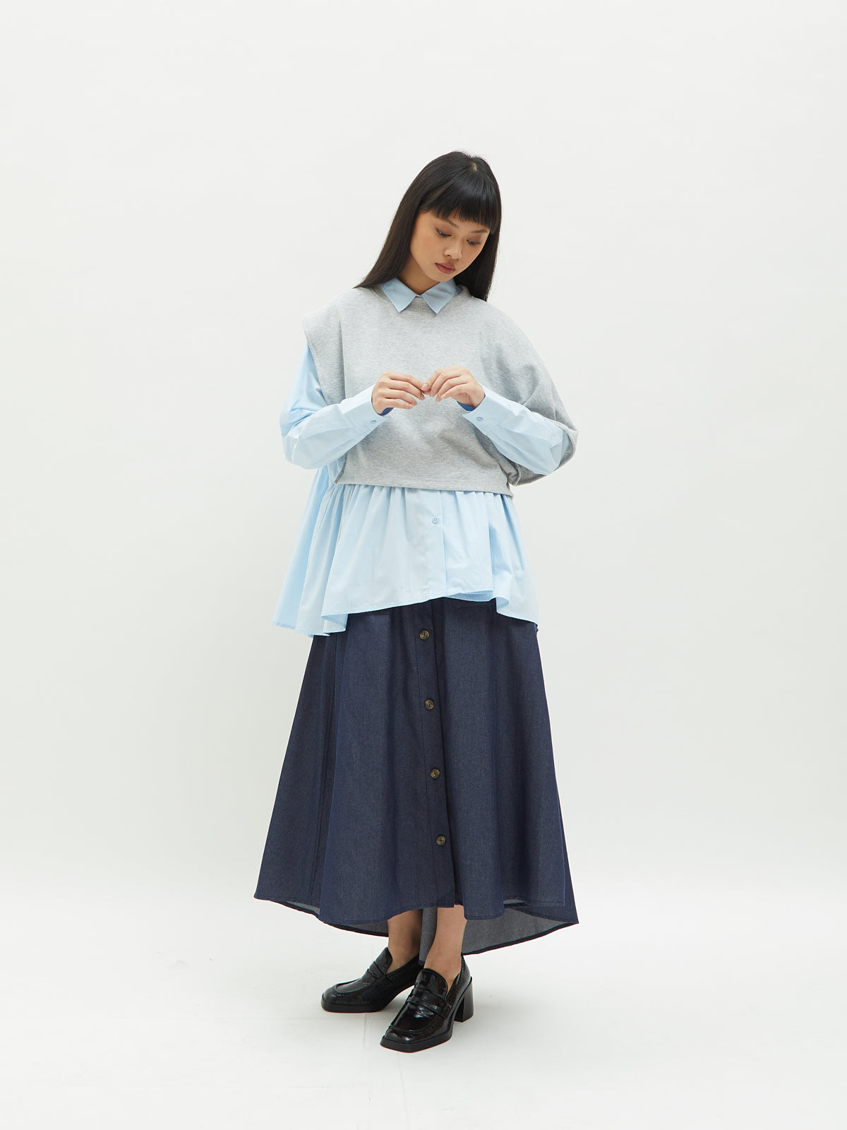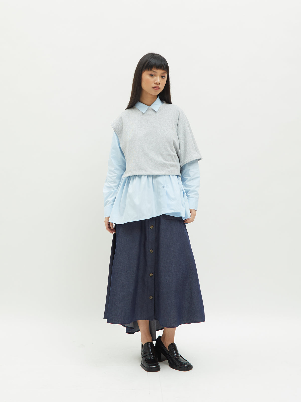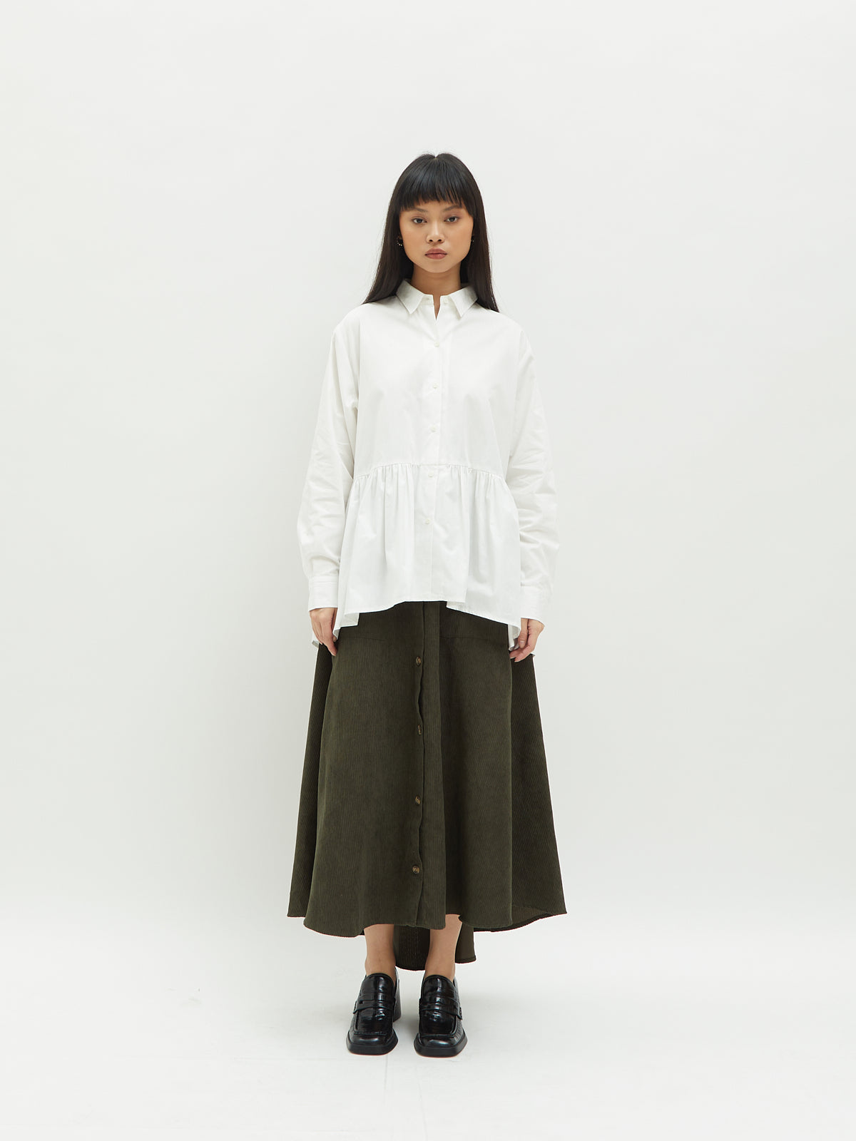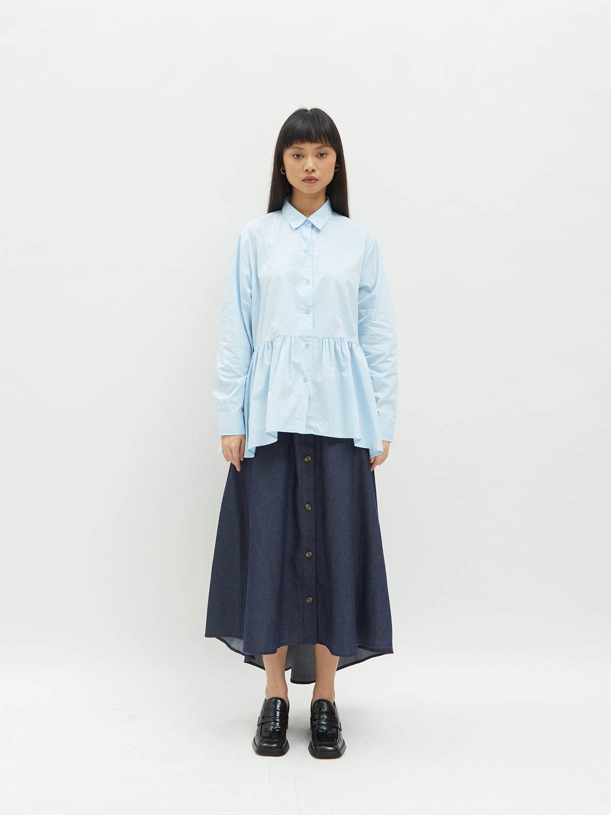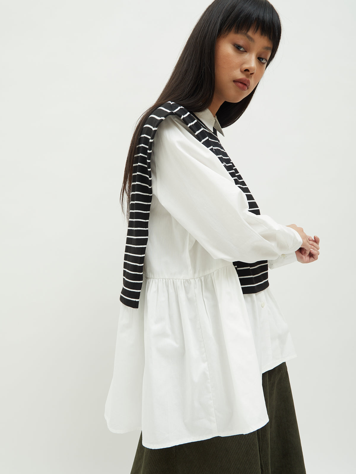 Atasan wanita ini terbuat dari dua jenis bahan yang berbeda. Atasan ini dapat dipakai secara terpisah. Kemeja dalam didesain dengan kerah kemeja dan full kancing depan. Terdapat ruffle di bagian pinggang sehingga membuat yang mengenakan terlihat elegan. Bahannya yang ringan dan halus sehingga nyaman saat dipakai. Cocok dikenakan untuk acara kasual.