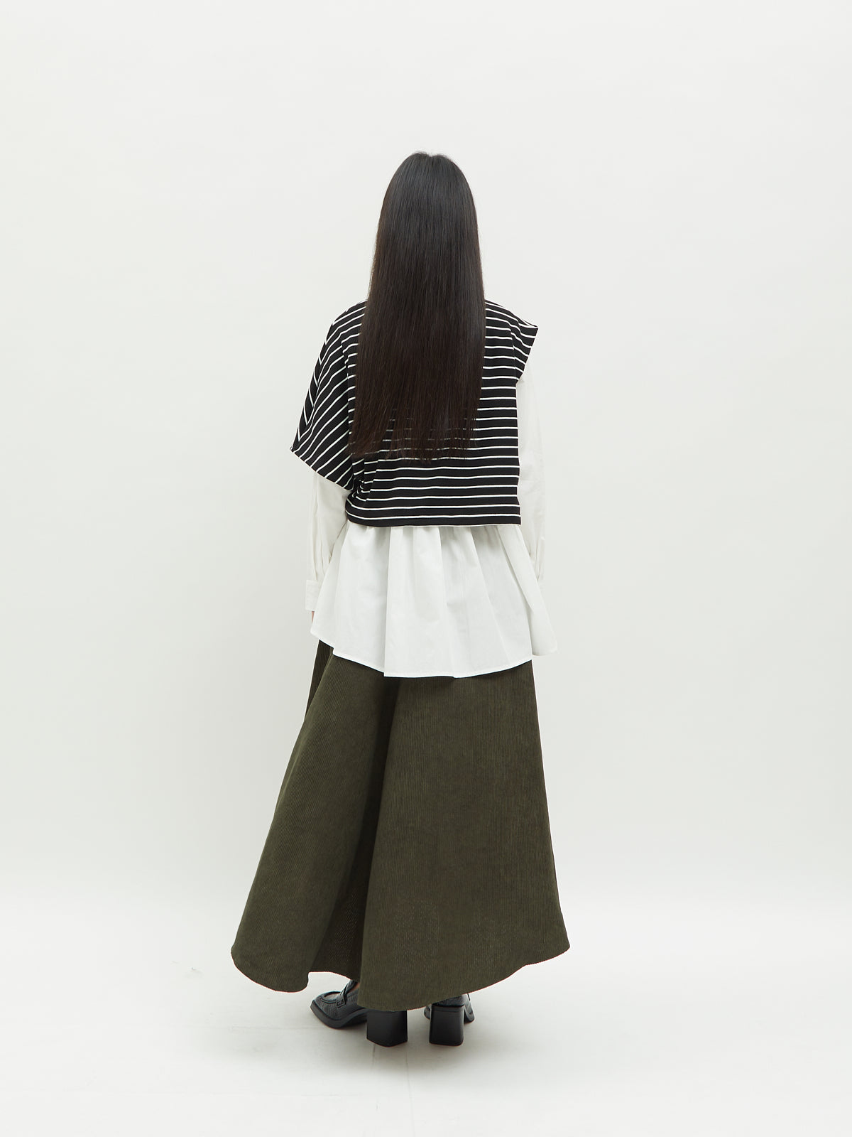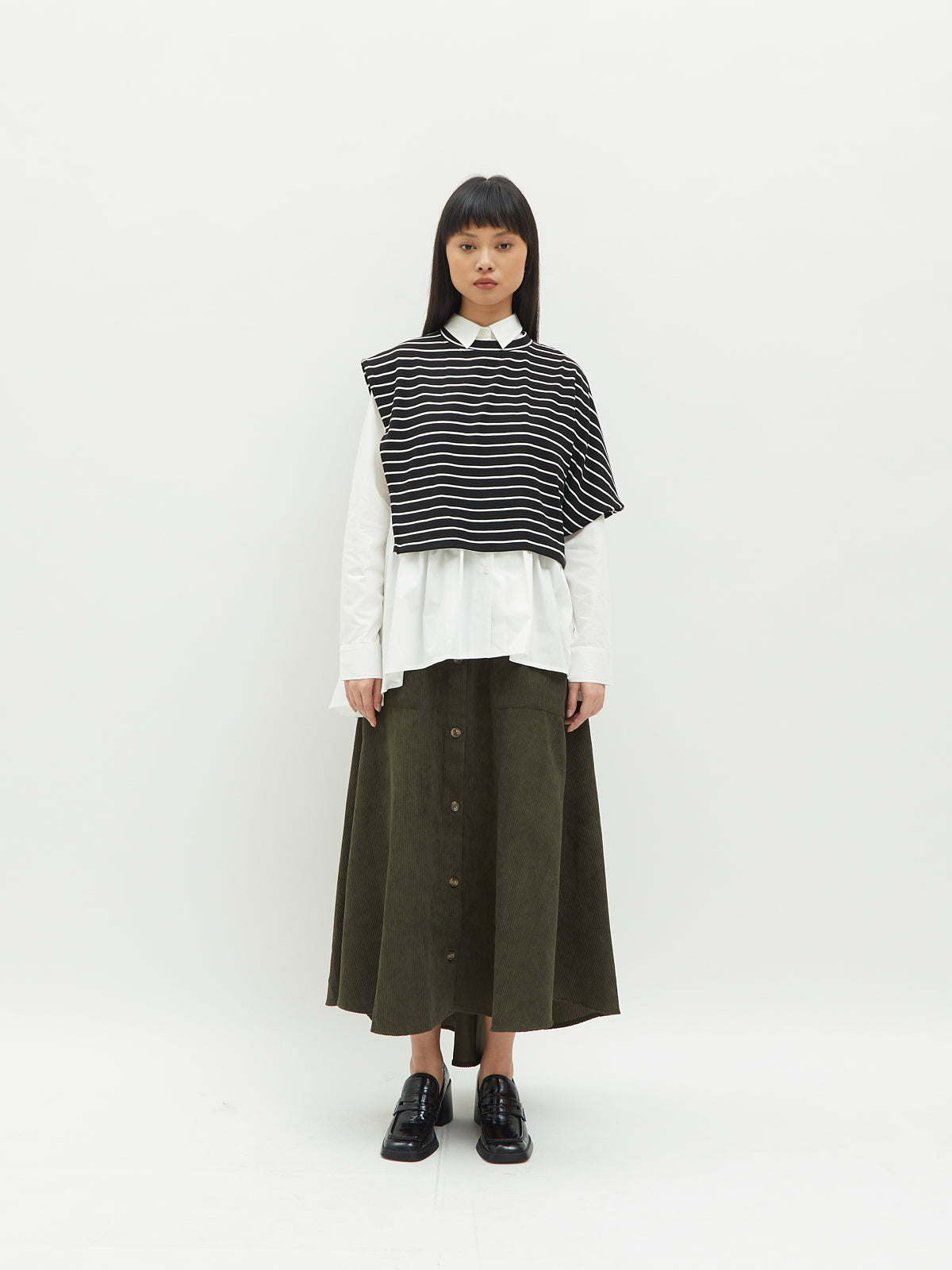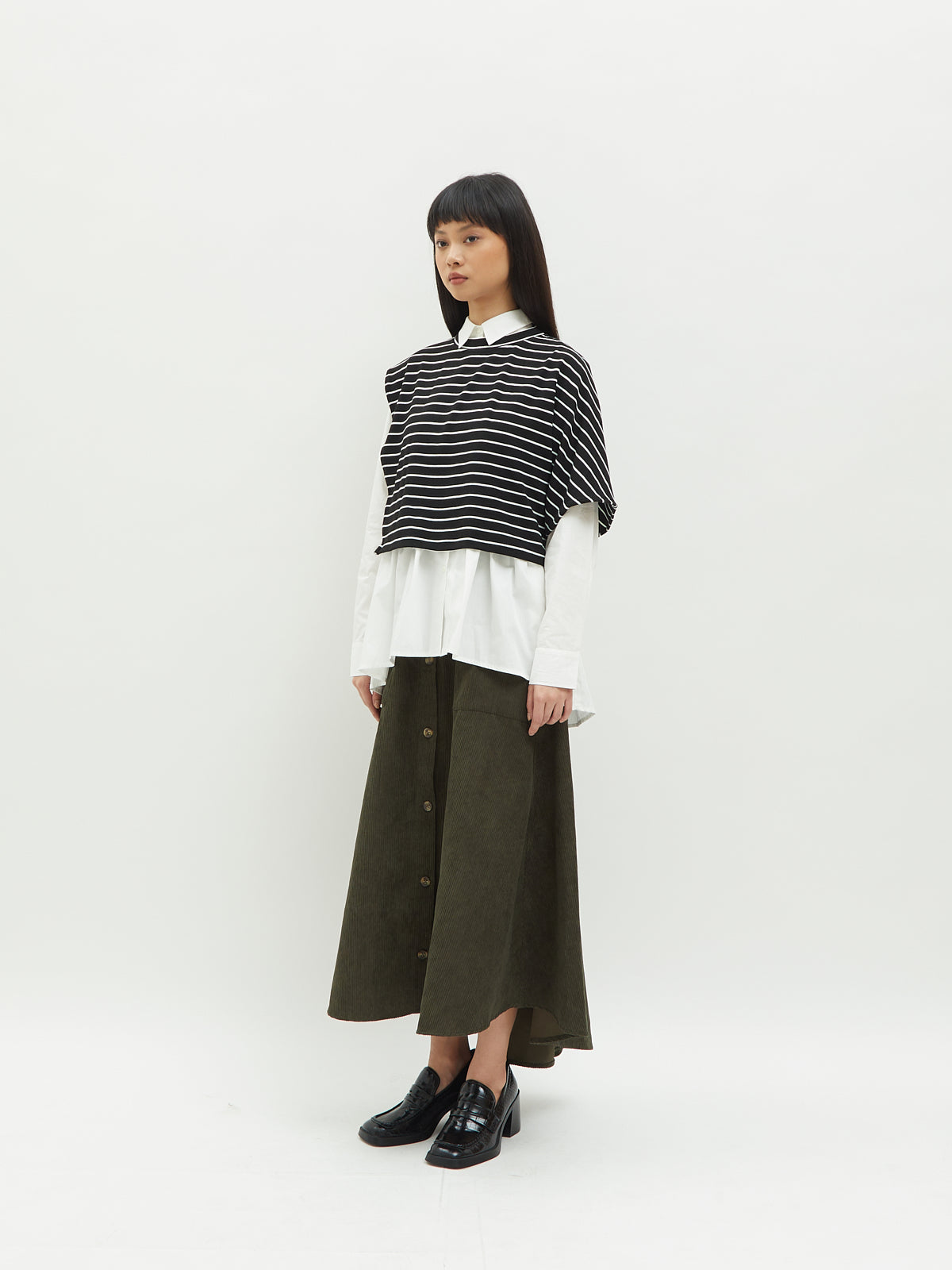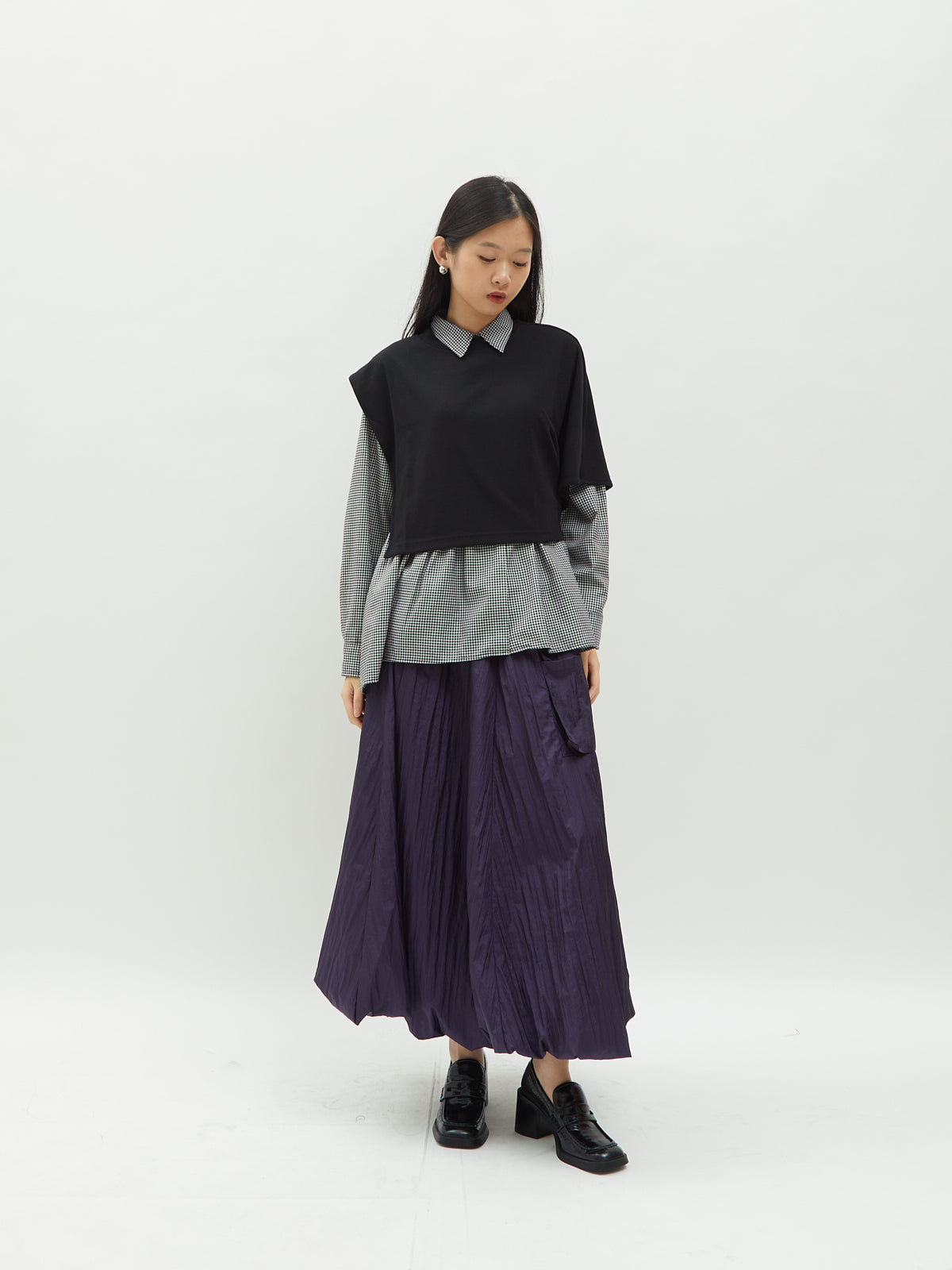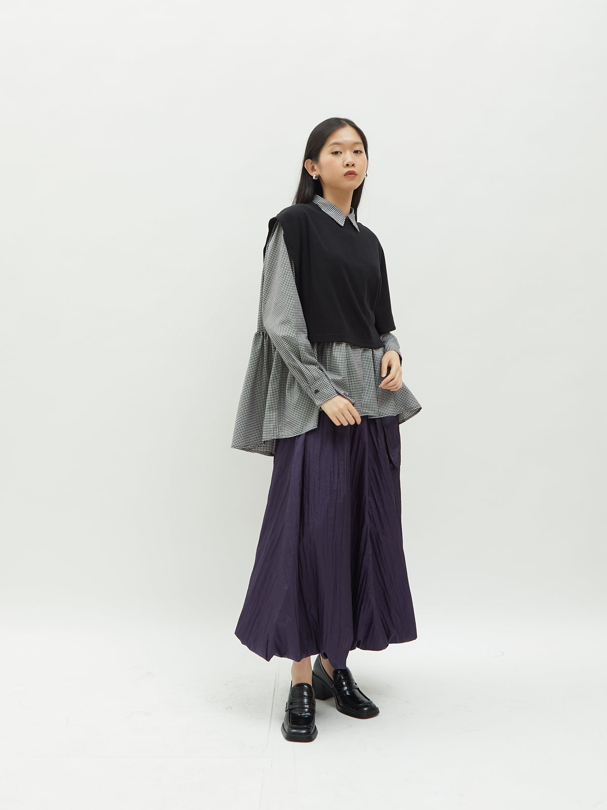 Atasan wanita ini terbuat dari dua jenis bahan yang berbeda. Atasan ini dapat dipakai secara terpisah. Kemeja dalam didesain dengan kerah kemeja dan full kancing depan. Terdapat ruffle di bagian pinggang sehingga membuat yang mengenakan terlihat elegan. Bahannya yang ringan dan halus sehingga nyaman saat dipakai. Cocok dikenakan untuk acara kasual.