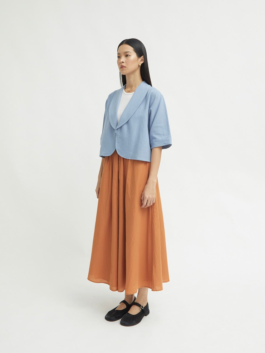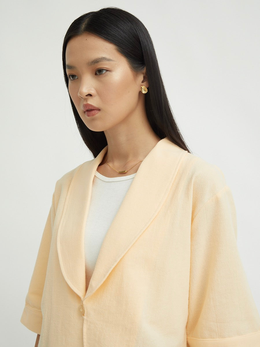 Outer ini didesain dengan potongan yang loose. Memiliki shawl collar, satu kancing depan dan lengan 3/4. Cocok untuk dipakai dalam kegiatan sehari-hari, baik itu untuk acara formal atau informal.
