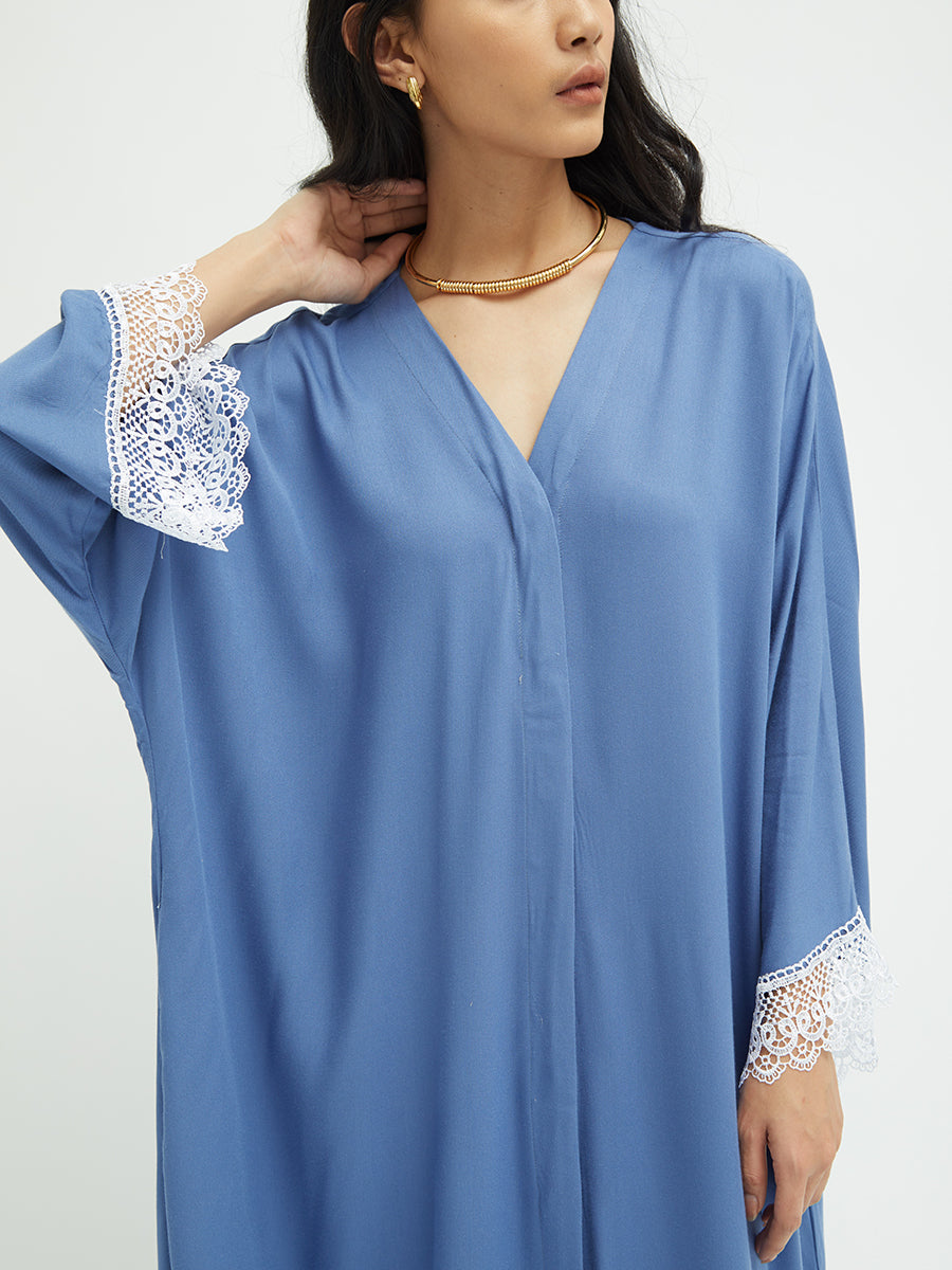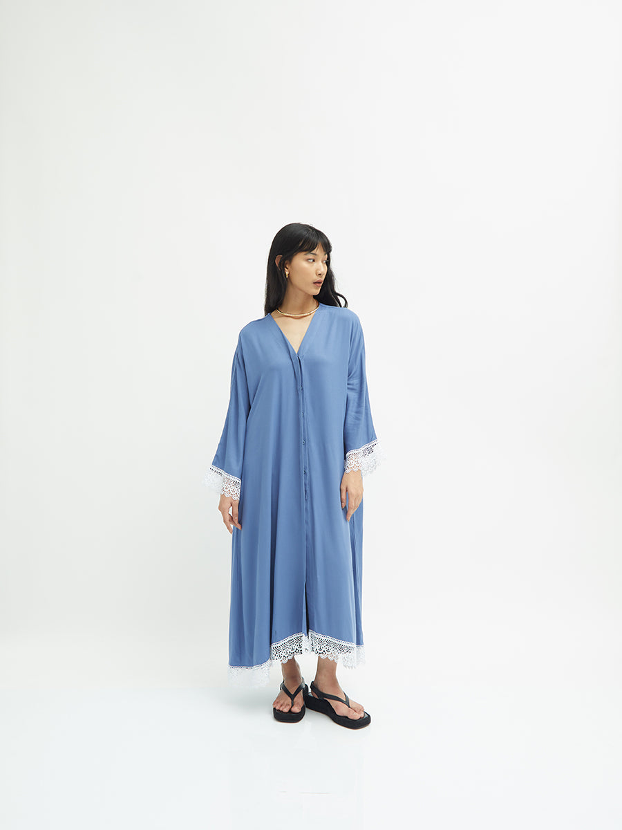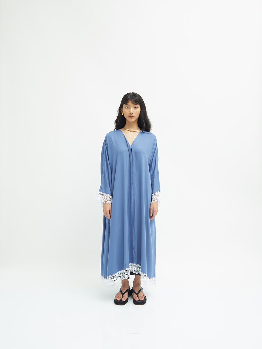 Dress lengan panjang ini didesain dengan kerah v-neck. Terdapat kancing tersembunyi di bagian depan. Ada detail brokat di bagian ujung lengan dan bagian bawah dress. Dengan potongan elegan, dress ini cocok dikenakan saat Raya dan acara formal.