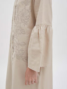 Dress panjang dengan detail bordir bunga di bagian depan yang memberikan sentuhan feminin dan elegan. Didesain dengan potongan longgar dan lengan berkerut yang menambah volume, menciptakan tampilan anggun yang tetap nyaman untuk dikenakan sehari-hari maupun acara semi-formal.