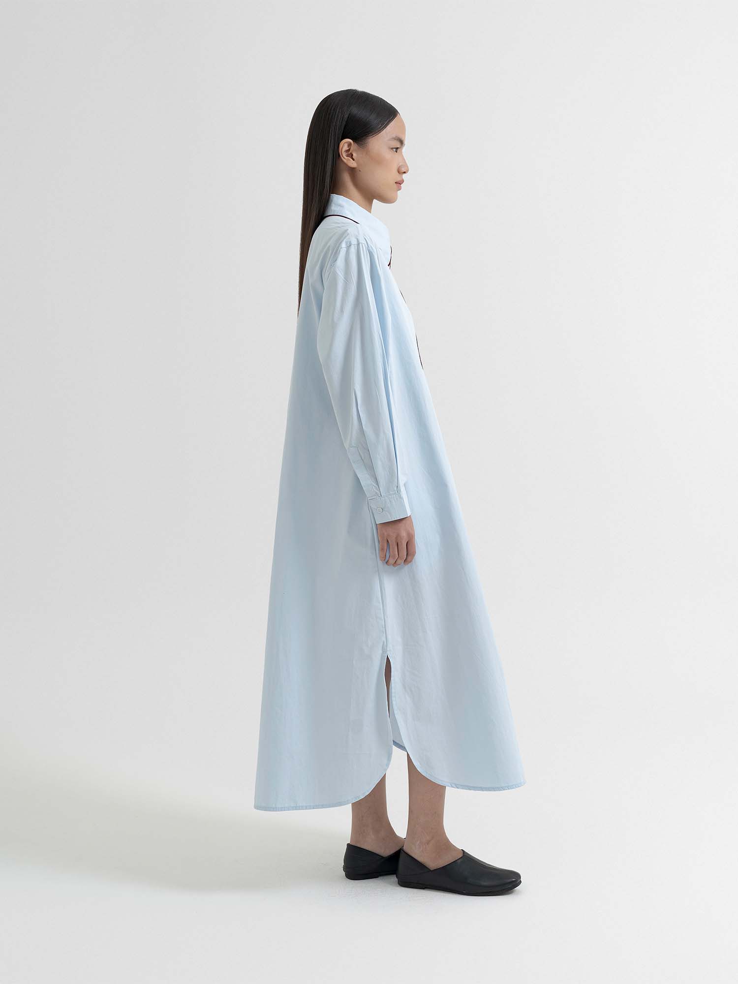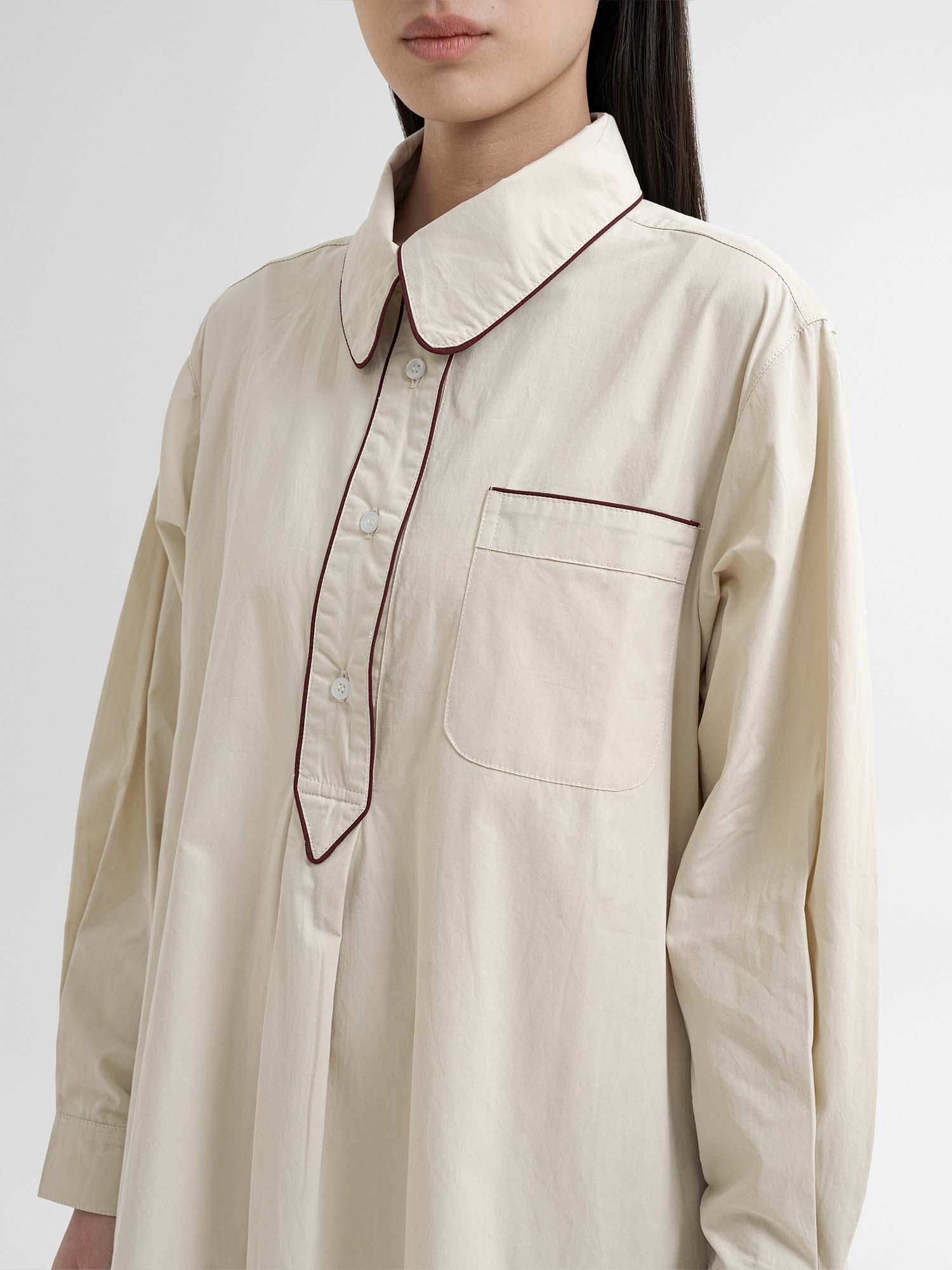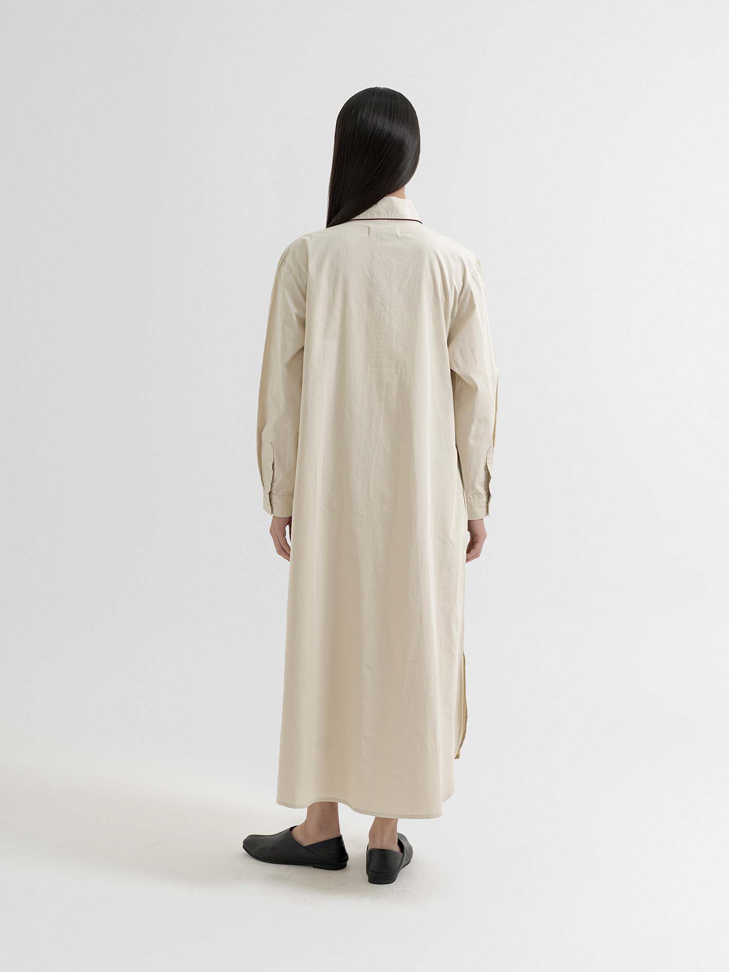 Dress panjang dengan siluet loose yang memberi kenyamanan maksimal. Detail piping kontras pada kerah dan placket memberi sentuhan manis sekaligus modern. Terbuat dari bahan katun yang ringan dan breathable, cocok untuk dikenakan sepanjang hari. Desainnya yang clean membuatnya mudah dipadukan untuk tampilan kasual maupun semi-formal.