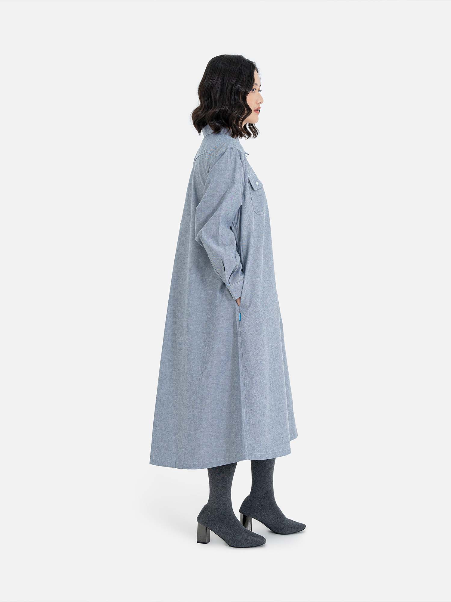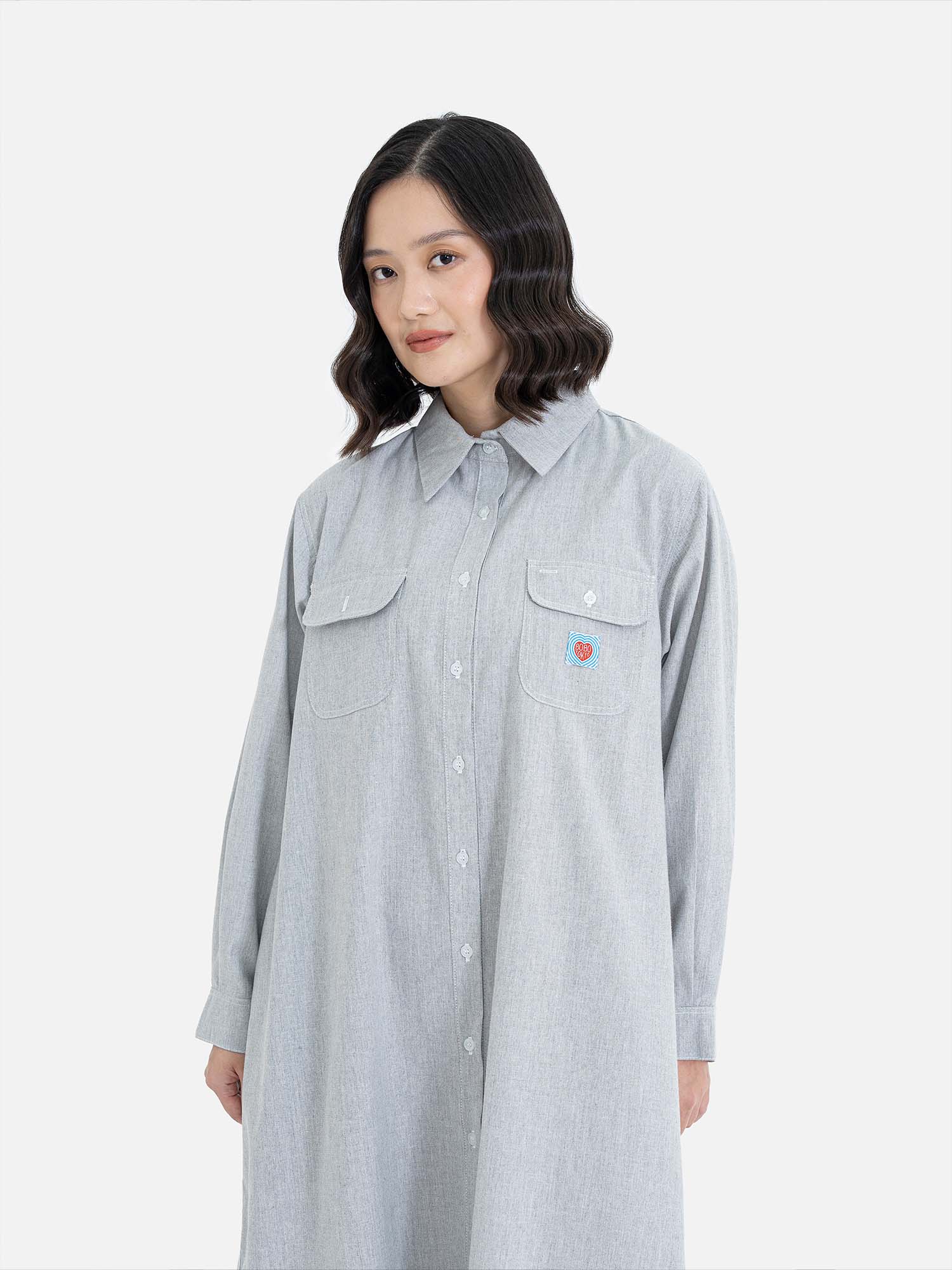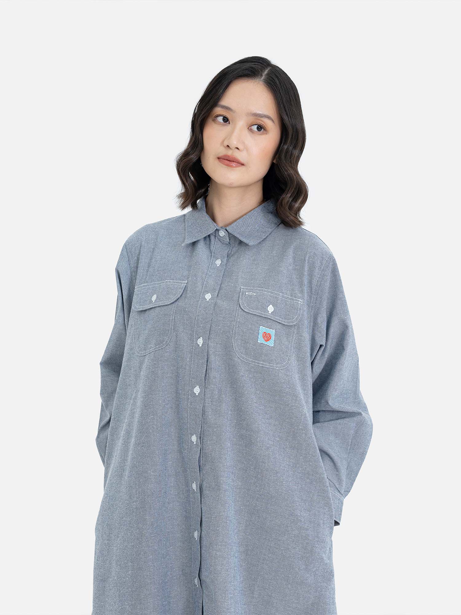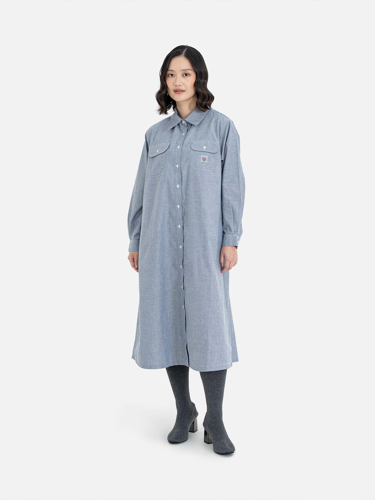 Tampil effortless dengan Imogen Dress! Dress berbahan chambray ini hadir dalam potongan loose-fit yang nyaman dan versatile. Detail kerah klasik, kancing depan penuh, serta dua kantong dada memberi kesan smart casual yang chic. Panjang dress yang mencapai mata kaki dan lengan panjangnya membuatnya cocok dikenakan di berbagai suasana, dari ngantor hingga hangout santai.