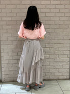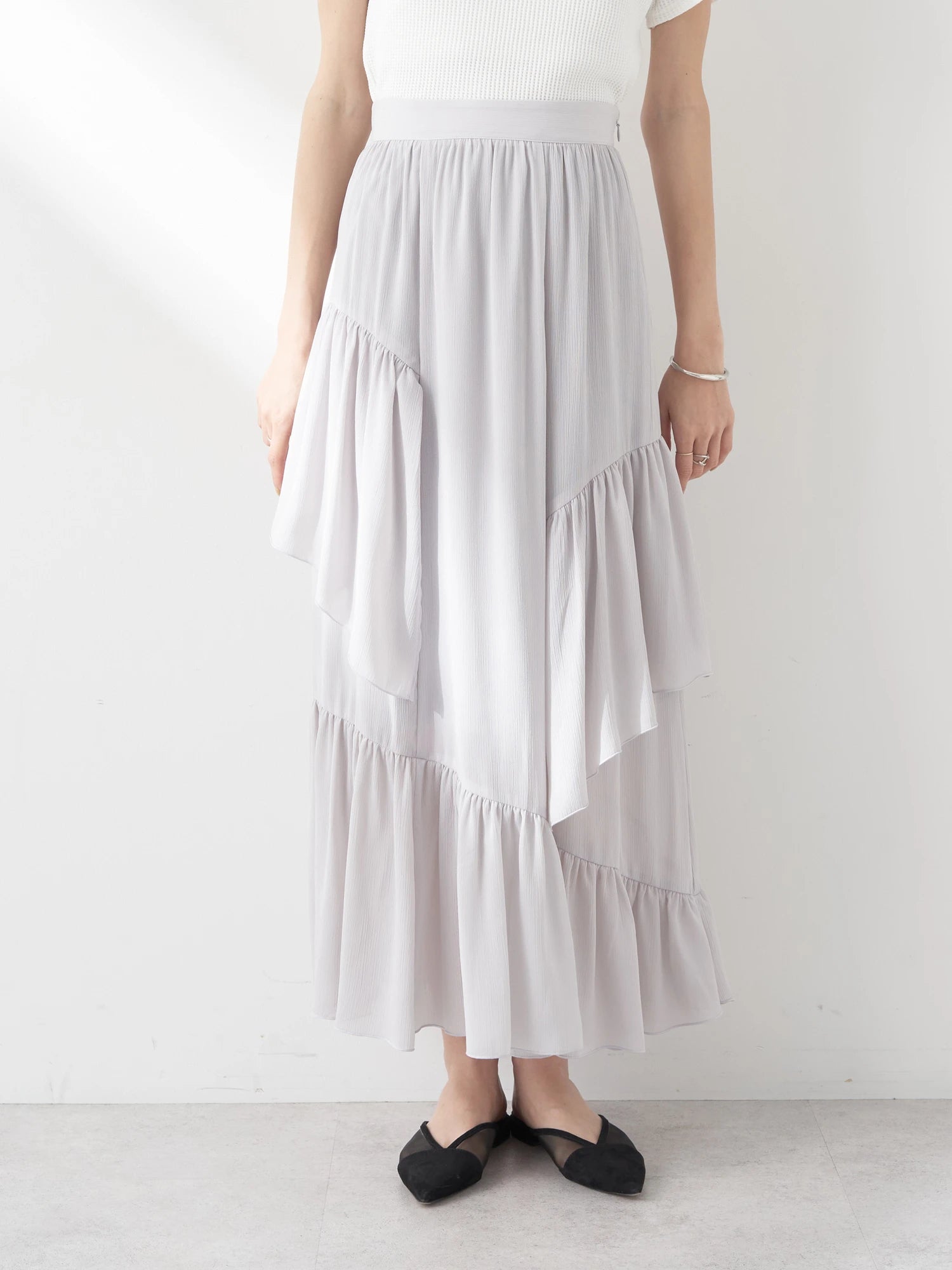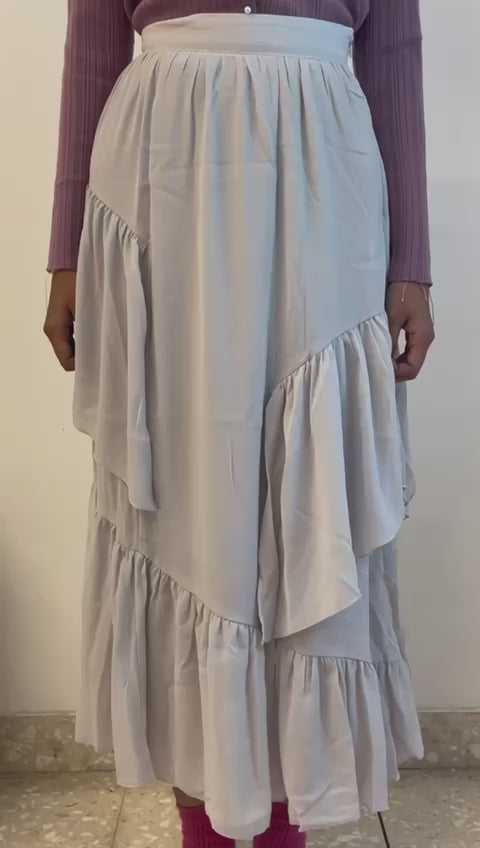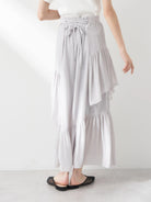 Rok wanita ini didesain dengan ruffle yang memberikan kesan elegan. Memiliki detail resleting di samping rok. Terdapat kain pada lapisan dalam sehingga tidak tembus pandang. Memiliki karet dan tali yang dapat disesuaikan pada bagian belakang pinggang. Bahannya yang ringan dan halus sehingga nyaman saat dipakai. Cocok dikenakan untuk acara kasual.
