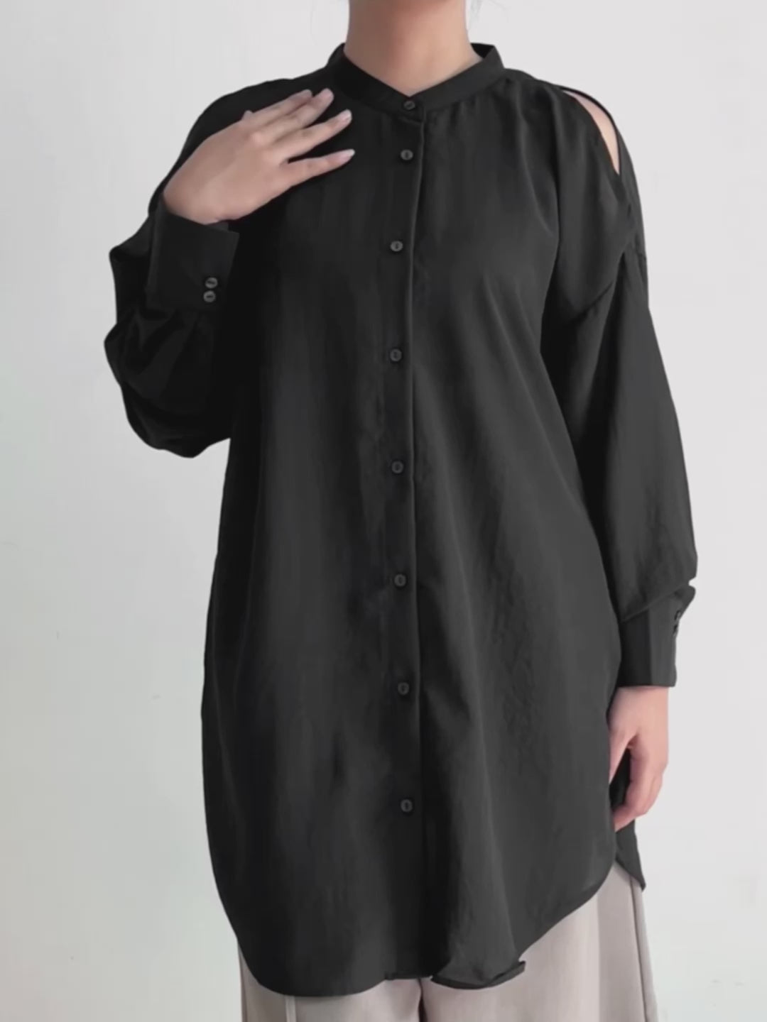 Atasan wanita ini di desain dengan cold shoulder yang menambah tampilan feminin. Memiliki full kancing depan yang memudahkan kamu untuk mengenakannya, juga terdapat slit pada bagian samping. Dapat digunakan sebagai kemeja dan juga sebagai outer.