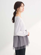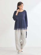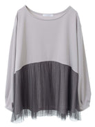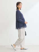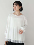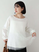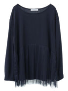 Pullover ini menampilkan detail tulle plisket yang menambah kesan lembut dan feminin pada tampilan. Siluet A-line yang sedikit melebar memberikan kesan ringan dan elegan, cocok untuk gaya kasual hingga semi-formal.