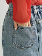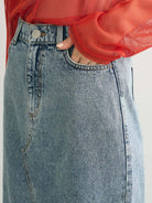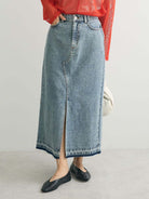Rok denim dengan warna washed yang lembut dan sentuhan kasual. Desain siluet lurus panjang dengan belahan depan yang cukup dalam memberikan tampilan stylish dan modern. Bagian pinggang belakang dilengkapi karet elastis untuk kenyamanan maksimal, cocok untuk aktivitas sehari-hari. Detail potongan unfinished di bagian bawah menambah kesan santai namun tetap rapi.