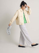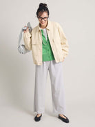 Detail seperti drawstring di bagian bawah dan manset shirring memberikan sentuhan modern yang cocok untuk gaya harian hingga semi-formal. Dapat dipadukan dengan knit oversized atau celana lebar untuk tampilan effortless chic.