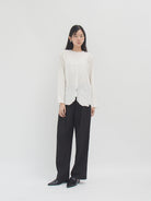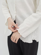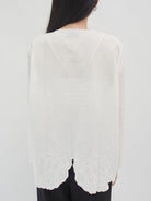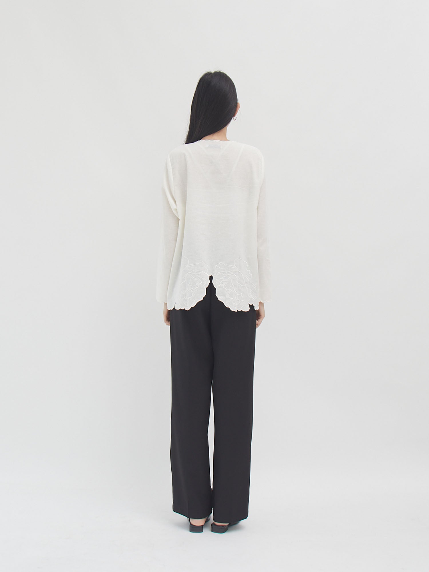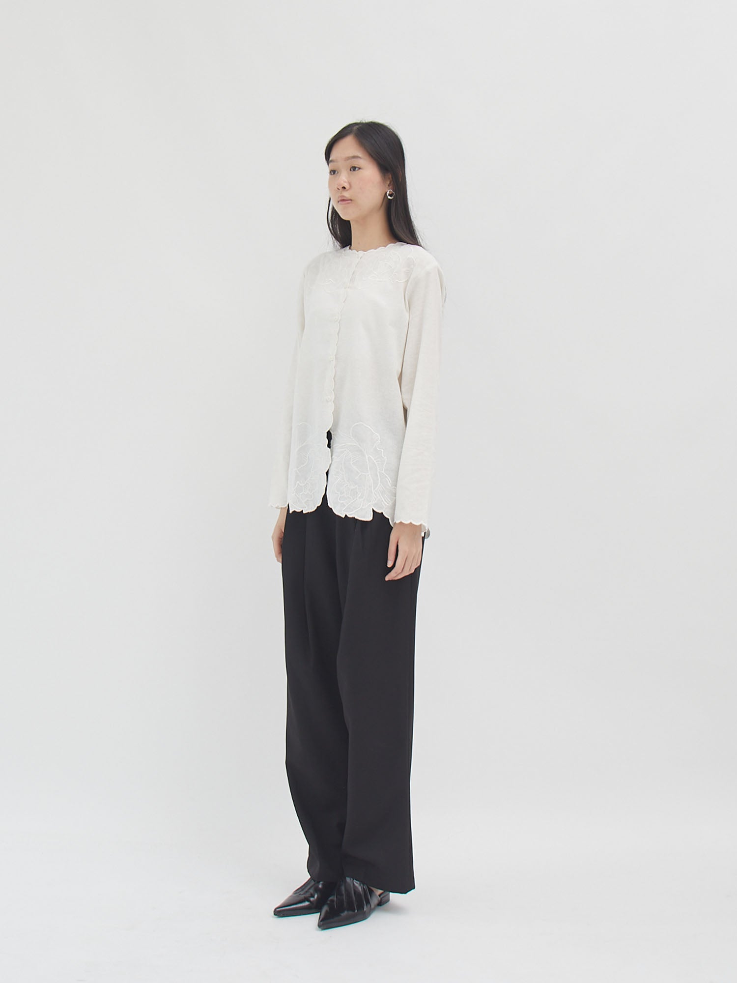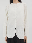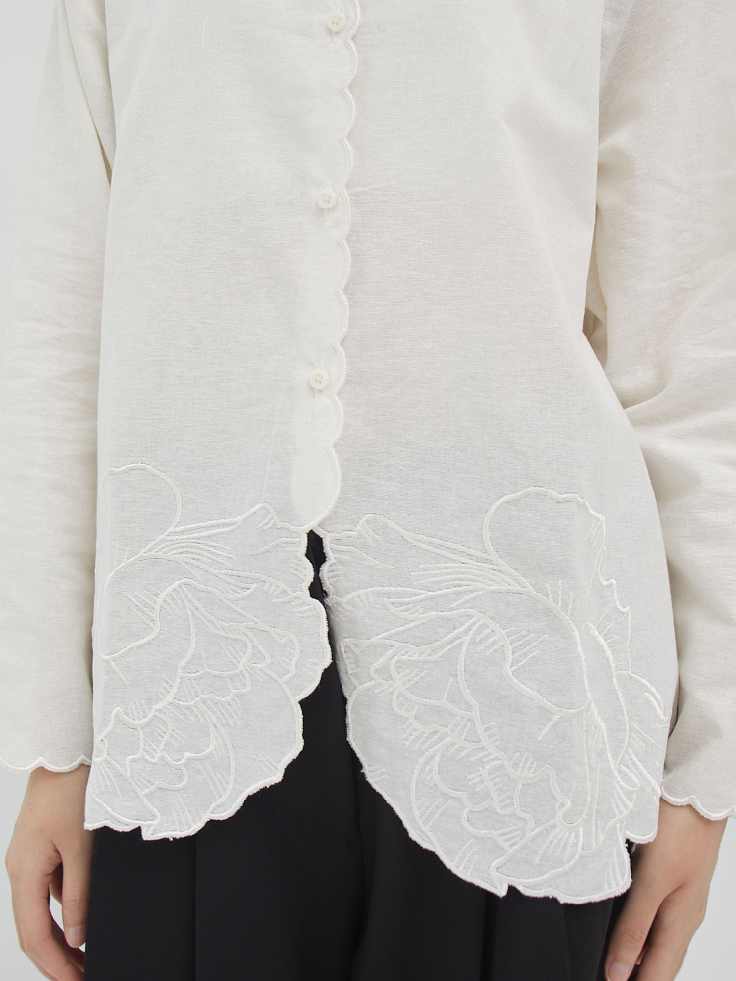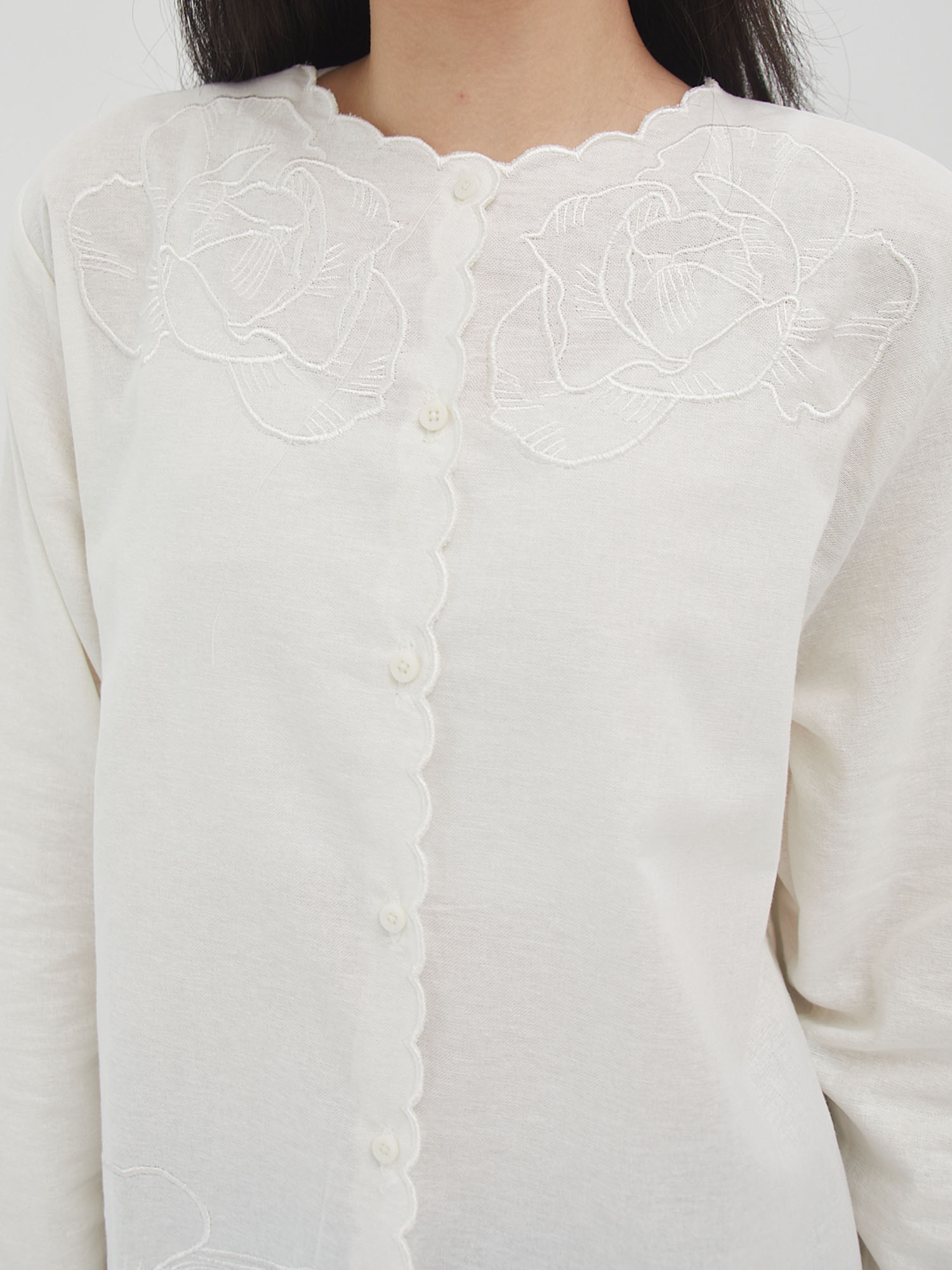 Blouse bordir lengan panjang dengan detail scallop di bagian depan, kerah, dan ujung lengan. Dihiasi bordiran bunga yang elegan di bagian dada serta bawah blouse, memberikan sentuhan feminin dan manis. Desain longgar dengan kancing depan membuatnya nyaman dipakai untuk tampilan kasual maupun semi-formal.