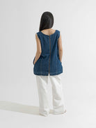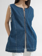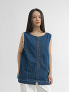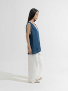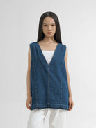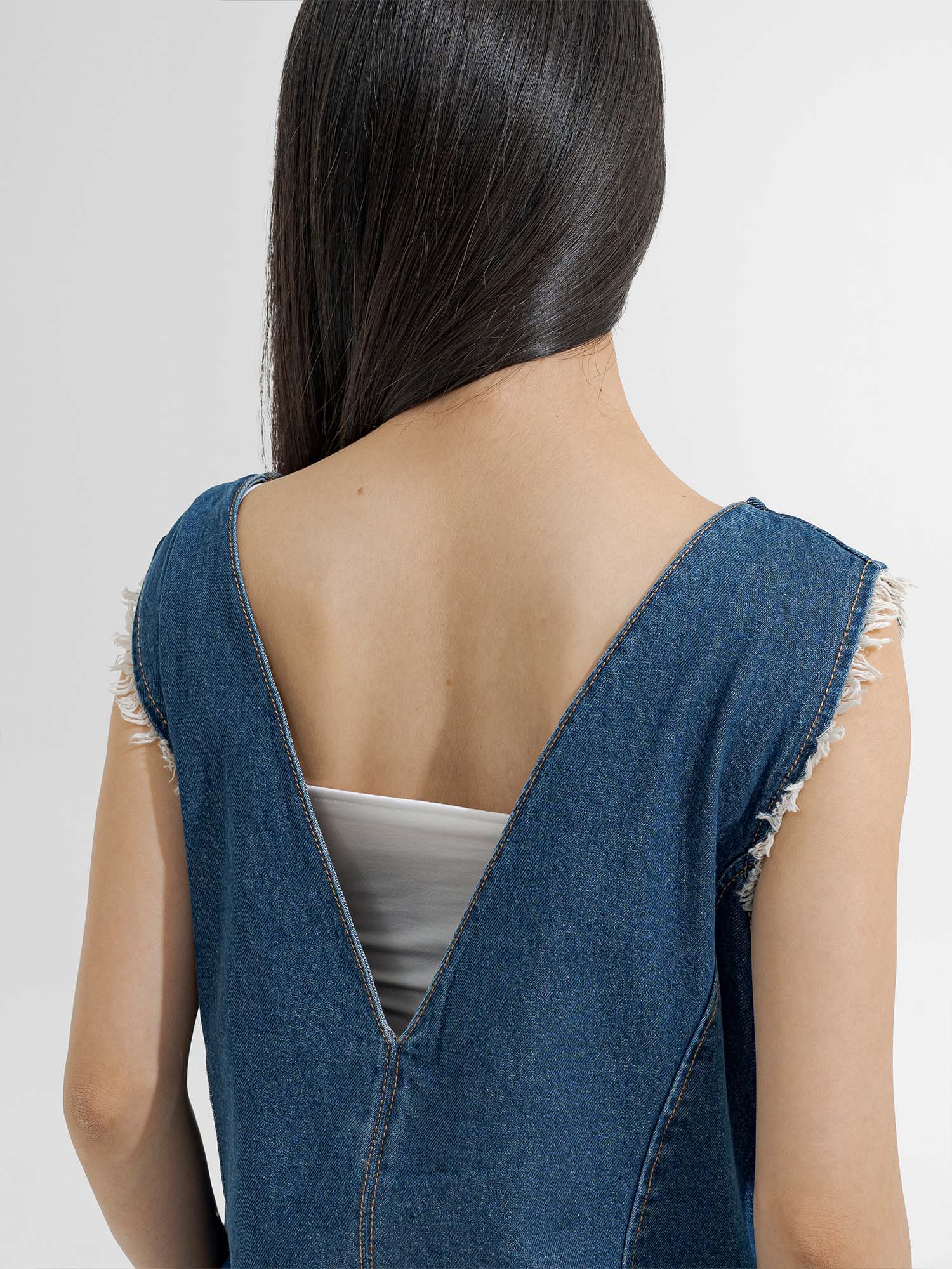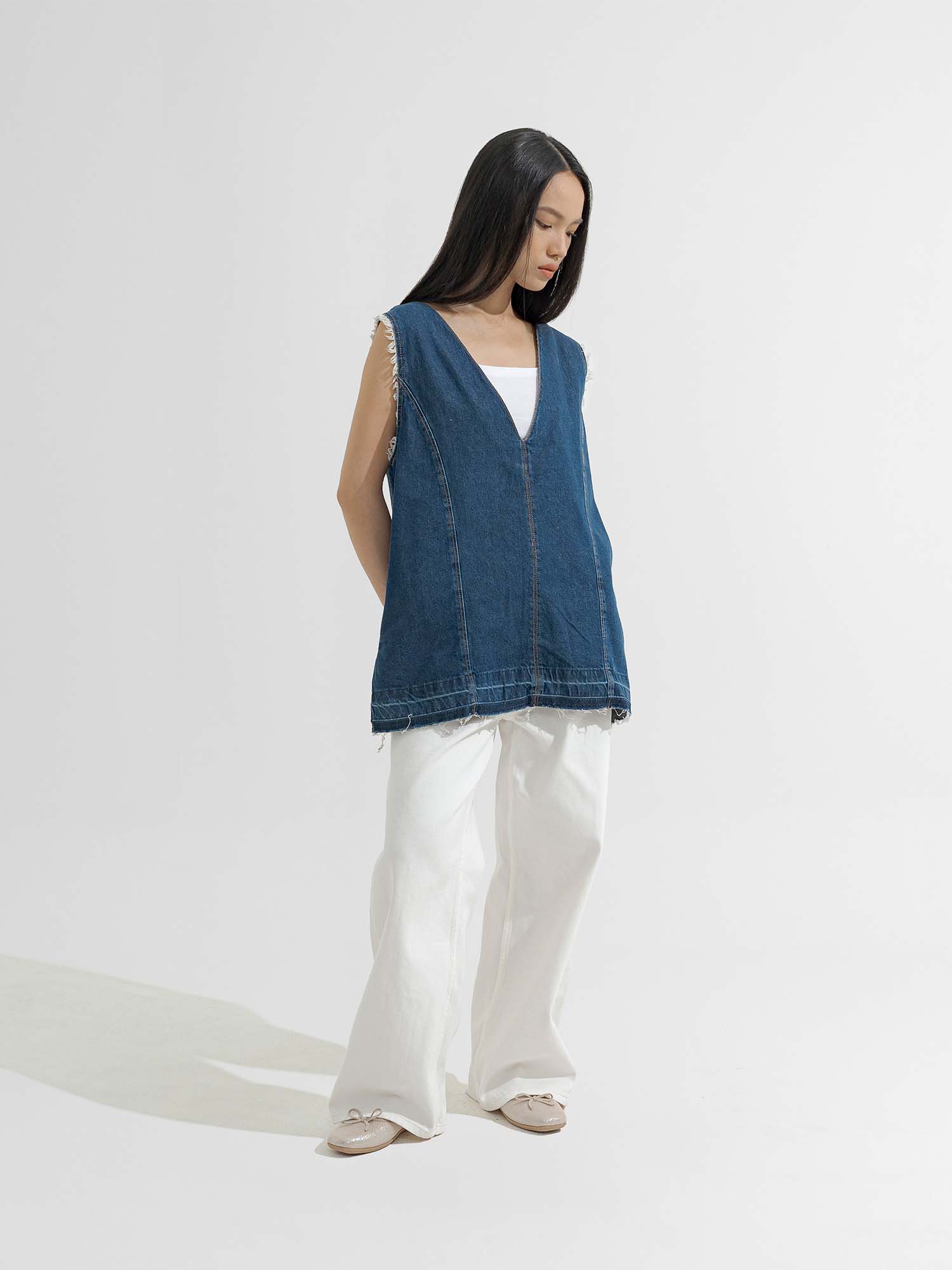 Vest kasual dengan desain serbaguna yang bisa dipakai dua arah: sebagai V-neck depan atau belakang. Detail unfinished edge memberi sentuhan edgy dan modern, cocok untuk layering atau dipakai sendiri.
