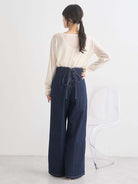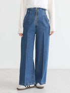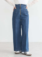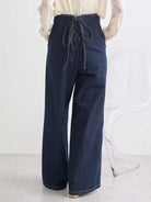 Celana denim high-waist dengan ritsleting depan dan detail tali serut di bagian belakang yang memberikan tampilan unik dan feminin. Terbuat dari bahan katun yang tebal namun nyaman, dengan potongan lurus yang mudah dipadukan untuk gaya kasual hingga semi-formal.