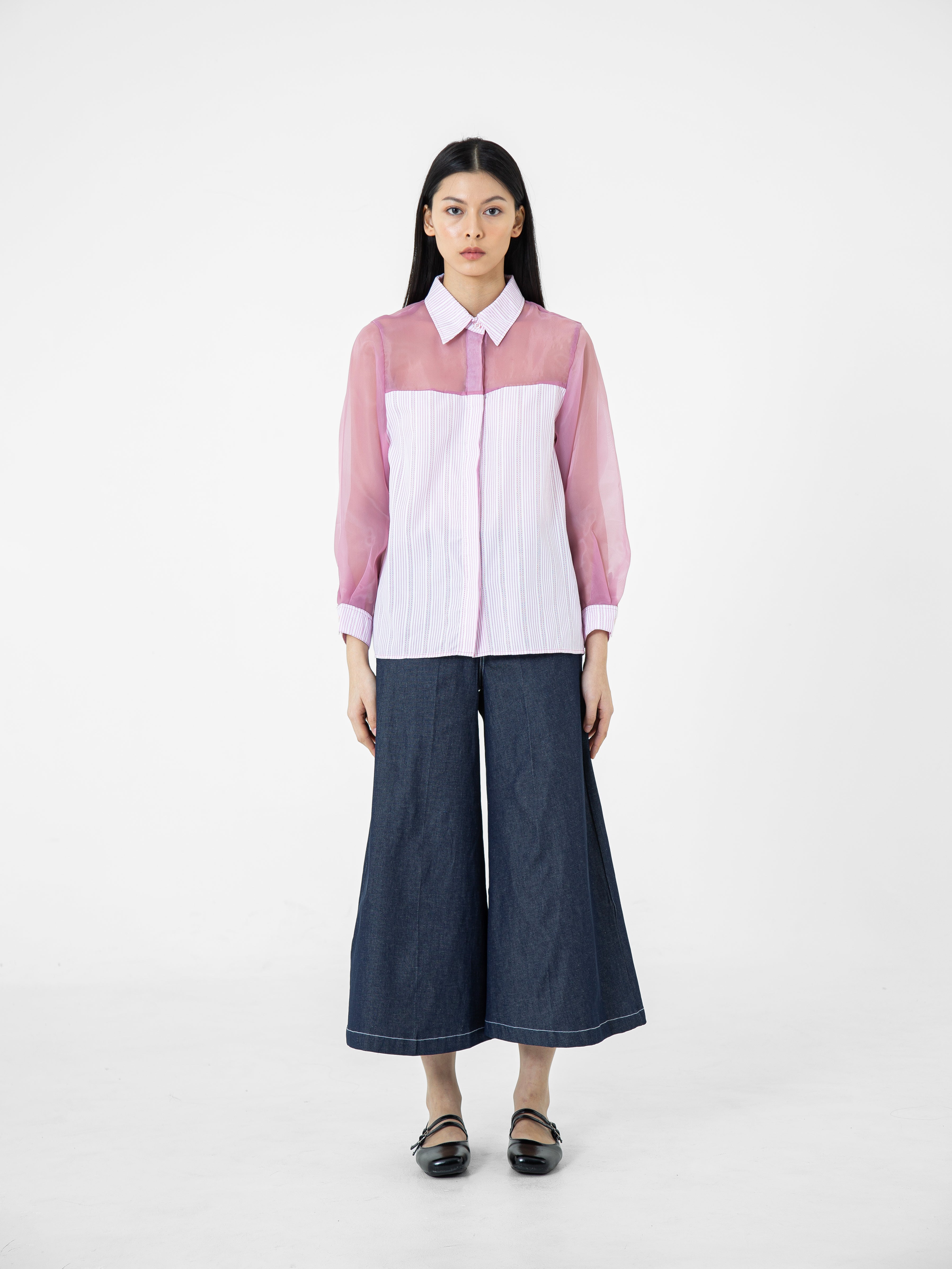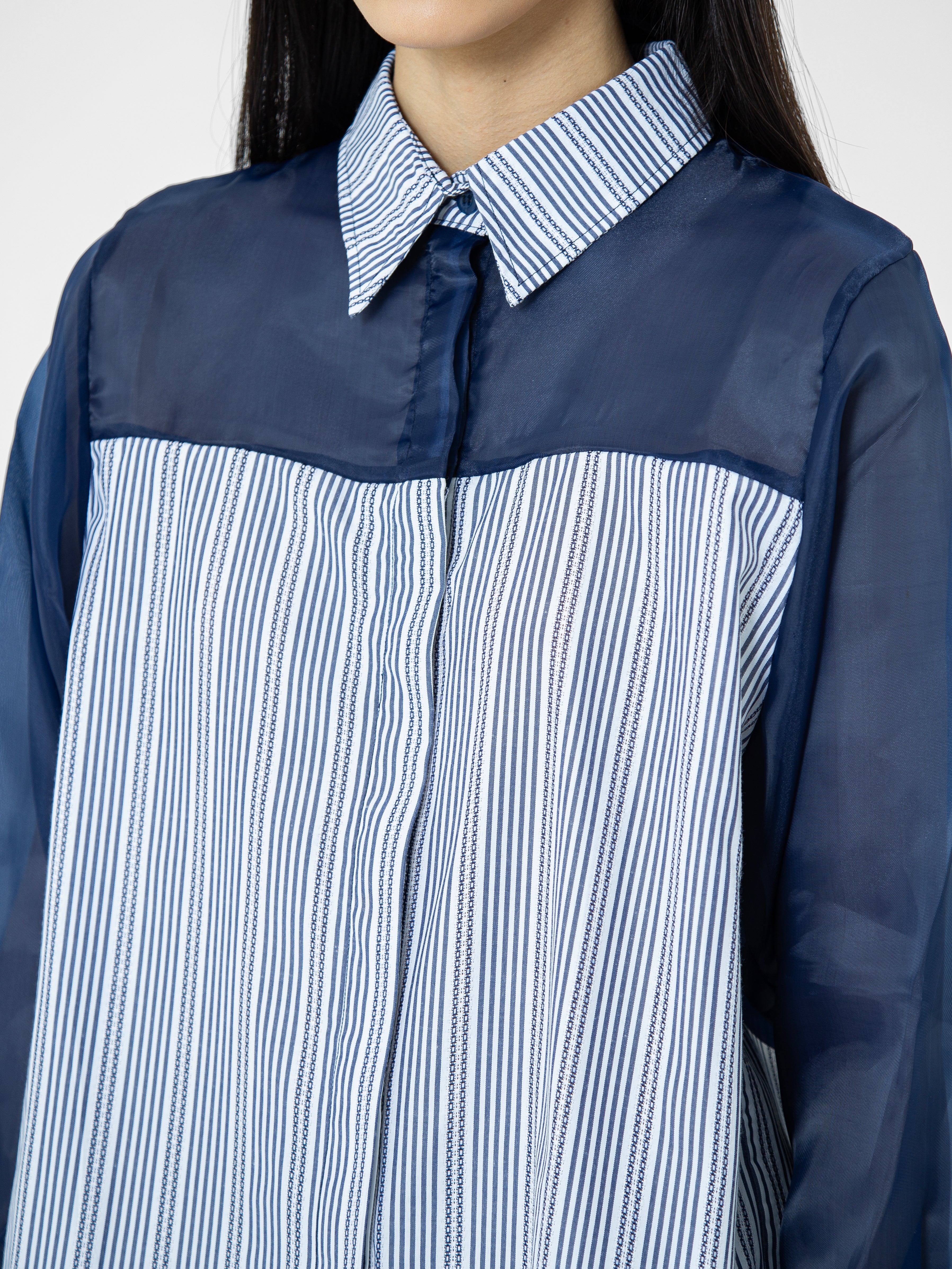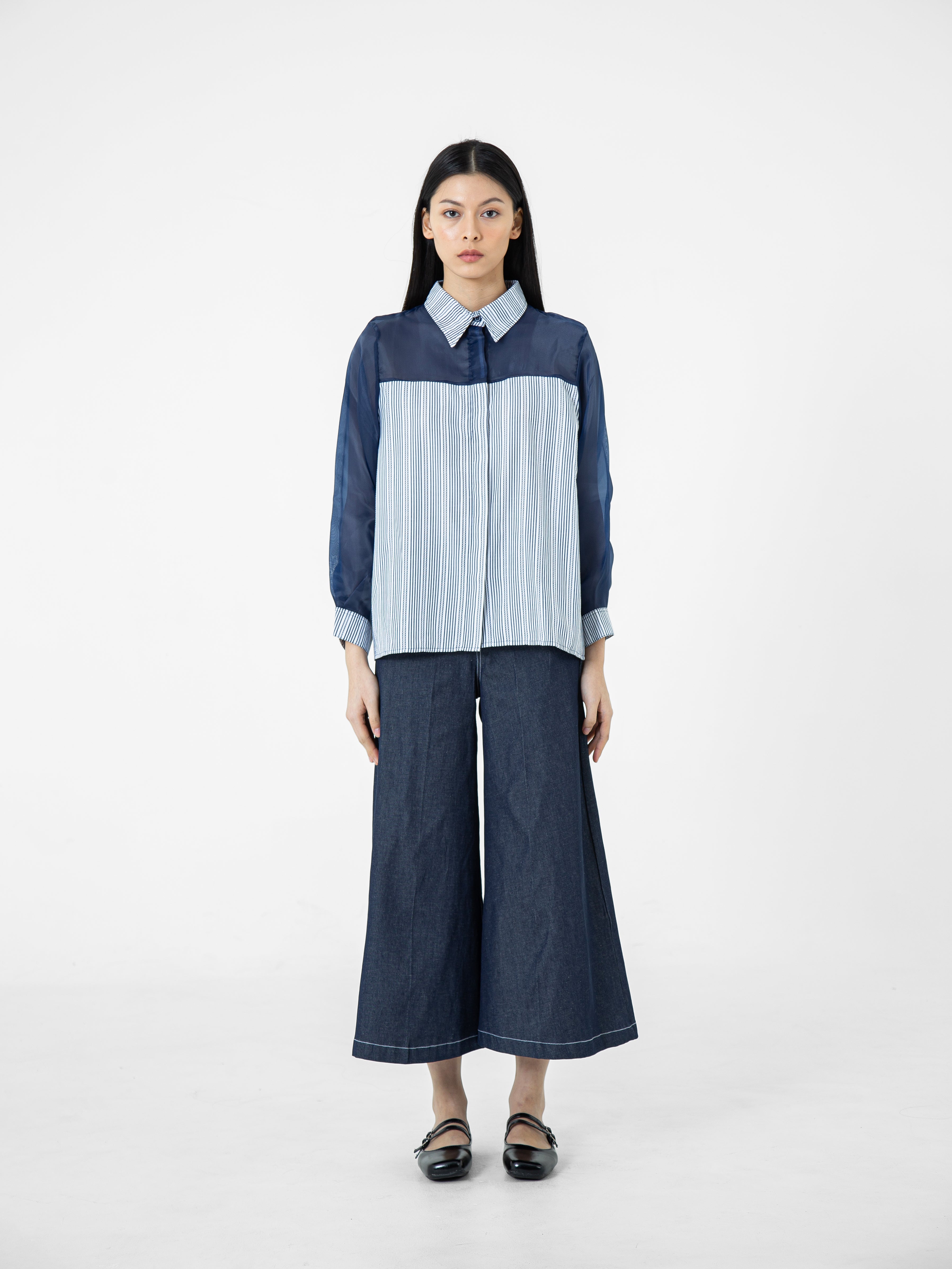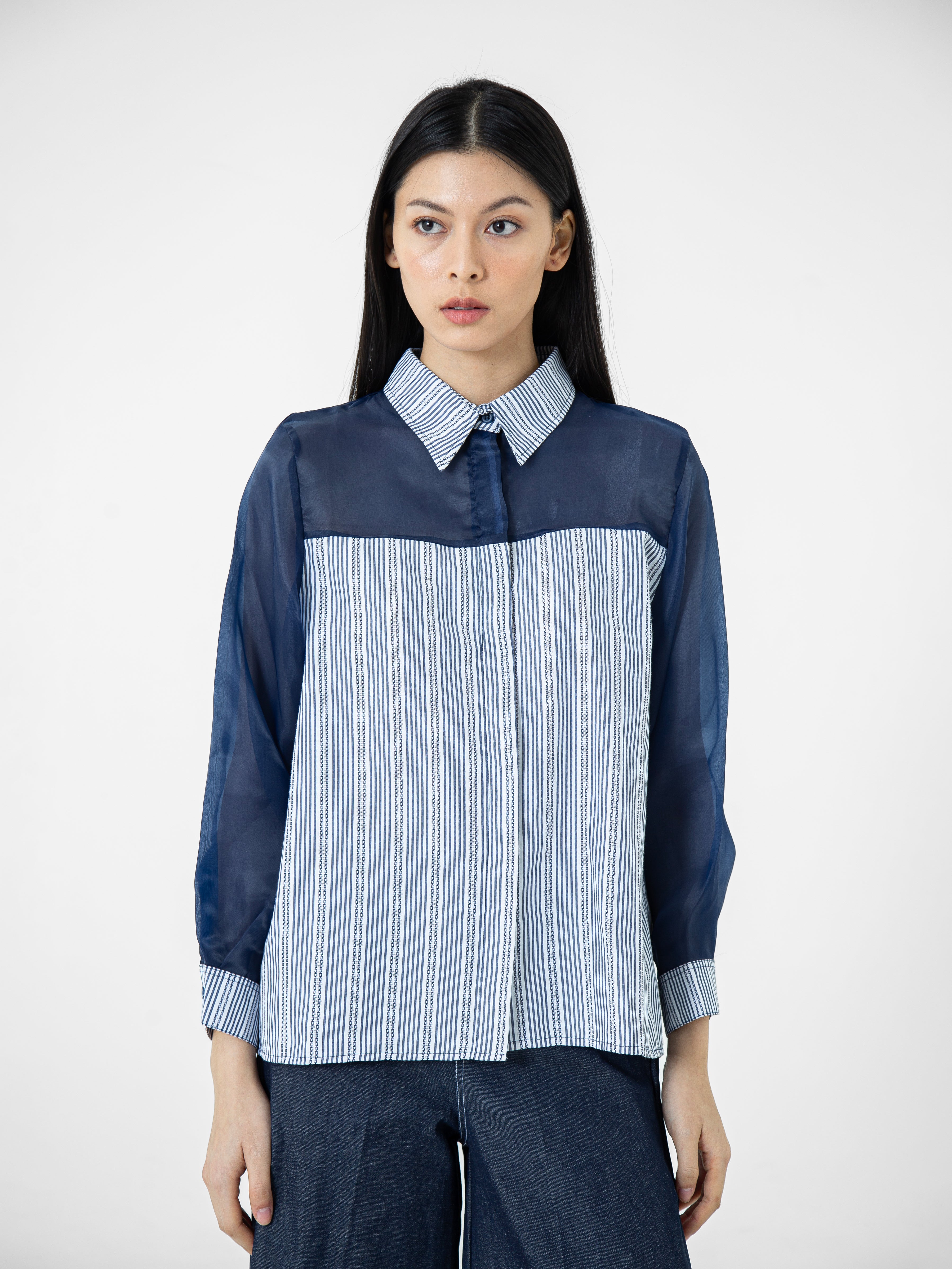 Kemeja wanita lengan panjang ini didesain dengan kerah kemeja. Memiliki dua bahan yang berbeda sehingga memberikan kesan yang elegan. Terdapat kancing tersembunyi di bagian depan. Memiliki bahan yang halus sehingga nyaman saat dipakai. Cocok untuk dikenakan pada acara formal maupun non formal.