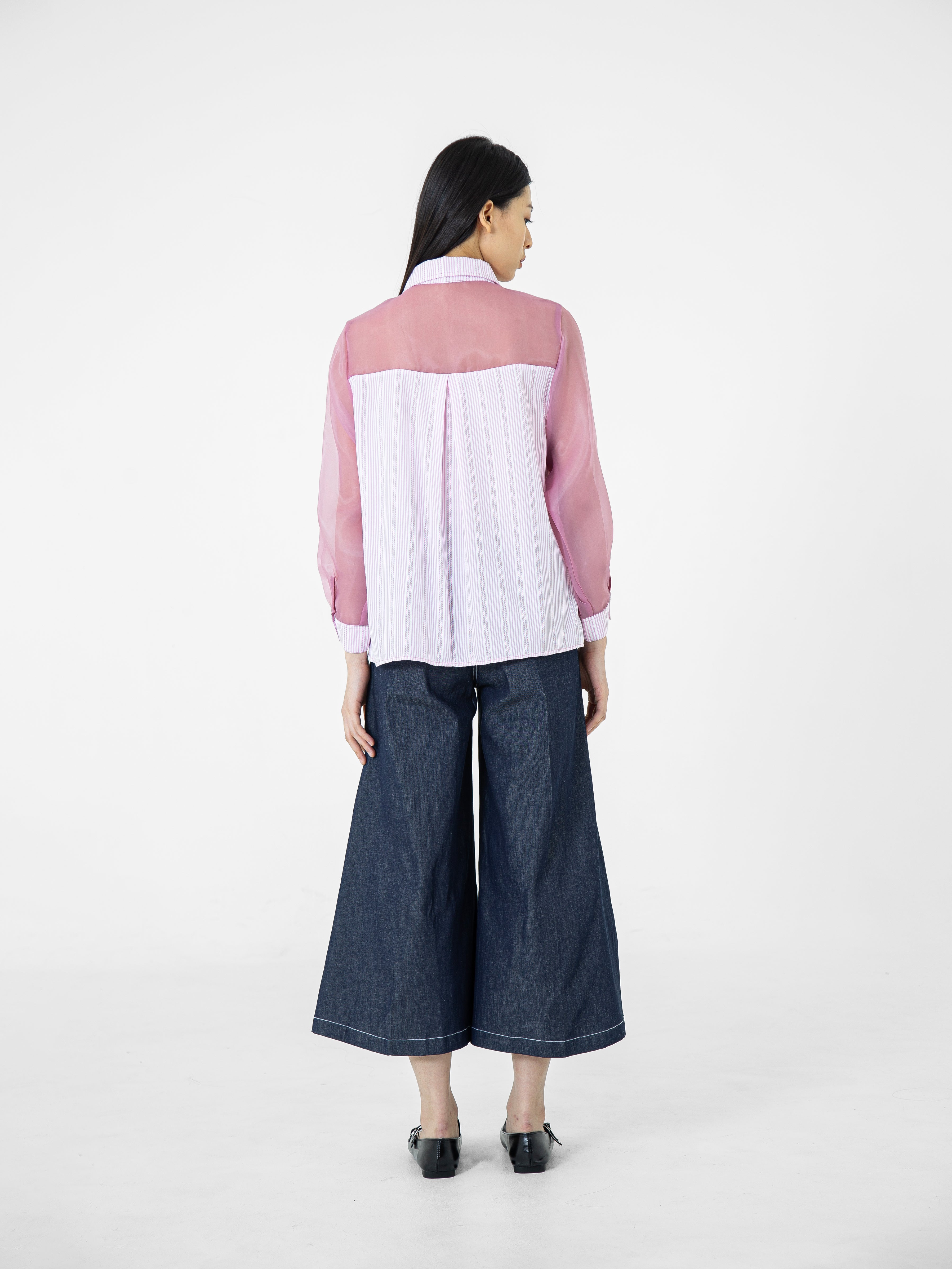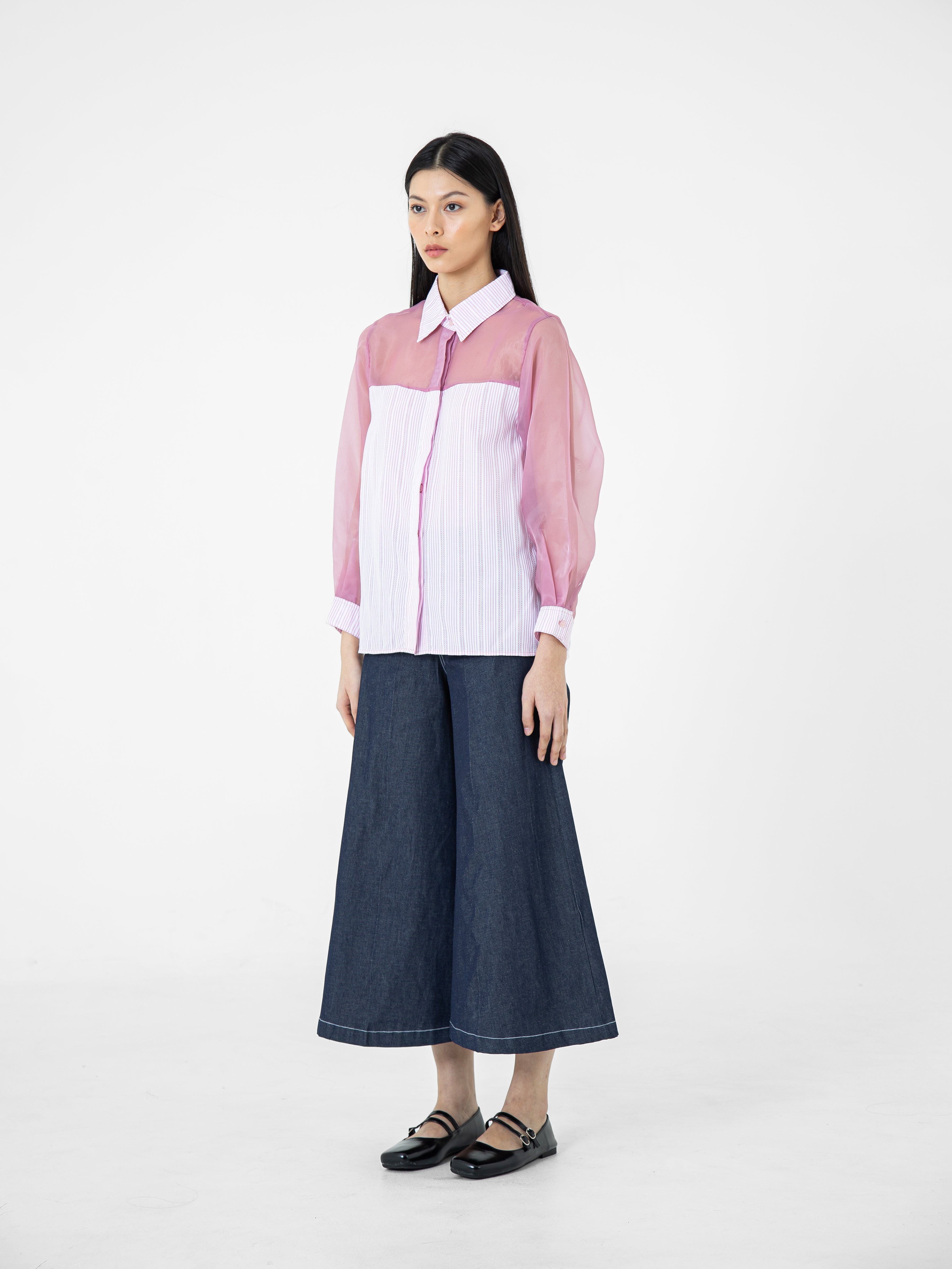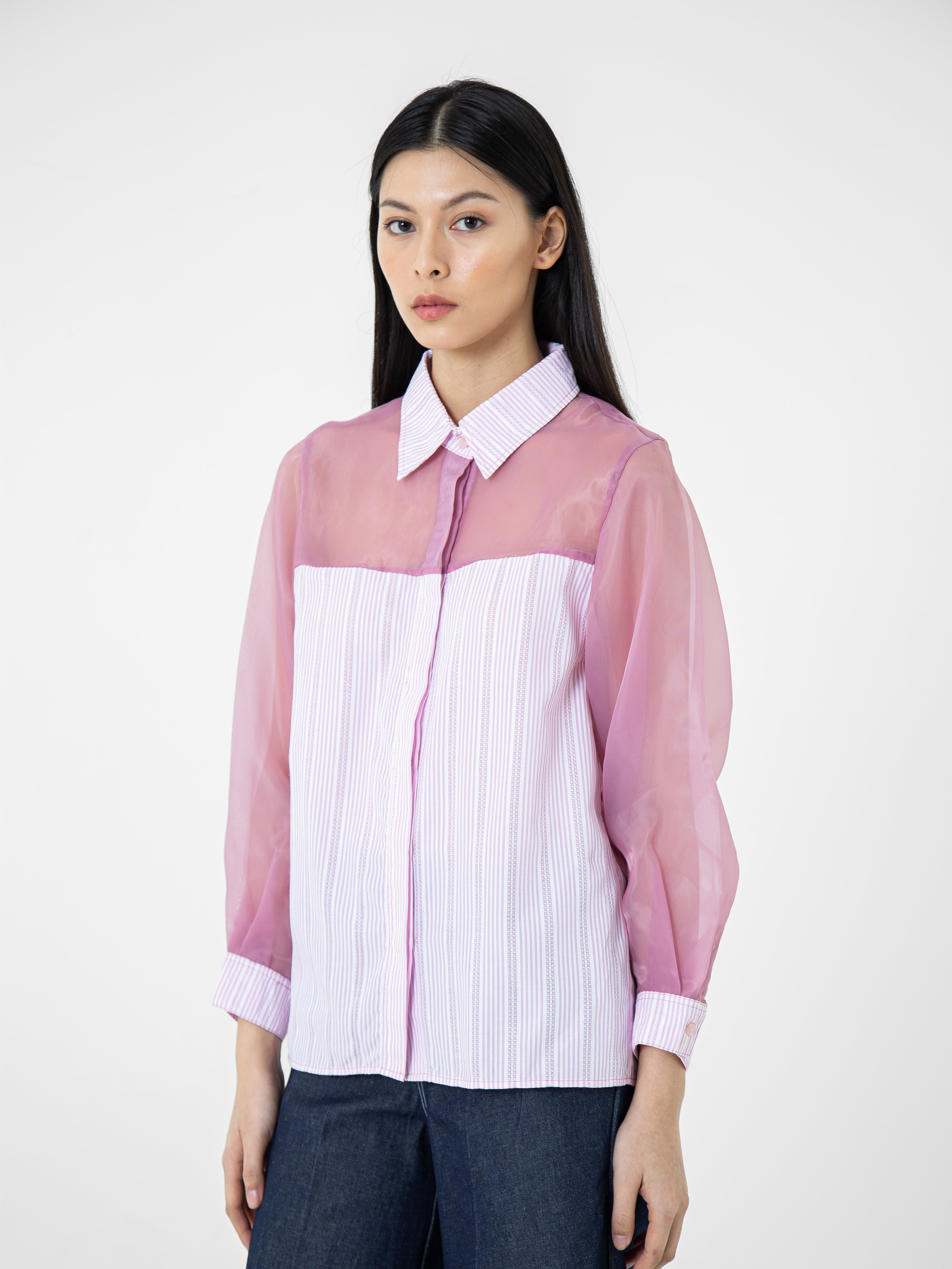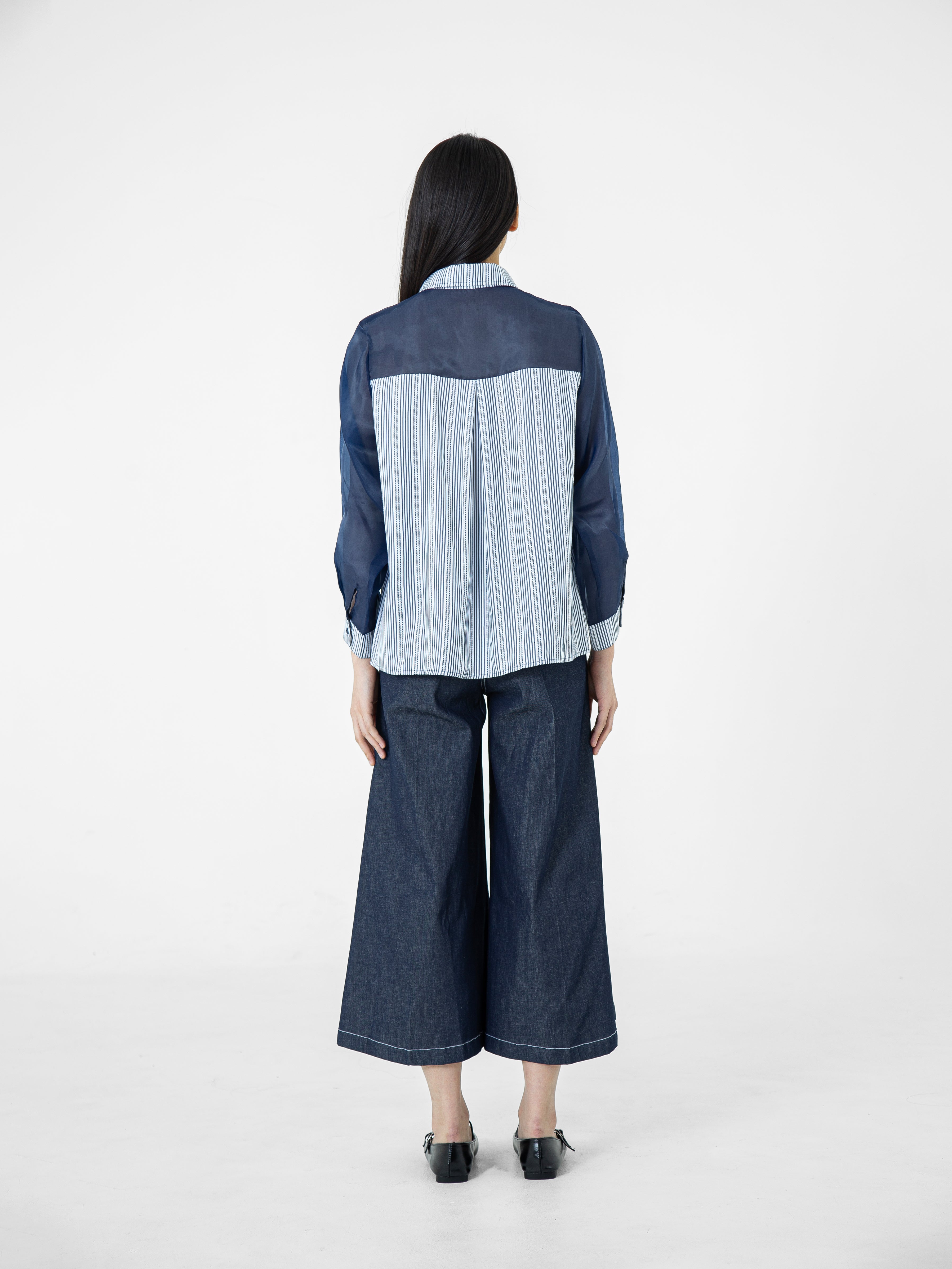 Kemeja wanita lengan panjang ini didesain dengan kerah kemeja. Memiliki dua bahan yang berbeda sehingga memberikan kesan yang elegan. Terdapat kancing tersembunyi di bagian depan. Memiliki bahan yang halus sehingga nyaman saat dipakai. Cocok untuk dikenakan pada acara formal maupun non formal.