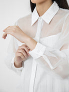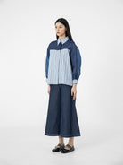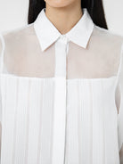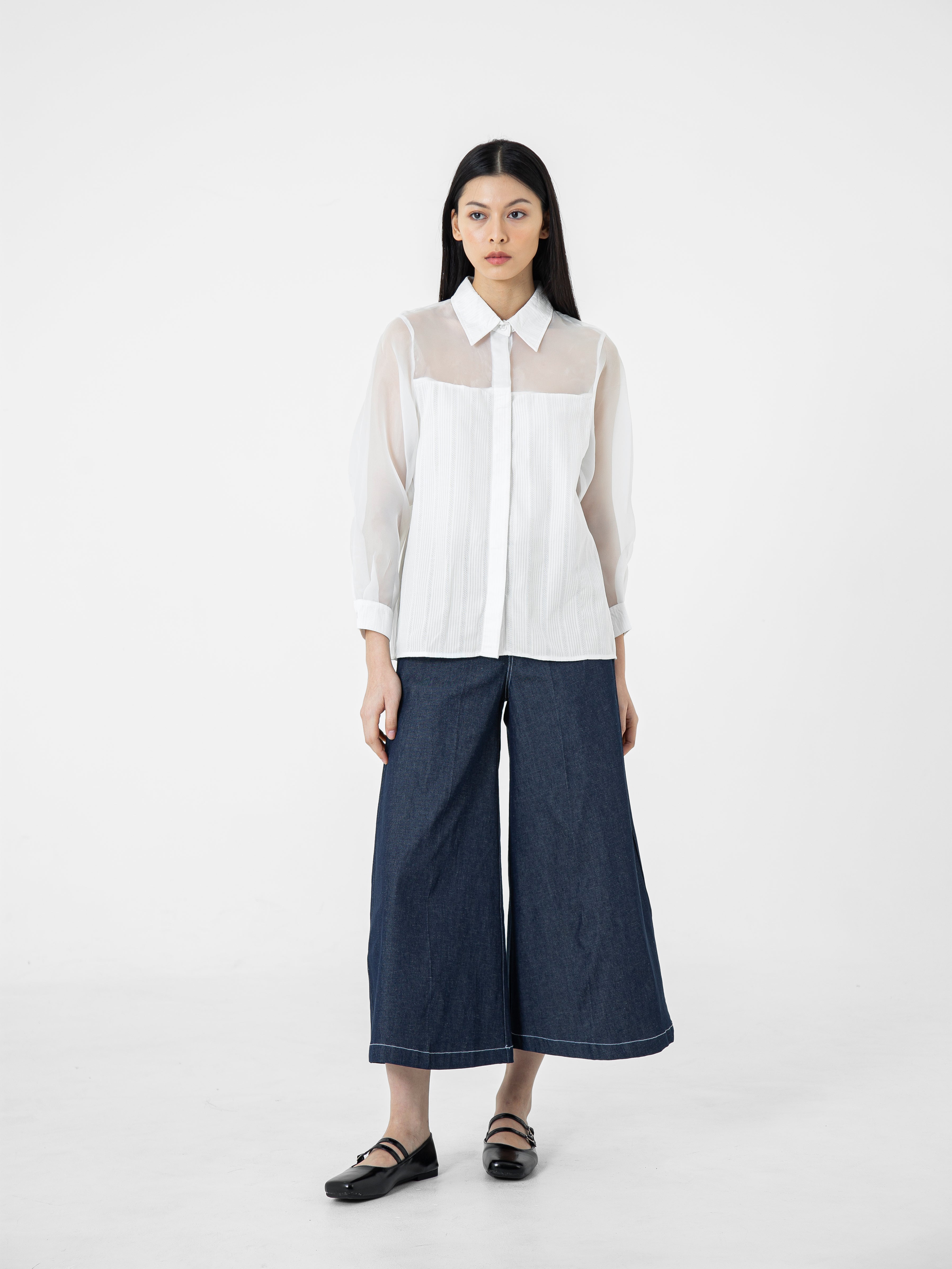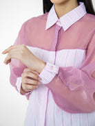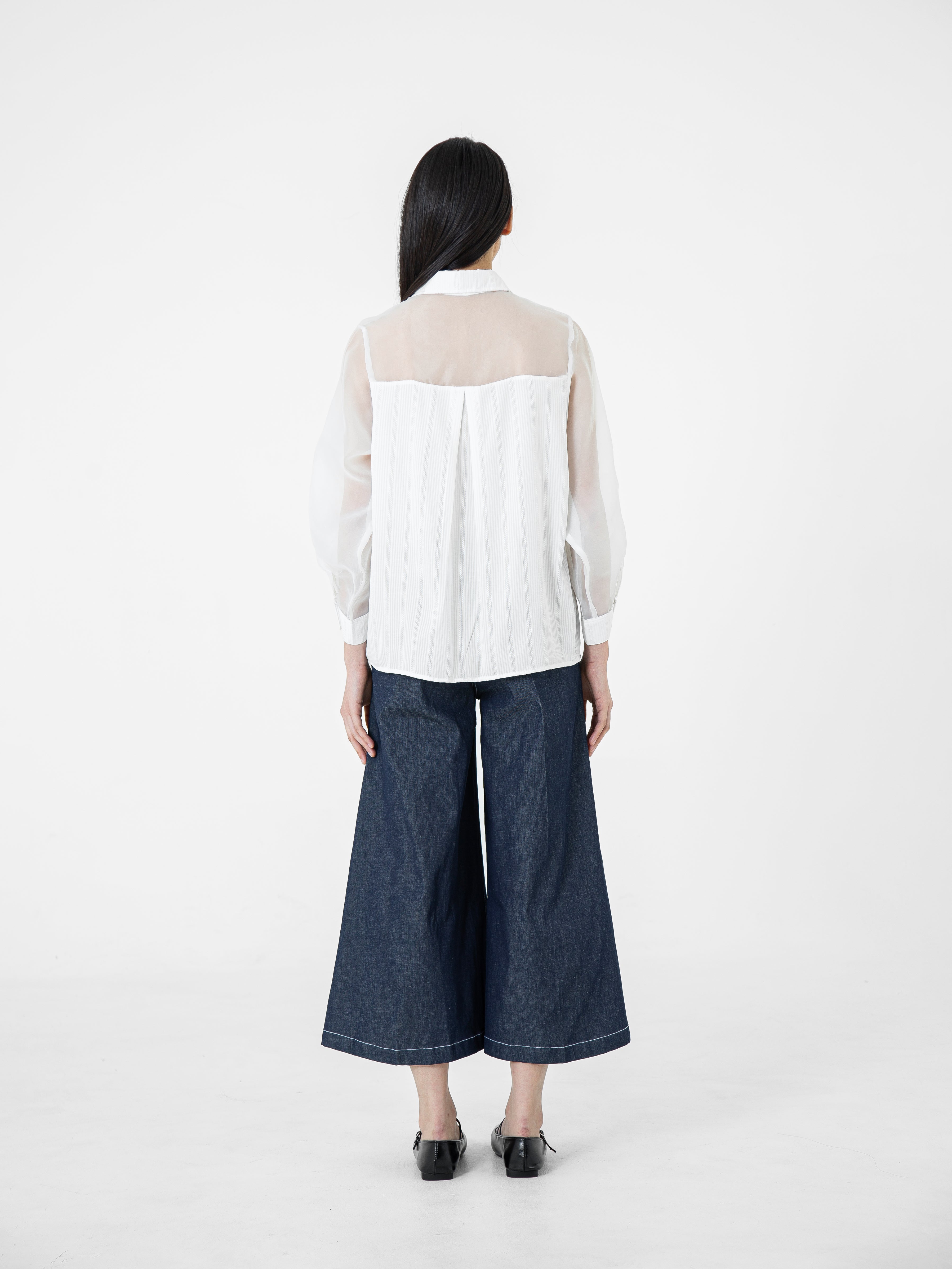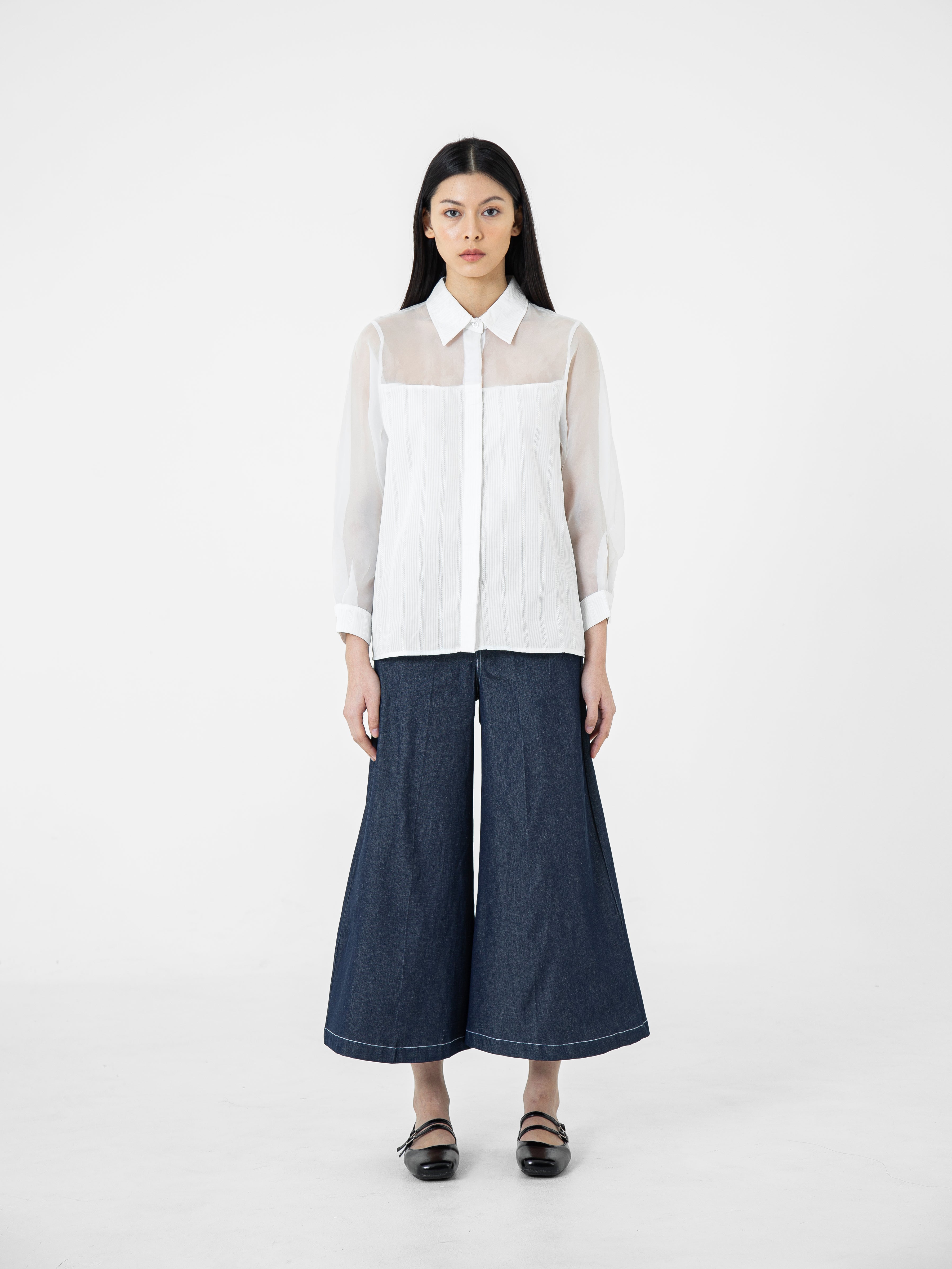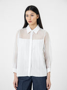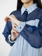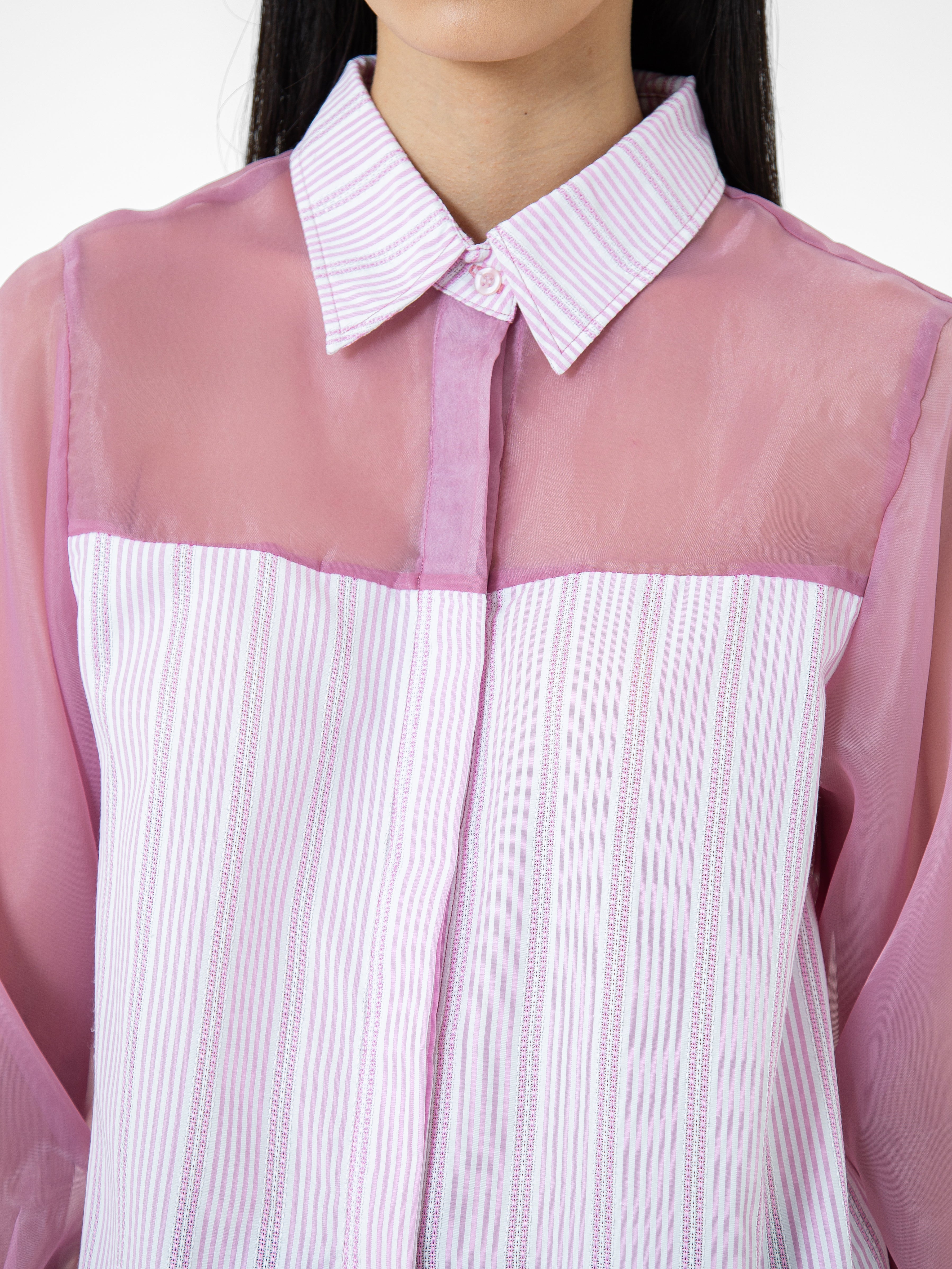 Kemeja wanita lengan panjang ini didesain dengan kerah kemeja. Memiliki dua bahan yang berbeda sehingga memberikan kesan yang elegan. Terdapat kancing tersembunyi di bagian depan. Memiliki bahan yang halus sehingga nyaman saat dipakai. Cocok untuk dikenakan pada acara formal maupun non formal.