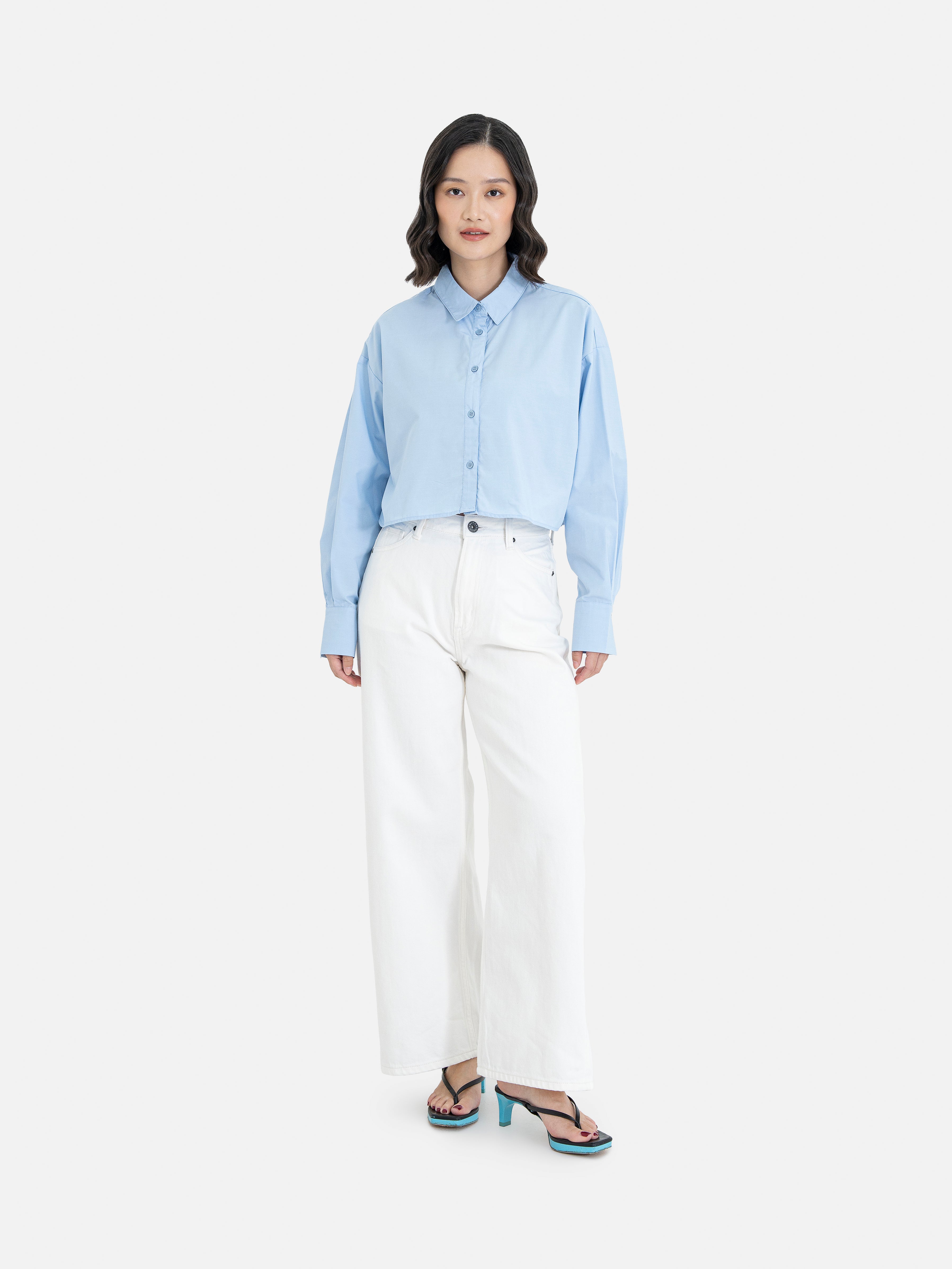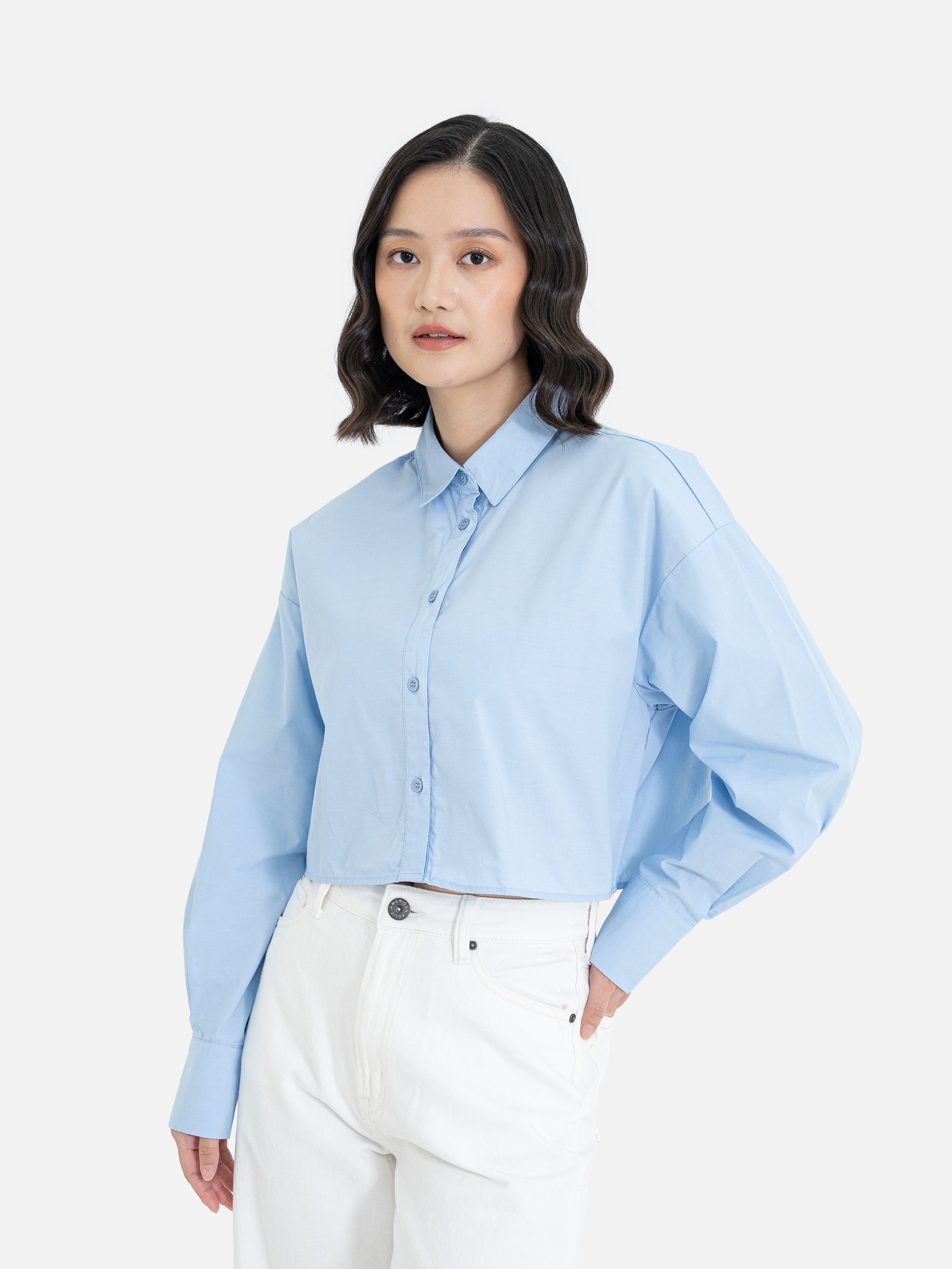 Kemeja wanita lengan panjang dengan model crop, dengan aksen lipit pada bagian lengan yang meberikan kesan rapih dan elegan. Cocok dipakai sebagai outer ataupun sebagai kemeja biasa dengan bawahan high waist.