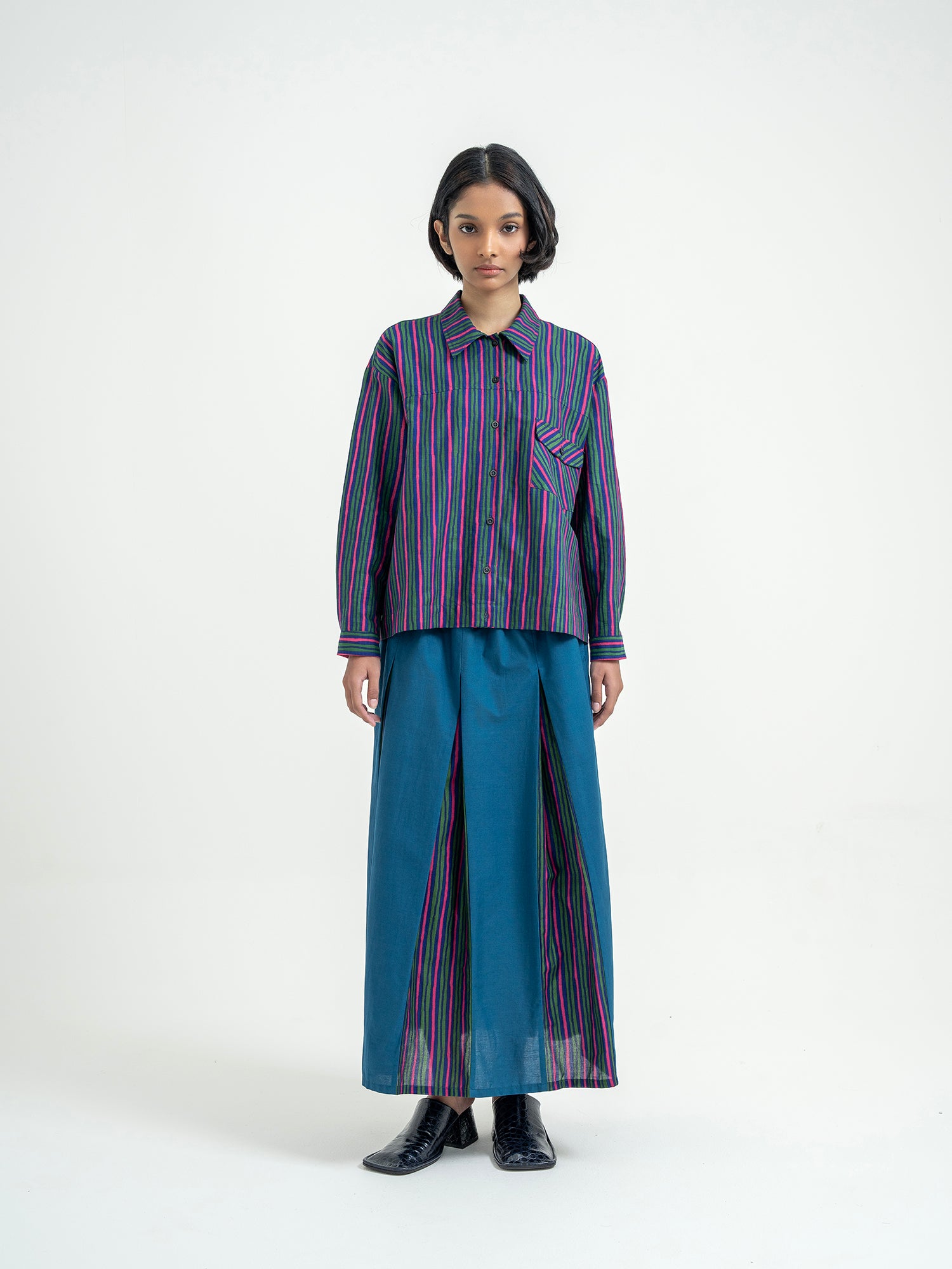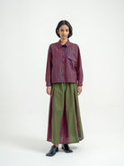 Dhiava Shirt Jacket menampilkan motif garis dengan ritme yang dinamis, memberi aksen statement tanpa terasa berlebihan. Siluet relaxed membuatnya nyaman dipakai sebagai kemeja maupun outer ringan. Dilengkapi detail flap pocket di bagian depan yang menambah sentuhan fungsional sekaligus mempertegas karakter desainnya.