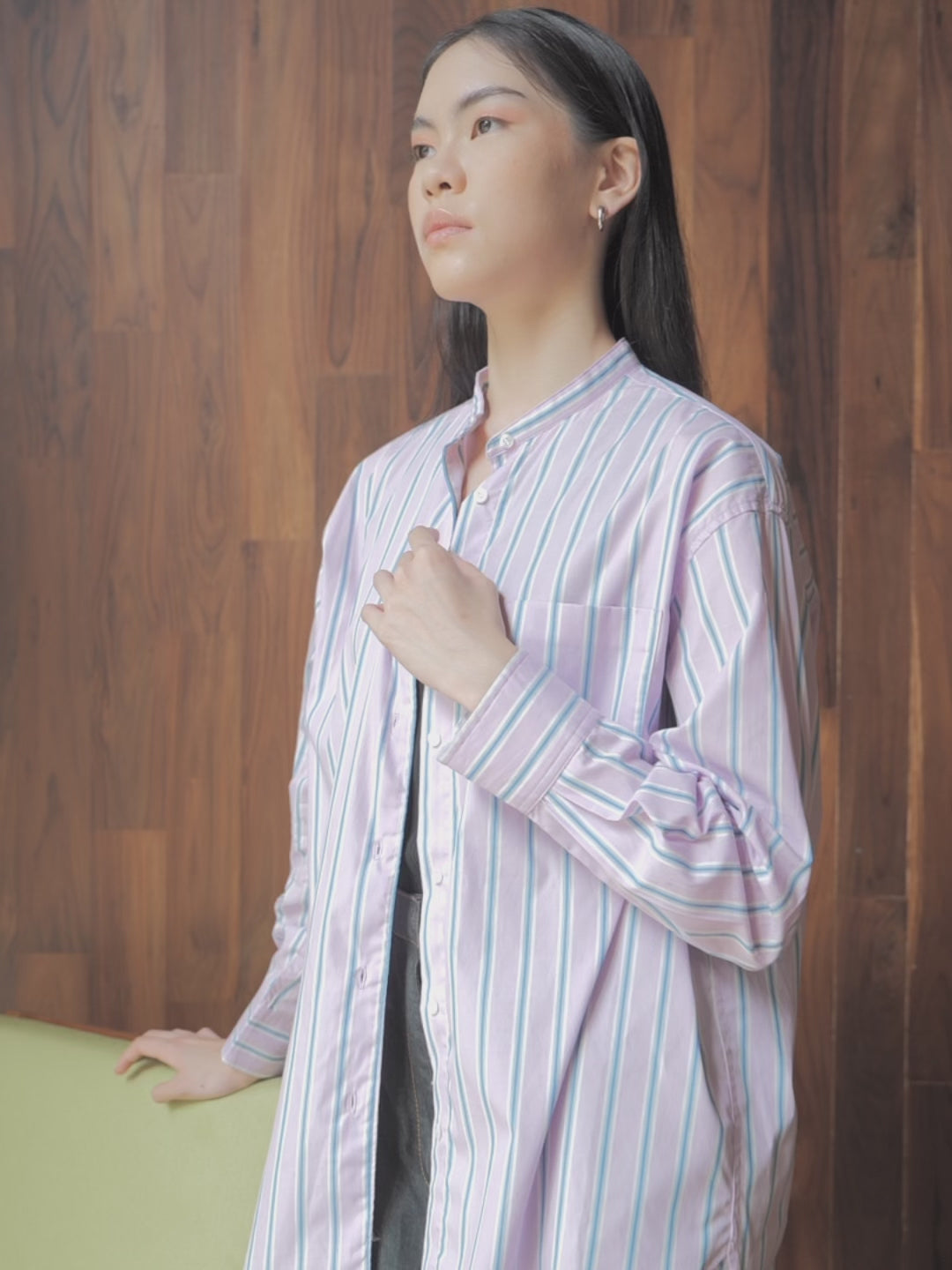 Kemeja wanita ini didesain dengan model kerah sanghai. Memiliki bukaan full kancing pada bagian depan. Terdapat saku depan dan slit di bagian sisi kemeja. Dapat dikenakan sebagai outer maupun kemeja sehari-hari.