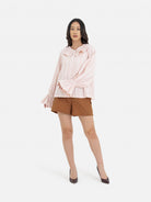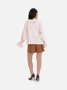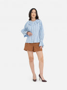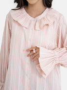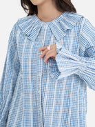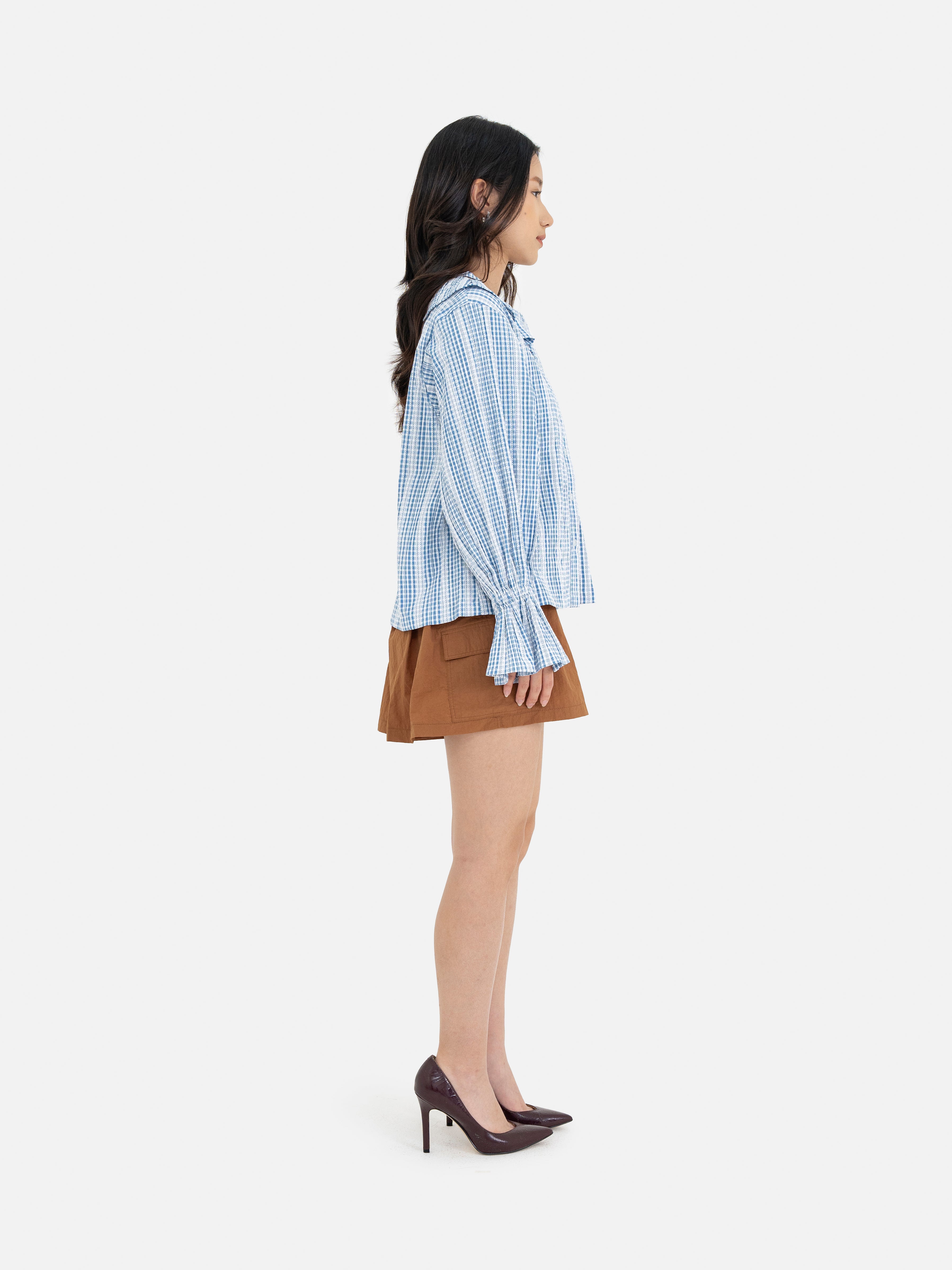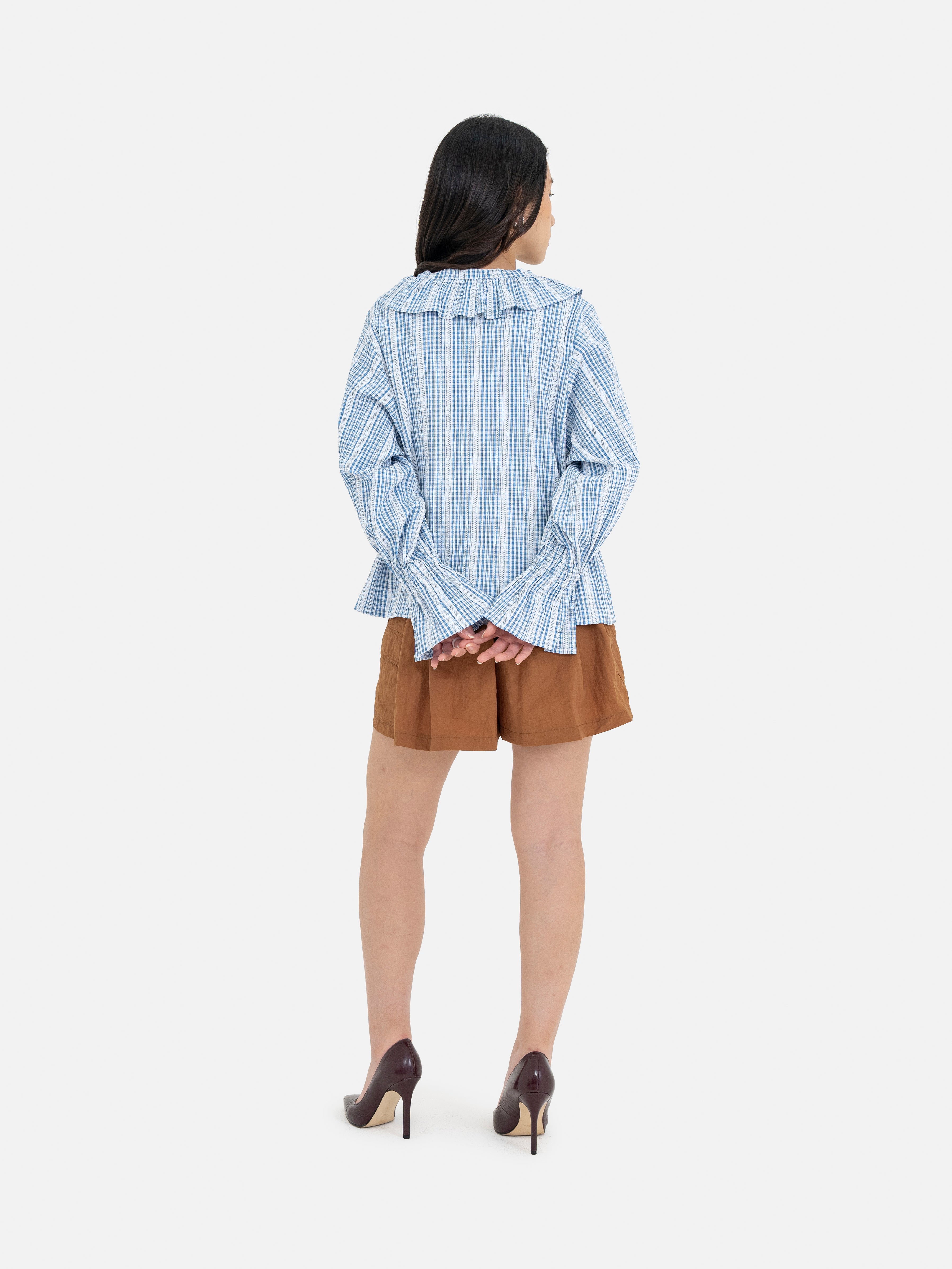 Kemeja wanita dengan desain kasual yang manis, dilengkapi kancing depan dan aksen ruffle pada kerah. Bagian lengan model bell sleeve menambah kesan playful dan unik saat digunakan.