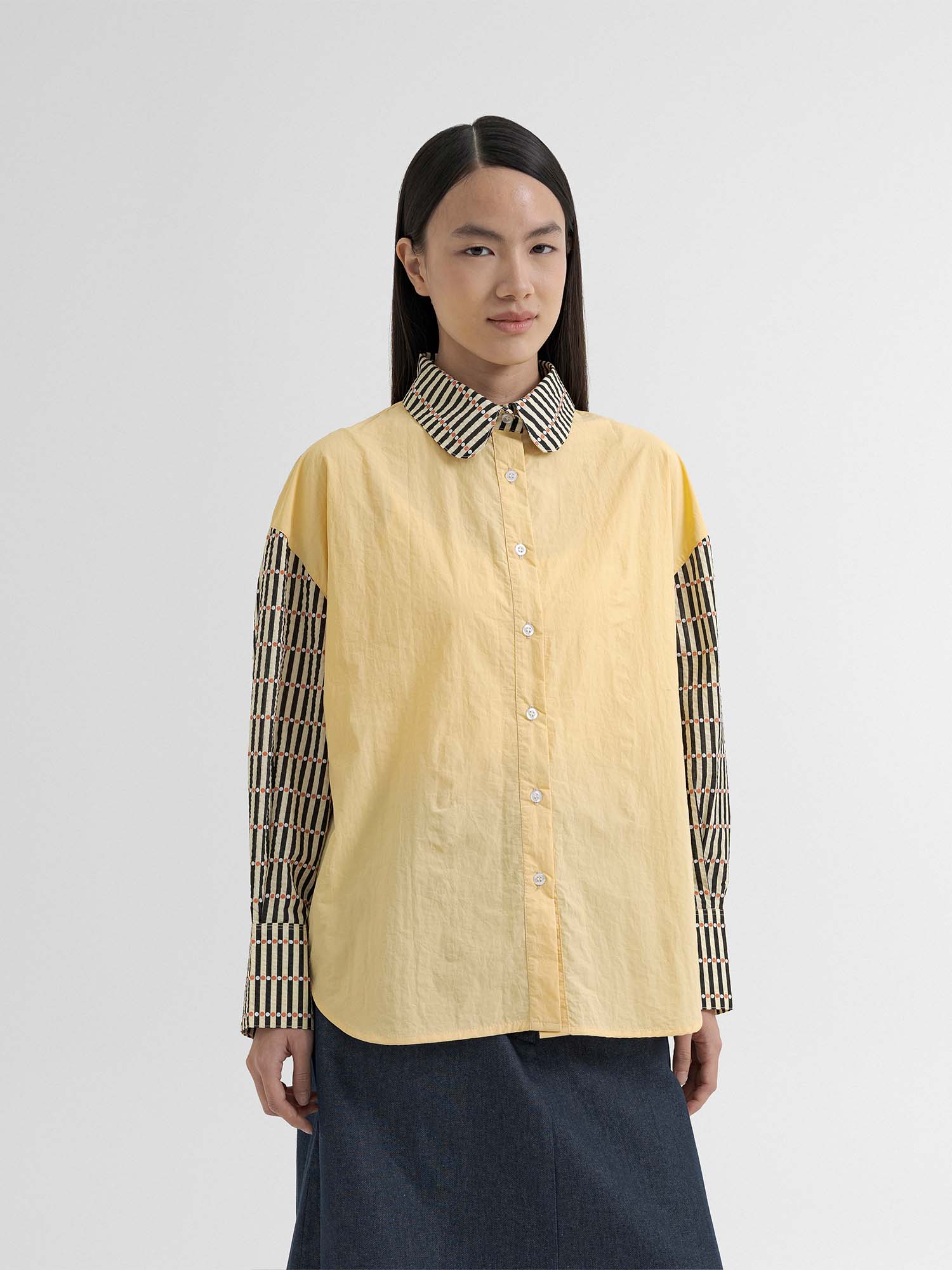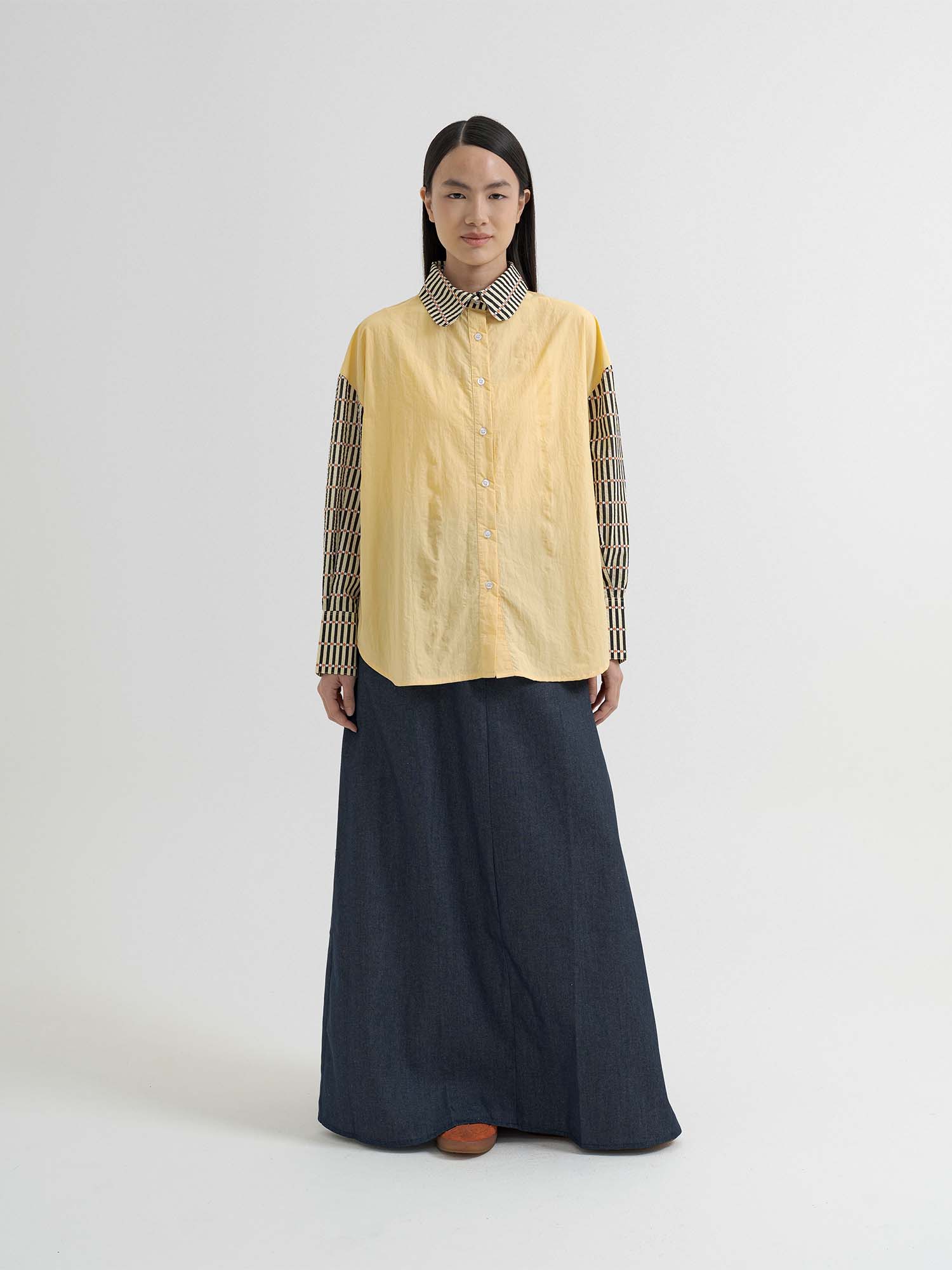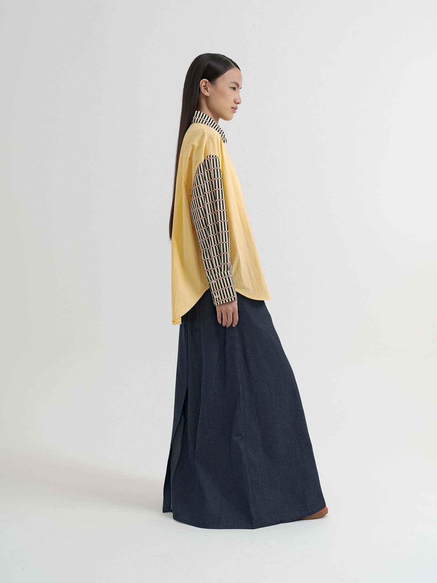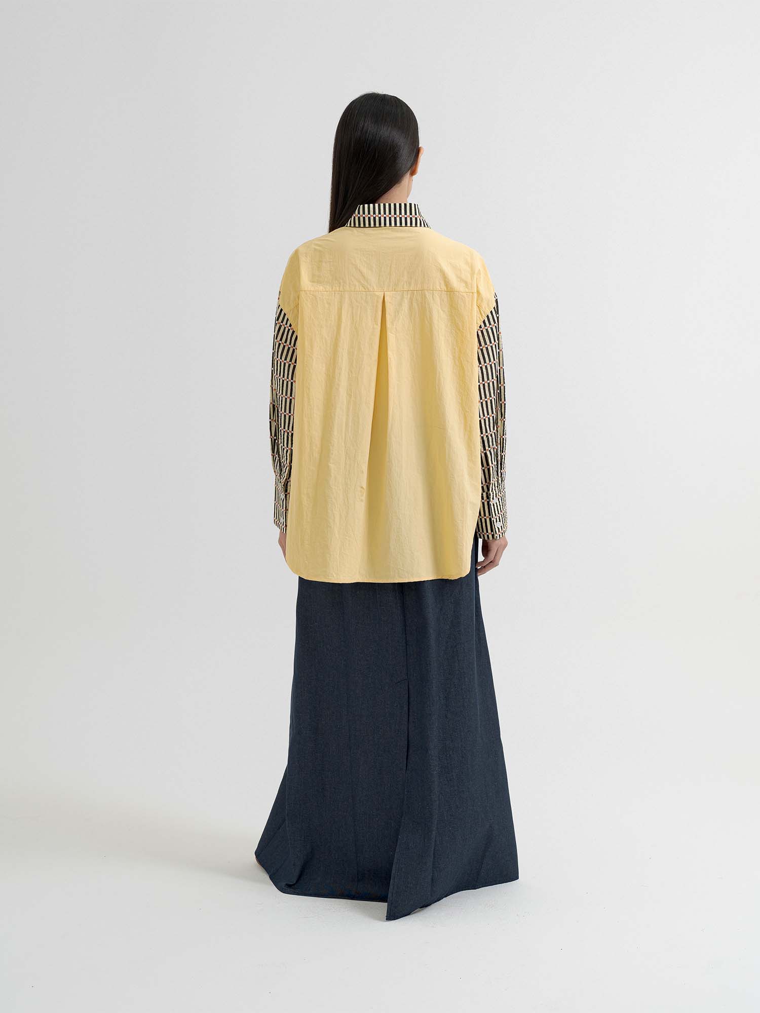 Kemeja dengan desain kombinasi panel polos dan motif yang memberi tampilan unik namun tetap seimbang. Potongan longgar dengan detail lipit di bagian belakang menciptakan siluet yang nyaman dan flowy saat dikenakan. Cocok untuk tampilan kasual rapi maupun gaya semi-formal dengan sentuhan statement yang subtle.