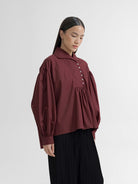 Kemeja wanita dengan desain longgar dan elegan, dibuat dari bahan cotton cashmere yang lembut dan adem di kulit. Dilengkapi dengan aksen lipit di bagian depan dan belakang, serta kerah lebar dan detail kancing mungil yang memberikan sentuhan manis dan feminin.
