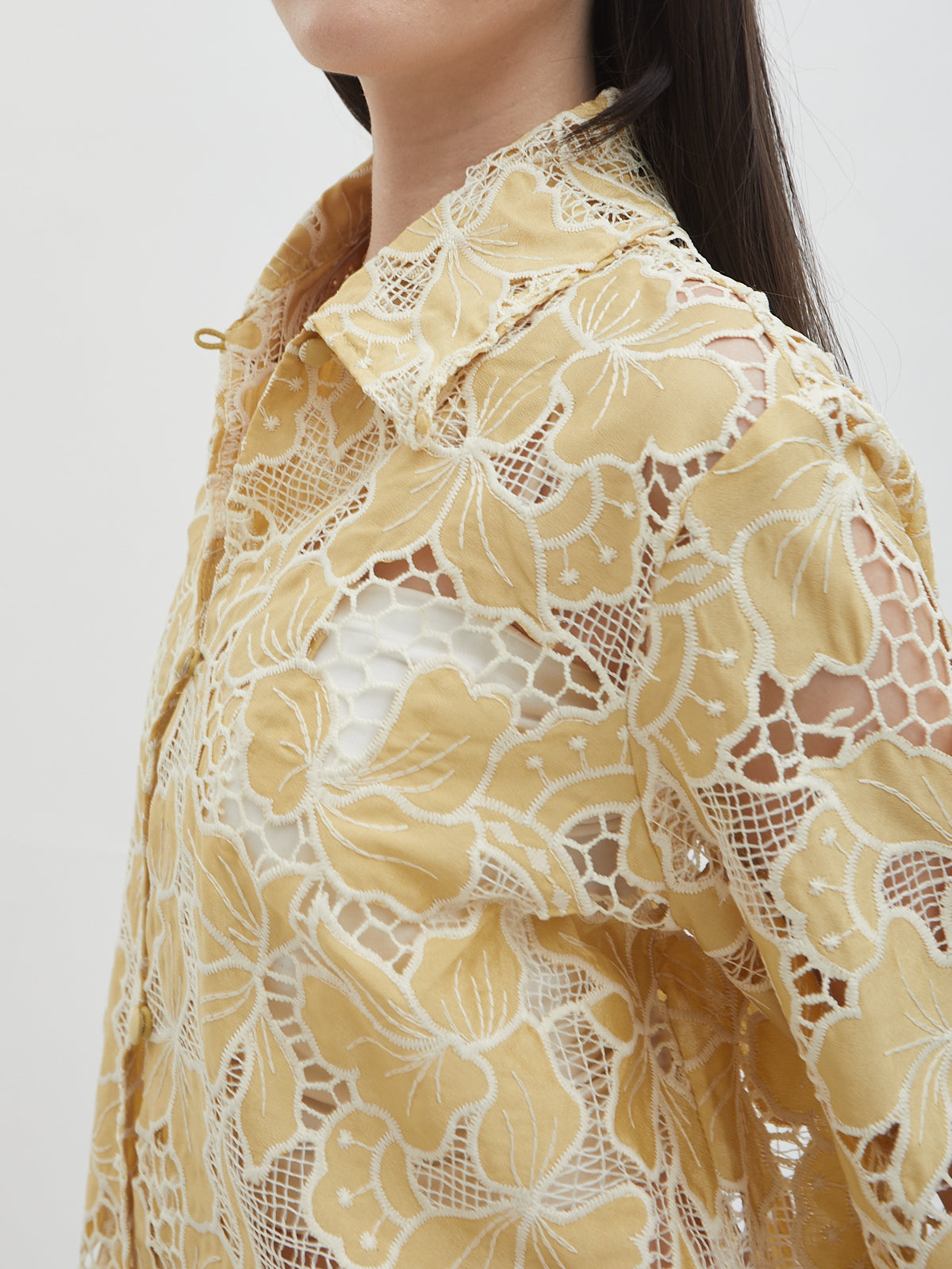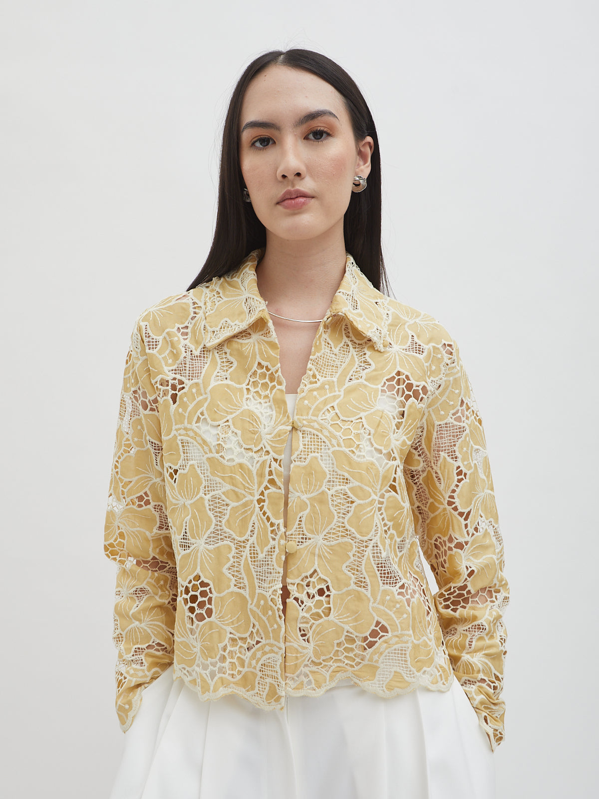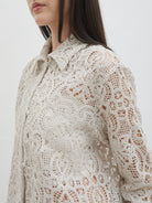 Laily Crop Shirt menghadirkan tampilan elegan dengan sentuhan brokat dan crochet yang memberikan tekstur mewah. Desainnya dibuat dengan siluet longgar dan panjang crop, menciptakan kesan feminin sekaligus modern.