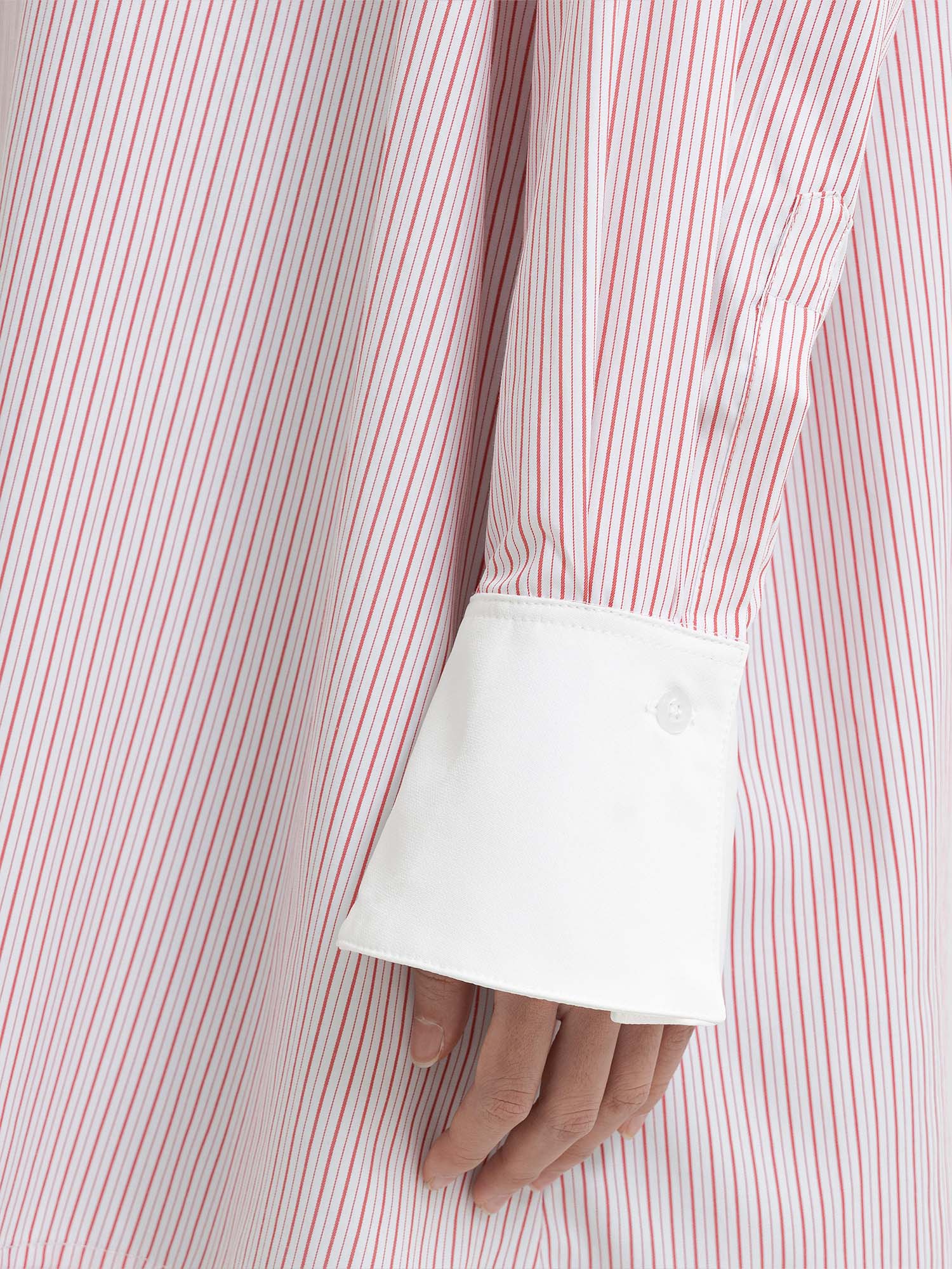 Kemeja bergaya modern dengan siluet longgar yang memberikan tampilan effortless tetapi tetap rapi. Detail kerah tegak dan manset putih kontras membuat look terlihat clean dan elegan. Panjangnya yang menutupi pinggul memberikan kenyamanan ekstra, cocok untuk gaya kasual hingga formal.