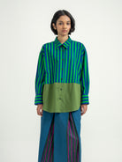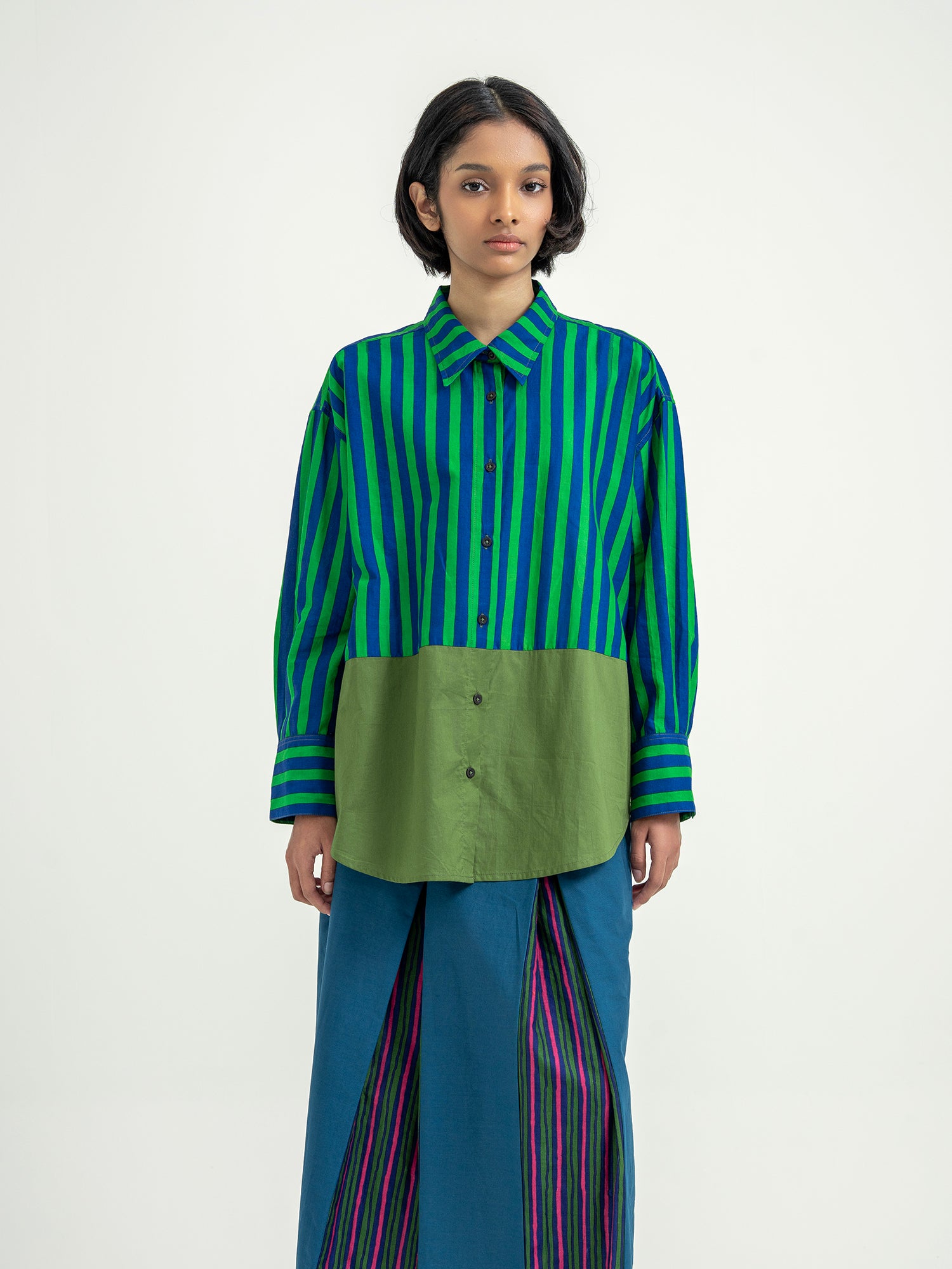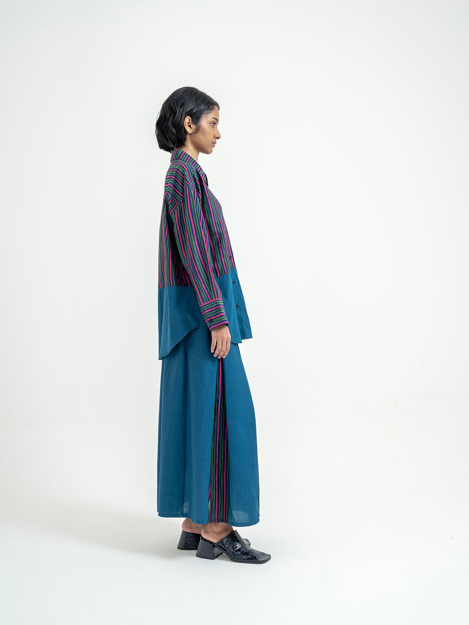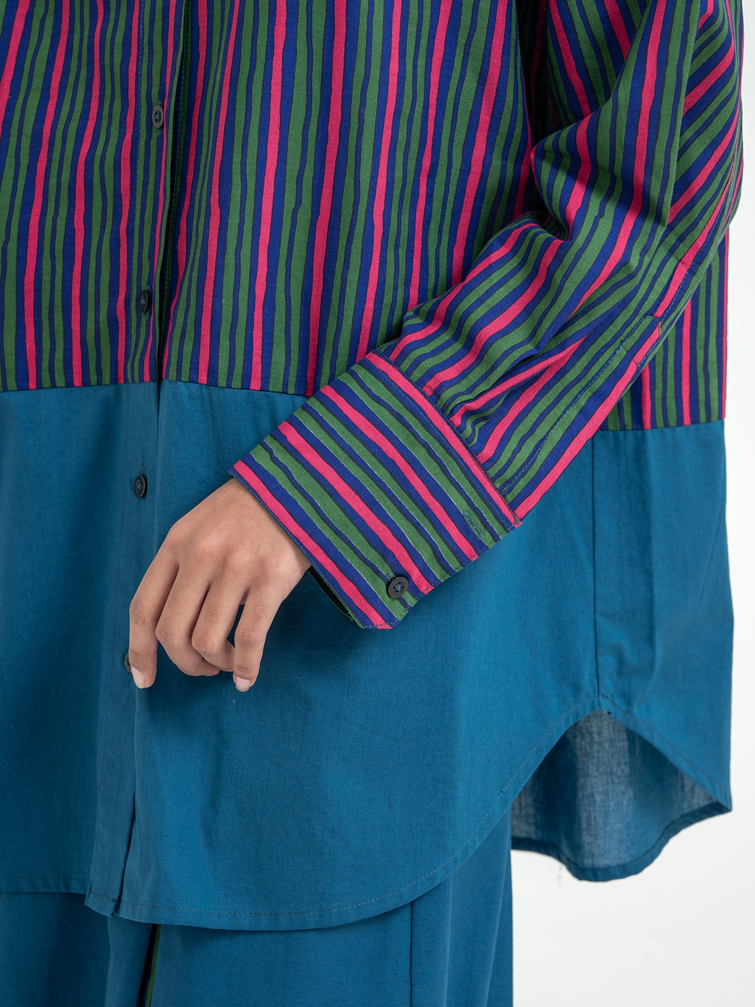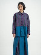 Kemeja Rhea Shirt dari BOWN Capsule Collection menampilkan desain garis vertikal bernuansa biru indigo dengan sentuhan kontras di bagian bawah. Terbuat dari 100% katun yang lembut dan breathable, kemeja ini memberikan tampilan kasual namun tetap elegan. Potongan longgar dan siluet boxy menciptakan kenyamanan maksimal, cocok dipadukan dengan rok maupun celana untuk tampilan santai yang berkarakter.