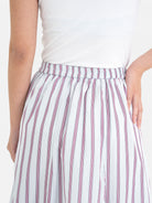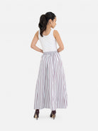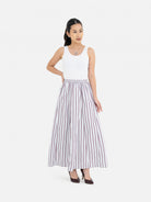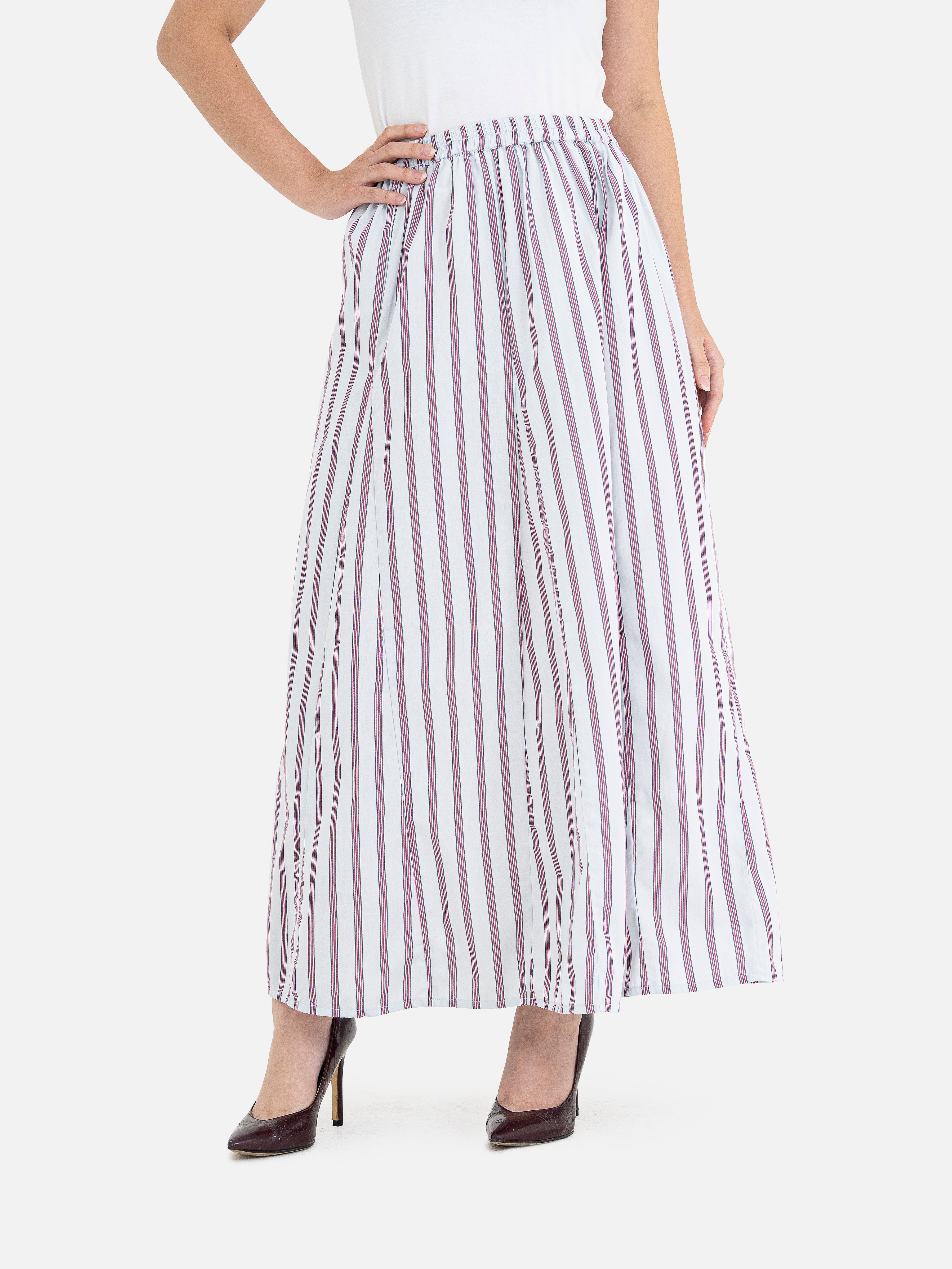 Rok ini hadir dengan siluet A-line yang melebar ke bawah, memberi tampilan feminin yang anggun. Motif garis vertikal juga membantu menciptakan ilusi tubuh lebih jenjang.