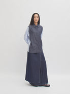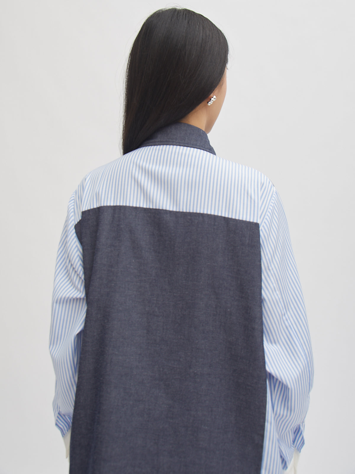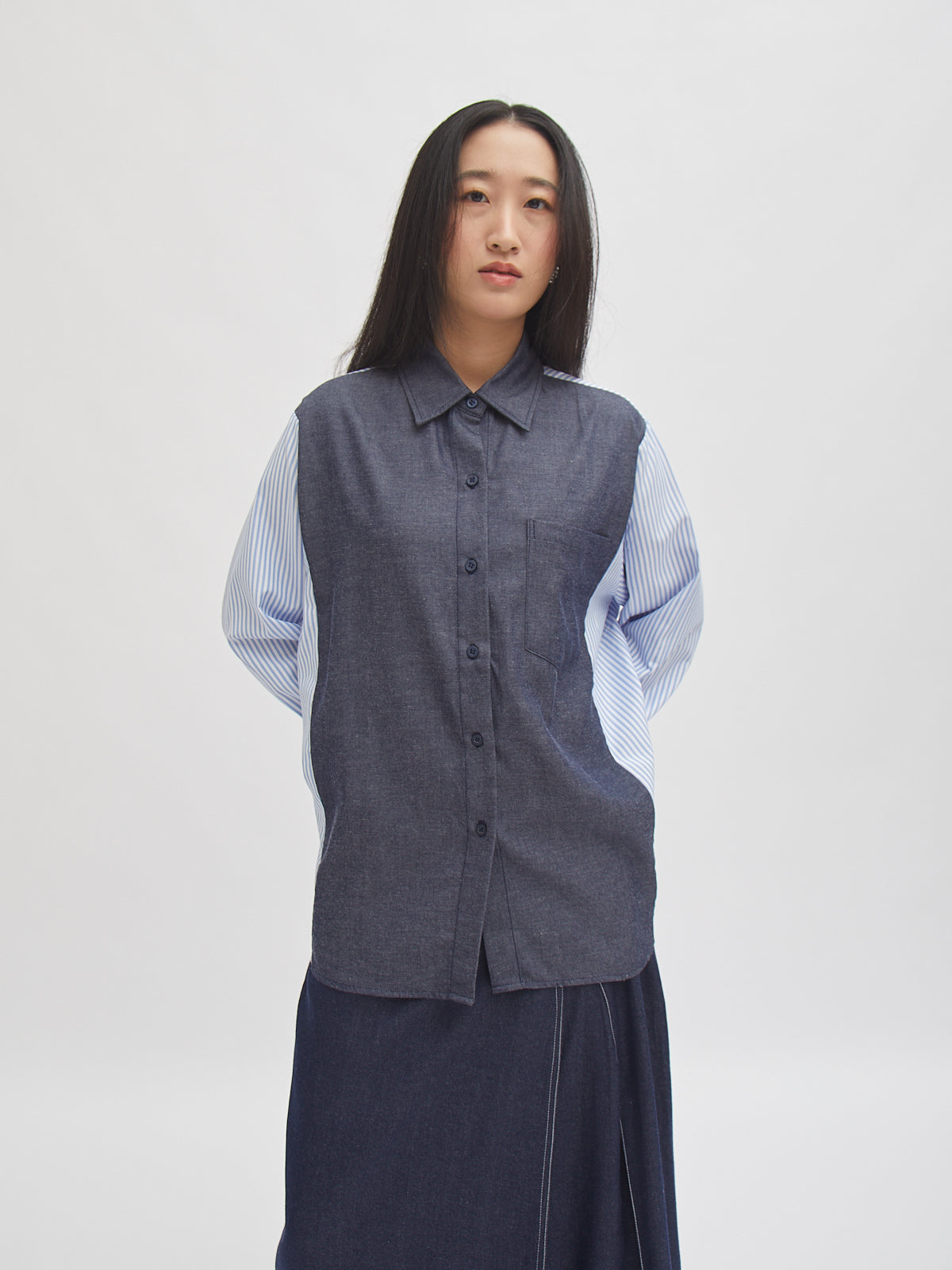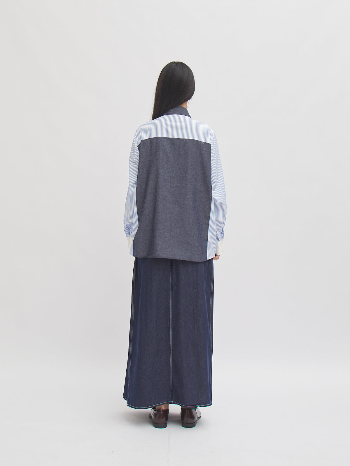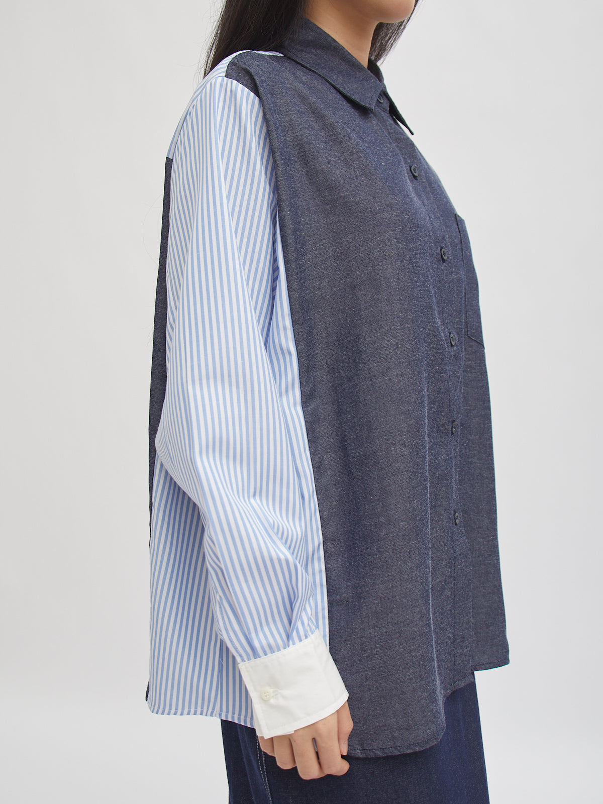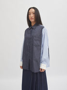 Kemeja lengan panjang dengan desain kombinasi dua motif—denim look pada bagian depan dan belakang, serta lengan bergaris yang memberikan kesan modern dan unik. Potongan longgar dan bahan katun membuatnya nyaman dipakai seharian. Cocok untuk gaya kasual maupun semi-formal.