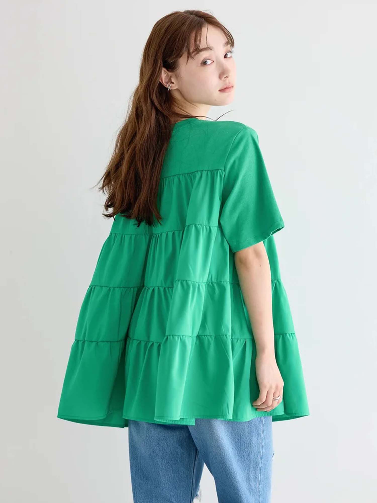 Atasan wanita lengan pendek ini terbuat dari 2 bahan yang berbeda perpaduan antara knit dan jersey, di desain dengan cutting bervolume serta model ruffle berundak yang cantik, Padukan dengan celana untuk tampilan kasual maupun rok untuk tampilan yang lebih feminin.
