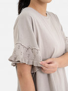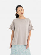 Blouse kasual ini tampil chic dengan detail ruffle cantik pada bagian lengan, menciptakan siluet girly yang tetap simpel. Cocok untuk gaya santai maupun semi formal, mudah dipadupadankan dengan rok maupun celana. Terbuat dari kombinasi bahan nyaman: