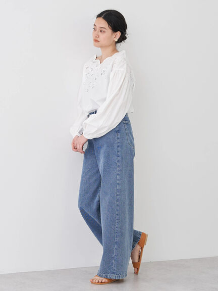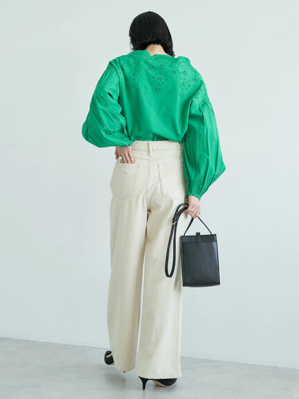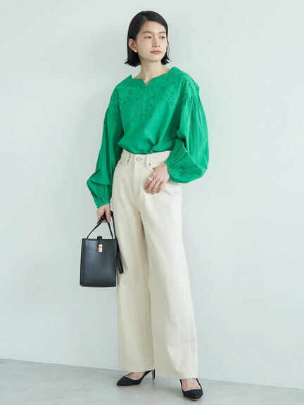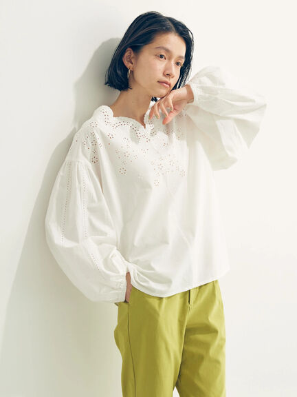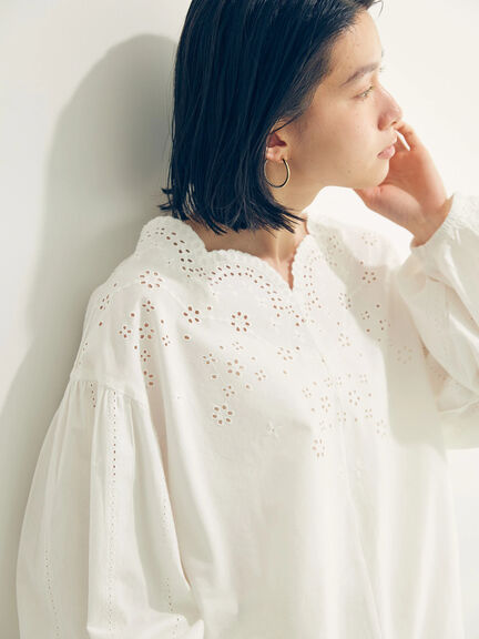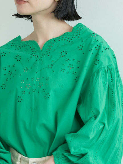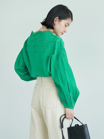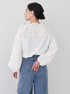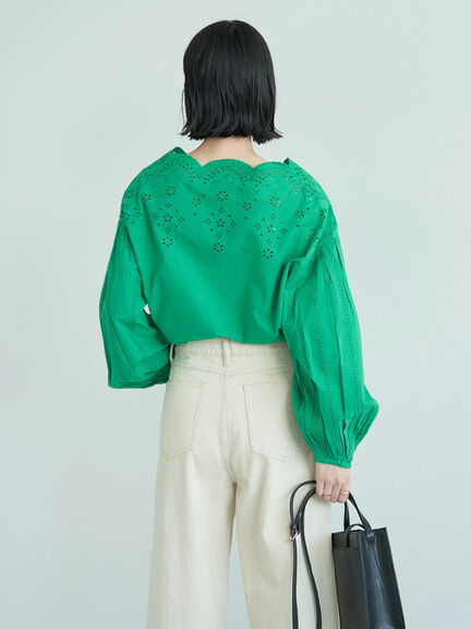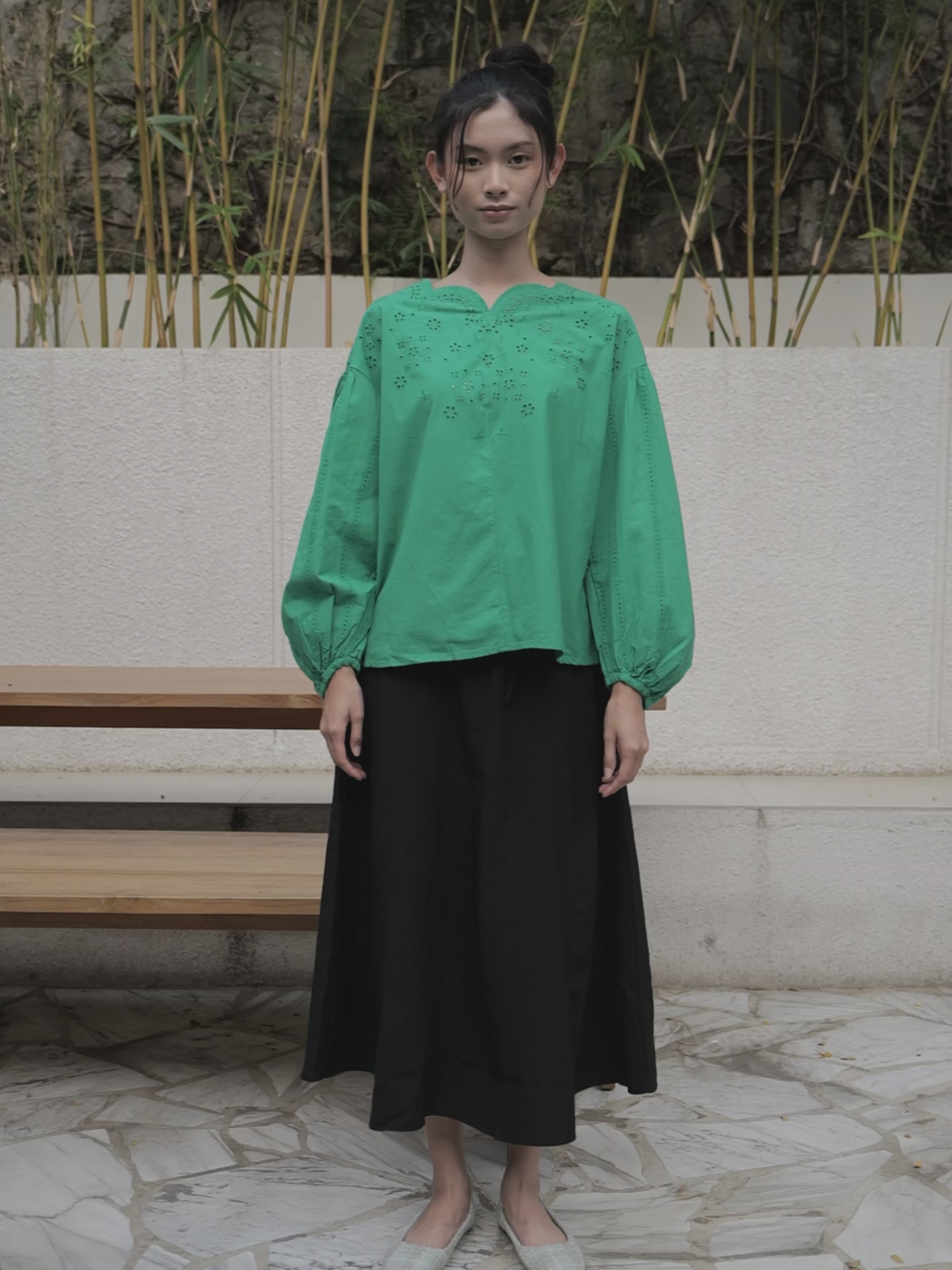 Atasan wanita ini di desain dengan model kerah terbuka serta aksen pattern lubang-lubang yang eye catching! Pada bagian ujung lengan terdapat karet sehingga memberikan volume pada bagian lengan. Padukan dengan celana maupun rok favorit kalian!