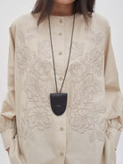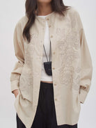 Blouse dengan detail bordir bunga di bagian depan yang memberi kesan feminin namun tetap elegan. Didesain dengan potongan longgar dan bahan katun lembut yang nyaman untuk dikenakan sehari-hari. Dilengkapi kancing depan dan lengan manset yang menambah sentuhan rapi dan manis pada tampilan.