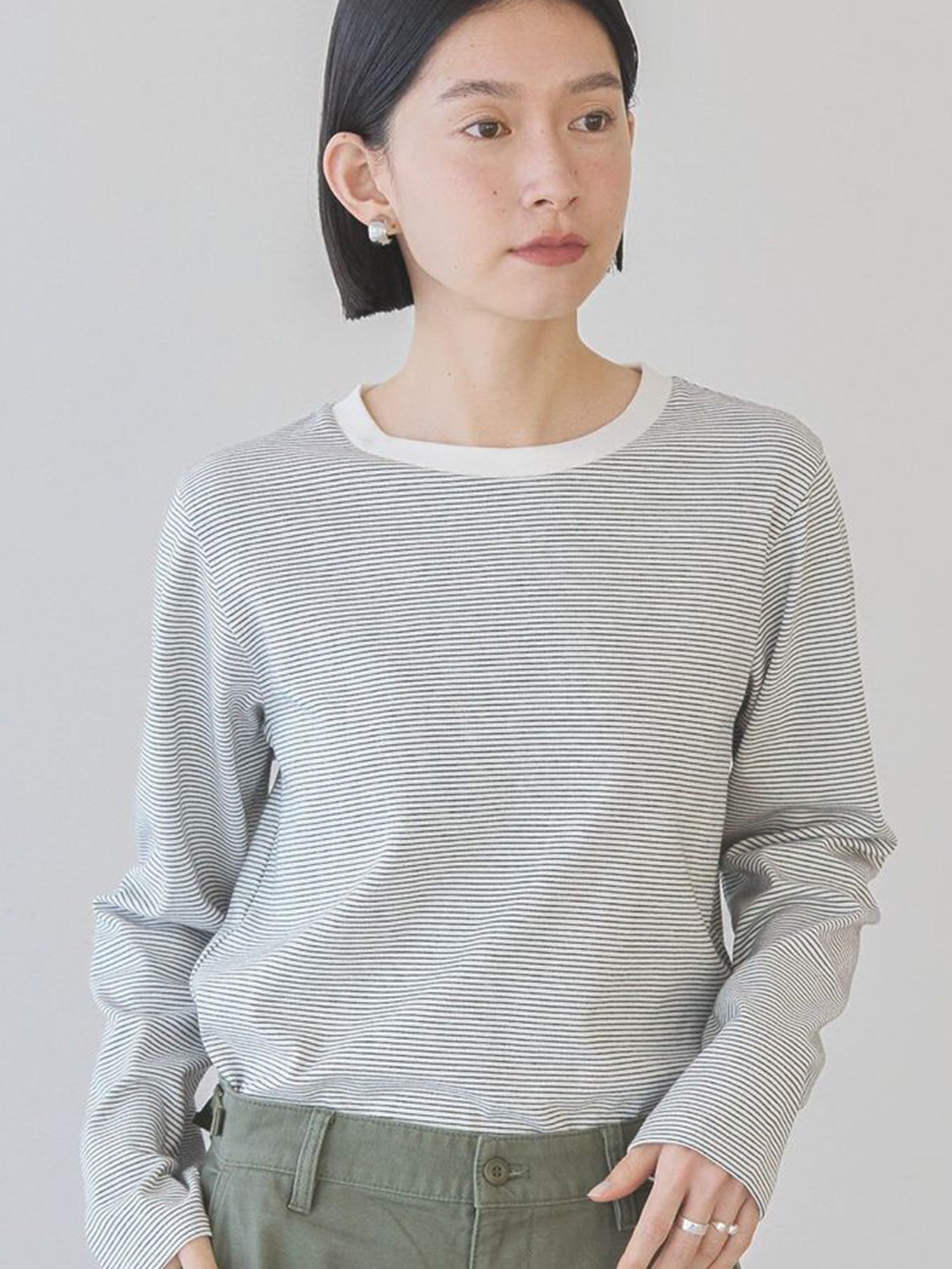 Long sleeve tee dengan motif garis-garis tipis dan potongan yang simpel, cocok untuk tampilan kasual sehari-hari. Detail kerah crew neck dengan warna kontras memberikan sentuhan playful yang subtle. Terbuat dari bahan katun 100% yang ringan dan nyaman untuk dikenakan seharian.